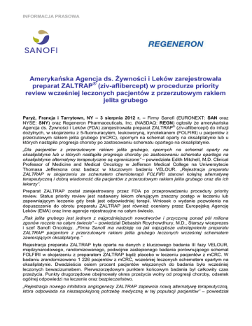 INFORMACJA PRASOWA Amerykańska Agencja ds. Żywności i Leków zarejestrowała preparat ZALTRAP® (ziv-aflibercept) w procedurze priority review wcześniej leczonych pacjentów z przerzutowym rakiem jelita grubego Paryż, Francja i Tarrytown, NY – 3 sierpnia 2012 r. – Firmy Sanofi (EURONEXT: SAN oraz NYSE: SNY) oraz Regeneron Pharmaceuticals, Inc. (NASDAQ: REGN) ogłosiły że amerykańska Agencja ds. Żywności i Leków (FDA) zarejestrowała preparat ZALTRAP® (ziv-aflibercept) do infuzji dożylnych, w skojarzeniu z 5-fluorouracylem, leukoworyną, irynotekanem (FOLFIRI) u pacjentów z przerzutowym rakiem jelita grubego (mCRC), opornym na schemat oparty na oksaliplatynie lub u których nastąpiła progresja choroby po zastosowaniu schematu opartego na oksaliplatynie. „Dla pacjentów z przerzutowym rakiem jelita grubego, opornych na schemat oparty na oksaliplatynie lub u których nastąpiła progresja choroby po zastosowaniu schematu opartego na oksaliplatynie alternatywy terapeutyczne są ograniczone” – powiedziała Edith Mitchell, M.D. Clinical Professor of Medicine and Medical Oncology w Jefferson Medical College na Uniwersytecie Thomasa Jeffersona oraz badacz w kluczowym badaniu VELOUR. „Rejestracja preparatu ZALTRAP w skojarzeniu ze schematem chemioterapii FOLFIRI stanowi kolejną alternatywę terapeutyczną i dobrą wiadomość dla pacjentów z przerzutowym rakiem jelita grubego oraz dla ich lekarzy”. Preparat ZALTRAP został zarejestrowany przez FDA po przeprowadzeniu procedury priority review. Status priority review jest nadawany lekom oferującym znaczny postęp w leczeniu lub zapewniającym leczenie gdy brak jest odpowiedniej terapii. Wniosek o wydanie pozwolenia na dopuszczenie do obrotu preparatu ZALTRAP jest również oceniany przez Europejską Agencję Leków (EMA) oraz inne agencje rejestracyjne na całym świecie. „Rak jelita grubego jest jednym z najgroźniejszych nowotworów i przyczyną ponad pół miliona zgonów rocznie na całym świecie” – powiedział Debasish Roychowdhury, M.D., Starszy wiceprezes i szef Sanofi Oncology. „Firma Sanofi ma nadzieję na jak najszybsze udostępnienie preparatu ZALTRAP pacjentom z przerzutowym rakiem jelita grubego leczonych wcześniej schematem zawierającym oksaliplatynę.” Rejestracja preparatu ZALTRAP była oparta na danych z kluczowego badania III fazy VELOUR, międzynarodowego, randomizowanego, podwójnie zaślepionego badania porównującego schemat FOLFIRI w skojarzeniu z preparatem ZALTRAP bądź placebo w leczeniu pacjentów z mCRC. W badaniu zrandomizowano 1 226 pacjentów z mCRC, wcześniej leczonych schematem opartym na oksaliplatynie. Dwadzieścia osiem procent pacjentów włączonych do badania było wcześniej leczonych bewacizumabem. Pierwszorzędowym punktem końcowym badania był całkowity czas przeżycia. Punkty drugorzędowe obejmowały okres przeżycia wolny od progresji choroby, odsetek ogólnej odpowiedzi na leczenie oraz bezpieczeństwo. „Rejestracja nowego inhibitora angiogenezy ZALTRAP zapewnia nową alternatywę terapeutyczną, która odpowiada na niezaspokojoną potrzebę medyczną w tej populacji pacjentów” – powiedział George D. Yancopoulos, M.D., Ph.D., Dyrektor ds. naukowych w firmie Regeneron oraz Prezes Regeneron Research Laboratories. „Wciąż jednak istnieje konieczność opracowania nowych leków przeciwnowotworowych. Firmy Regeneron oraz Sanofi będą w dalszym ciągu angażować swoje zasoby w celu odkrycia nowych eksperymentalnych leków oraz kombinacji”. Wyniki badania VELOUR Wyniki badania VELOUR wskazały, że u pacjentów leczonych wcześniej schematem opartym na oksaliplatynie, dodanie preparatu ZALTRAP do schematu FOLFIRI znamiennie poprawia medianę okresu przeżycia z 12,06 miesięcy do 13,50 miesięcy (HR=0,817 (95% CI 0,714 do 0,935; p=0,0032), co stanowi względne zmniejszenie ryzyka o 18%. Obserwowano również znamienne wydłużenie okresu przeżycia bez progresji choroby z 4,67 miesięcy do 6,90 miesięcy (HR=0,758 95% CI 0,661 do 0,869; p=0,00007), co stanowi względne zmniejszenie ryzyka o 24%. Odsetek ogólnej odpowiedzi na leczenie w grupie przyjmującej preparat ZALTRAP ze schematem FOLFIRI wynosił 19,8% w porównaniu z 11,1% w grupie leczonej schematem FOLFIRI (p=0,0001). Do najczęściej występujących działań niepożądanych (wszystkie stopnie, częstość występowania ≥20%), zgłaszanych z większą częstością (różnica co najmniej o 2% pomiędzy grupami) w grupie przyjmującej ZALTRAP/FOLFIRI, według malejącej częstości, należały leukopenia, biegunka, neutropenia, białkomocz, podwyższona aktywność AST, zapalenie jamy ustnej, zmęczenie, małopłytkowość, podwyższona aktywność ALT, nadciśnienie, zmniejszenie masy ciała, zmniejszenie apetytu, krwawienie z nosa, ból brzucha, dysfonia, podwyższone stężenie kreatyniny w osoczu oraz bóle głowy. Do najczęstszych działań niepożądanych 3-4 stopnia (≥5%), zgłaszanych z większą częstością (różnica co najmniej o 2% pomiędzy grupami) w grupie przyjmującej ZALTRAP/FOLFIRI, według malejącej częstości, należały neutropenia, biegunka, nadciśnienie, leukopenia, zapalenie jamy ustnej, zmęczenie, białkomocz oraz osłabienie. Informacje na temat preparatu ZALTRAP® (ziv-aflibercept) do infuzji dożylnych Preparat ZALTRAP to rekombinowane białko fuzyjne, działające jako rozpuszczalny receptor, wiążące się z czynnikiem wzrostu śródbłonka naczyniowego-A (Vascular Endothelial Growth Factor-A, VEGF-A), czynnikiem wzrostu śródbłonka naczyniowego-B (VEGF-B) oraz łożyskowym czynnikiem wzrostu (PIGF). Hamowanie tych czynników może prowadzić do zmniejszonej neowaskularyzacji oraz zmniejszonej przepuszczalności naczyń. Firma Sanofi planuje udostępnienie preparatu ZALTRAP w Stanach Zjednoczonych w trzecim kwartale 2012 roku. Zgodnie z warunkami umowy o współpracy, firmy Sanofi oraz Regeneron po równo dzielą globalne zyski z preparatu 
