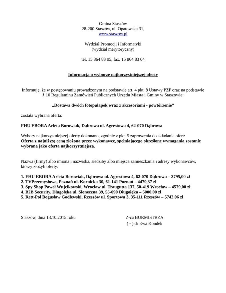 Gmina Staszów 28-200 Staszów, ul. Opatowska 31, www.staszow.pl Wydział Promocji i Informatyki (wydział merytoryczny) tel. 15 864 83 05, fax. 15 864 83 04 Informacja o wyborze najkorzystniejszej oferty Informuję, że w postępowaniu prowadzonym na podstawie art. 4 pkt. 8 Ustawy PZP oraz na podstawie § 10 Regulaminu Zamówień Publicznych Urzędu Miasta i Gminy w Staszowie: „Dostawa dwóch fotopułapek wraz z akcesoriami - powtórzenie” została wybrana oferta: FHU EBORA Arleta Borowiak, Dąbrowa ul. Agrestowa 4, 62-070 Dąbrowa Wybory najkorzystniejszej oferty dokonano, zgodnie z pkt. 5 zaproszenia do składania ofert: Oferta z najniższą ceną złożona przez wykonawcę, spełniającego określone wymagania zostanie wybrana jako oferta najkorzystniejsza. Nazwa (firmy) albo imiona i nazwiska, siedziby albo miejsca zamieszkania i adresy wykonawców, którzy złożyli oferty: 1. FHU EBORA Arleta Borowiak, Dąbrowa ul. Agrestowa 4, 62-070 Dąbrowa – 3795,00 zł 2. TVPrzemysłowa, Poznań ul. Kornicka 30, 61-141 Poznań – 4479,37 zł 3. Spy Shop Paweł Wujcikowski, Wrocław ul. Traugutta 137, 50-419 Wrocław – 4579,00 zł 4. B2B Security, Długołęka ul. Słoneczna 39, 55-090 Długołęka – 5000,00 zł 5. Rett-Pol Bogusław Godlewski, Rzeszów ul. Sportowa 3, 35-111 Rzeszów – 5742,06 zł Staszów, dnia 13.10.2015 roku Z-ca BURMISTRZA ( - ) dr Ewa Kondek