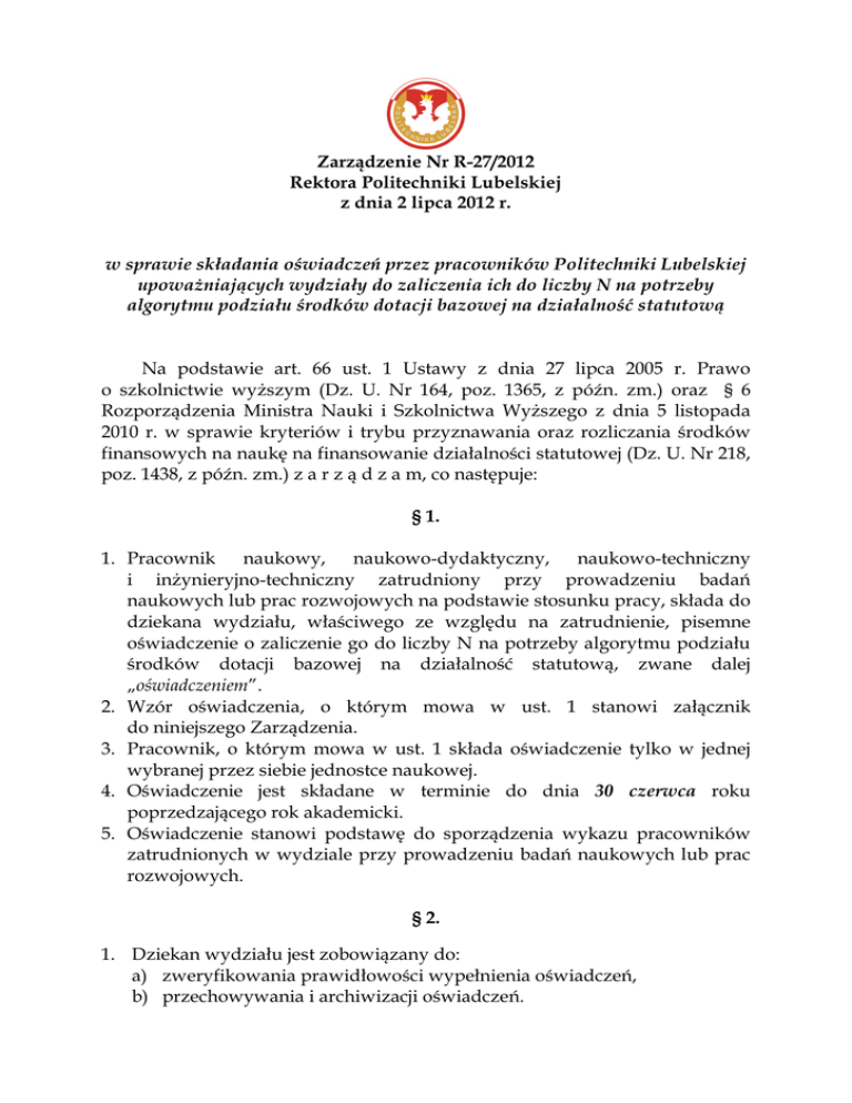 Zarządzenie Nr R-27/2012 Rektora Politechniki Lubelskiej z dnia 2 lipca 2012 r. w sprawie składania oświadczeń przez pracowników Politechniki Lubelskiej upoważniających wydziały do zaliczenia ich do liczby N na potrzeby algorytmu podziału środków dotacji bazowej na działalność statutową Na podstawie art. 66 ust. 1 Ustawy z dnia 27 lipca 2005 r. Prawo o szkolnictwie wyższym (Dz. U. Nr 164, poz. 1365, z późn. zm.) oraz § 6 Rozporządzenia Ministra Nauki i Szkolnictwa Wyższego z dnia 5 listopada 2010 r. w sprawie kryteriów i trybu przyznawania oraz rozliczania środków finansowych na naukę na finansowanie działalności statutowej (Dz. U. Nr 218, poz. 1438, z późn. zm.) z a r z ą d z a m, co następuje: § 1. 1. Pracownik naukowy, naukowo-dydaktyczny, naukowo-techniczny i inżynieryjno-techniczny zatrudniony przy prowadzeniu badań naukowych lub prac rozwojowych na podstawie stosunku pracy, składa do dziekana wydziału, właściwego ze względu na zatrudnienie, pisemne oświadczenie o zaliczenie go do liczby N na potrzeby algorytmu podziału środków dotacji bazowej na działalność statutową, zwane dalej „oświadczeniem”. 2. Wzór oświadczenia, o którym mowa w ust. 1 stanowi załącznik do niniejszego Zarządzenia. 3. Pracownik, o którym mowa w ust. 1 składa oświadczenie tylko w jednej wybranej przez siebie jednostce naukowej. 4. Oświadczenie jest składane w terminie do dnia 30 czerwca roku poprzedzającego rok akademicki. 5. Oświadczenie stanowi podstawę do sporządzenia wykazu pracowników zatrudnionych w wydziale przy prowadzeniu badań naukowych lub prac rozwojowych. § 2. 1. Dziekan wydziału jest zobowiązany do: a) zweryfikowania prawidłowości wypełnienia oświadczeń, b) przechowywania i archiwizacji oświadczeń. 2. Wydziały, jako jednostki naukowe Uczelni, są odpowiedzialne za sporządzenie wykazu pracowników zatrudnionych w wydziale przy prowadzeniu badań naukowych lub prac rozwojowych na dany rok akademicki. § 3. Kserokopie oświadczeń, poświadczone za zgodność z oryginałem przez dziekana wydziału są przekazywane corocznie, w terminie do dnia 10 lipca roku poprzedzającego rok akademicki, do Biura Współpracy z Zagranicą i Badań Naukowych. § 4. Nadzór nad prawidłowością i terminowością przeprowadzenia procedury zbierania oświadczeń sprawuje dziekan wydziału. § 5. Zarządzenie wchodzi w życie z dniem podpisania. Rektor Prof. dr hab. inż. Marek Opielak Załącznik do Zarządzenia Nr R-27/2012 Rektora Politechniki Lubelskiej z dnia 2 lipca 2012 r. .................................................................................... Imię i nazwisko .................................................................................... Tytuł/ stopień naukowy ..................................................................................... Miejsce zatrudnienia (Wydział /inna jednostka) OŚWIADCZENIE 1. Oświadczam, że jestem zatrudniony/a w Politechnice Lubelskiej na podstawie*: − mianowania − umowy o pracę w pełnym wymiarze czasu pracy należy podać wymiar − umowy o pracę w niepełnym wymiarze czasu pracy 1 2 1 3 1 4 inny (jaki?) ......................... 2. Oświadczam, że jestem zatrudniony/a w Politechnice Lubelskiej na podstawie stosunku pracy przy prowadzeniu badań naukowych lub prac rozwojowych jako*: − pracownik naukowy − pracownik naukowo-dydaktyczny − pracownik naukowo-techniczny − pracownik inżynieryjno-techniczny * odpowiednio zaznaczyć X 3. Wyrażam zgodę/nie wyrażam zgody* na zaliczenie mnie do liczby N na potrzeby algorytmu podziału środków dotacji bazowej na działalność statutową na Wydziale .................................................................................................................... * niepotrzebne skreślić 4. Informuję, że złożyłem/łam oświadczenie w sprawie zaliczenia mnie do liczby N na potrzeby algorytmu podziału środków dotacji bazowej na działalność statutową w ..................................................................................................................... ............................................................................................................................................................................... nazwa jednostki naukowej poza Politechniką Lubelską ....................................................... Miejscowość, data .................................................................. Czytelny podpis pracownika składającego oświadczenie