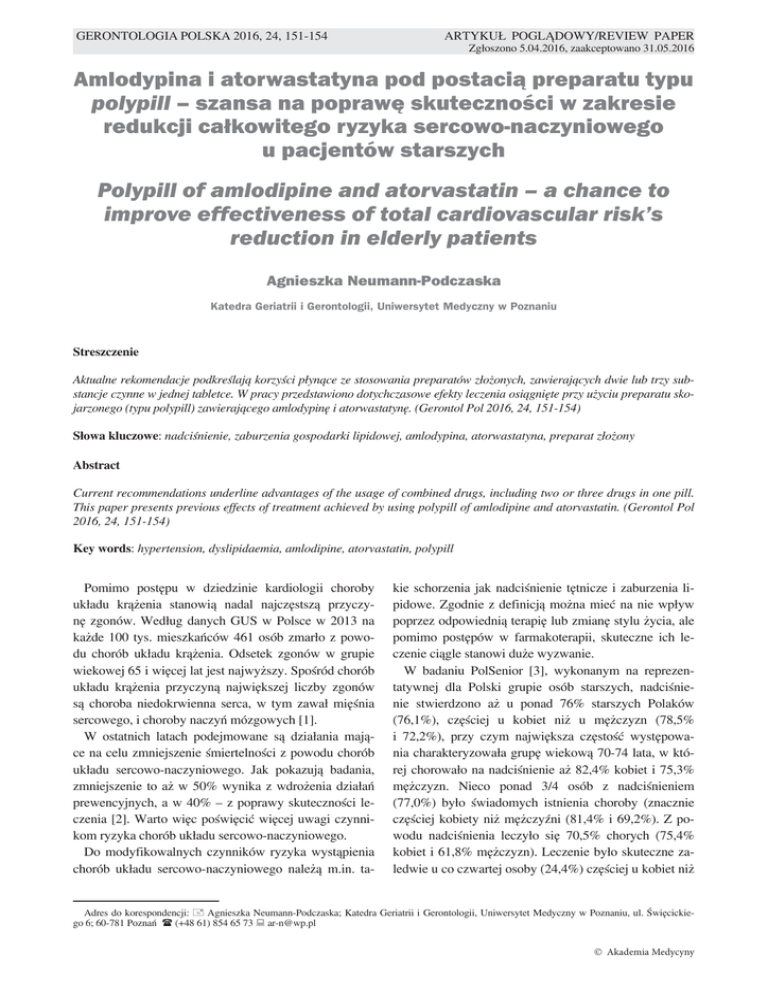 GERONTOLOGIA POLSKA 2016, 24, 151-154 ARTYKUŁ POGLĄDOWY/REVIEW PAPER Zgłoszono 5.04.2016, zaakceptowano 31.05.2016 Amlodypina i atorwastatyna pod postaci¹ preparatu typu polypill – szansa na poprawê skutecznoœci w zakresie redukcji ca³kowitego ryzyka sercowo-naczyniowego u pacjentów starszych Polypill of amlodipine and atorvastatin – a chance to improve effectiveness of total cardiovascular risk’s reduction in elderly patients Agnieszka Neumann-Podczaska Katedra Geriatrii i Gerontologii, Uniwersytet Medyczny w Poznaniu Streszczenie Aktualne rekomendacje podkreślają korzyści płynące ze stosowania preparatów złożonych, zawierających dwie lub trzy substancje czynne w jednej tabletce. W pracy przedstawiono dotychczasowe efekty leczenia osiągnięte przy użyciu preparatu skojarzonego (typu polypill) zawierającego amlodypinę i atorwastatynę. (Gerontol Pol 2016, 24, 151-154) Słowa kluczowe: nadciśnienie, zaburzenia gospodarki lipidowej, amlodypina, atorwastatyna, preparat złożony Abstract Current recommendations underline advantages of the usage of combined drugs, including two or three drugs in one pill. This paper presents previous effects of treatment achieved by using polypill of amlodipine and atorvastatin. (Gerontol Pol 2016, 24, 151-154) Key words: hypertension, dyslipidaemia, amlodipine, atorvastatin, polypill Pomimo postępu w dziedzinie kardiologii choroby układu krążenia stanowią nadal najczęstszą przyczynę zgonów. Według danych GUS w Polsce w 2013 na każde 100 tys. mieszkańców 461 osób zmarło z powodu chorób układu krążenia. Odsetek zgonów w grupie wiekowej 65 i więcej lat jest najwyższy. Spośród chorób układu krążenia przyczyną największej liczby zgonów są choroba niedokrwienna serca, w tym zawał mięśnia sercowego, i choroby naczyń mózgowych [1]. W ostatnich latach podejmowane są działania mające na celu zmniejszenie śmiertelności z powodu chorób układu sercowo-naczyniowego. Jak pokazują badania, zmniejszenie to aż w 50% wynika z wdrożenia działań prewencyjnych, a w 40% – z poprawy skuteczności leczenia [2]. Warto więc poświęcić więcej uwagi czynnikom ryzyka chorób układu sercowo-naczyniowego. Do modyfikowalnych czynników ryzyka wystąpienia chorób układu sercowo-naczyniowego należą m.in. ta- kie schorzenia jak nadciśnienie tętnicze i zaburzenia lipidowe. Zgodnie z definicją można mieć na nie wpływ poprzez odpowiednią terapię lub zmianę stylu życia, ale pomimo postępów w farmakoterapii, skuteczne ich leczenie ciągle stanowi duże wyzwanie. W badaniu PolSenior [3], wykonanym na reprezentatywnej dla Polski grupie osób starszych, nadciśnienie stwierdzono aż u ponad 76% starszych Polaków (76,1%), częściej u kobiet niż u mężczyzn (78,5% i 72,2%), przy czym największa częstość występowania charakteryzowała grupę wiekową 70-74 lata, w której chorowało na nadciśnienie aż 82,4% kobiet i 75,3% mężczyzn. Nieco ponad 3/4 osób z nadciśnieniem (77,0%) było świadomych istnienia choroby (znacznie częściej kobiety niż mężczyźni (81,4% i 69,2%). Z powodu nadciśnienia leczyło się 70,5% chorych (75,4% kobiet i 61,8% mężczyzn). Leczenie było skuteczne zaledwie u co czwartej osoby (24,4%) częściej u kobiet niż Adres do korespondencji: Agnieszka Neumann-Podczaska; Katedra Geriatrii i Gerontologii, Uniwersytet Medyczny w Poznaniu, ul. Święcickiego 6; 60-781 Poznań (+48 61) 854 65 73 [email protected] Akademia Medycyny 152 AGNIESZKA NEUMANN-PODCZASKA u mężczyzn (26,2% i 20,5%). Przyznać jednak trzeba, że odsetek osób leczonych skutecznie w badaniu PolSenior jest i tak dwukrotnie wyższy niż w badaniach wcześniejszych (NATPOL i WOBASZ), co wskazuje na efektywność podejmowanych działań edukacyjnych. Niestety nie ma dostępnych danych polskich z badań wykonanych na reprezentacyjnej grupie osób starszych dotyczących podejmowanego leczenia i jego skuteczności w przypadku współistnienia nadciśnienia i zaburzeń gospodarki lipidowej. Jednak na podstawie badania NHANES wykonanego na grupie reprezentatywnej dla całej populacji USA (National Health and Nutrition Examination Survey [4] pokazano, że leczonych było zaledwie 28,5% osób z tymi dwoma patologiami – częściej kobiety niż u mężczyźni (29,5% i 27,2%), a leczenie było skuteczne zaledwie u 9% chorych; skuteczniej byli leczeni mężczyźni (11,7% i 6,9%). Podatność chorych starszych na zalecenia dotyczące stosowanego leczenia Jednym z typowych problemów klinicznych specyficznych dla chorych starszych jest jatrogenny zespół geriatryczny, czyli zespół objawów będących wynikiem stosowanej farmakoterapii. Wśród jego najważniejszych przyczyn wymienia się zarówno wielolekowość, jak i czynnik zależny od pacjenta, czyli problem z podatnością na zalecenia dotyczące stosowanego leczenia (ang. compliance). Jeśli chodzi o niską podatność na zalecenia to problem ten obejmuje m.in. ominięcie dawki lub celowe bądź omyłkowe zastosowanie niewłaściwego schematu dawkowania, nieprawidłowe przygotowywanie postaci leków, ale też np. przedwczesne przerywanie terapii. Przyczynia się do tego m.in. przewlekły charakter wielu schorzeń występujących u osób starszych i stąd konieczność stosowania leczenia przez dłuższy czas (często do końca życia), co w rzeczywistości jest codziennym testem dla wytrwałości terapeutycznej pacjentów (ang. persistence). Rozpatrując przyczyny niskiej podatności i wytrwałości terapeutycznej pacjentów starszych zwraca się uwagę, że obok czynników takich jak zaburzenia sprawności funkcjonalnej (w tym np. zaburzenia pamięci, niepełnosprawność ruchowa) czy wysoki koszt leków, szczególnie istotnym parametrem decydującym o nieprzestrzeganiu schematu terapii jest wzrost liczby tabletek przyjmowanych w ciągu dnia. Udowodniono, że przy 0-1 leków stosowanych dobowo względna szansa na utrzymanie leczenia wynosi 1 i spada 