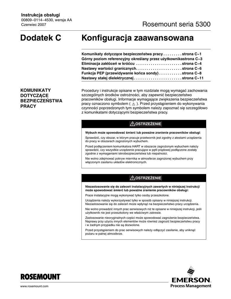 Instrukcja obsługi 00809−0114−4530, wersja AA Czerwiec 2007 Dodatek C Rosemount seria 5300 Konfiguracja zaawansowana Komunikaty dotyczące bezpieczeństwa pracy . . . . . . . . . strona C−1 Górny poziom referencyjny określany przez użytkownikastrona C−3 Eliminacja zakłóceń w króćcu . . . . . . . . . . . . . . . . . . . . . . strona C−4 Nastawy wartości granicznych. . . . . . . . . . . . . . . . . . . . . . strona C−6 Funkcja PEP (przewidywanie końca sondy) . . . . . . . . . . . strona C−8 Nastawy stałej dielektrycznej . . . . . . . . . . . . . . . . . . . . . . . strona C−11 KOMUNIKATY DOTYCZĄCE BEZPIECZEŃSTWA PRACY Procedury i instrukcje opisane w tym rozdziale mogą wymagać zachowania szczególnych środków ostrożności, aby zapewnić bezpieczeństwo pracowników obsługi. Informacje wymagające zwiększenia bezpieczeństwa pracy oznaczono symbolem ( ). Przed przystąpieniem do wykonywania czynności poprzedzonych tym symbolem należy zapoznać się szczegółowo z komunikatami dotyczącymi bezpieczeństwa pracy. OSTRZEŻENIE Wybuch może spowodować śmierć lub poważne zranienie pracowników obsługi: Sprawdzić, czy obszar, w którym pracuje przetwornik jest zgodny z atestami urządzenia do pracy w obszarach zagrożonych wybuchem. Przed podłączeniem komunikatora HART w obszarze zagrożonym wybuchem należy sprawdzić, czy wszystkie urządzenie pracujące w pętli prądowej podłączone zostały zgodnie z wymaganiami iskrobezpieczeństwa lub niepalności. Nie wolno zdejmować pokryw miernika w atmosferze zagrożonej wybuchem przy włączonym zasilaniu układów elektronicznych. OSTRZEŻENIE Niezastosowanie się do zaleceń instalacyjnych zawartych w niniejszej instrukcji może spowodować śmierć lub poważne zranienie pracowników obsługi: Prace instalacyjne mogą wykonywać tylko osoby przeszkolone. Urządzenia należy wykorzystywać tylko w sposób opisany w niniejszej instrukcji. Niezastosowanie się do zaleceń może wpłynąć na bezpieczeństwo pracy urządzenia. Nie wolno prowadzić innych prac serwisowych niż te opisane w niniejszej instrukcji, jeśli użytkownik nie jest przeszkolony we właściwym zakresie. Zastosowanie nieoryginalnych części może spowodować zagrożenie bezpieczeństwa. Naprawy przy użyciu innych elementów może również zagrozić bezpieczeństwu pracy i w żadnym przypadku nie są dozwolone. Przed przystąpieniem do prac serwisowych należy odłączyć zasilanie, aby uniknąć pożaru w palnej atmosferze. www.rosemount.com Instrukcja obsługi Rosemount seria 5300 00809−0114−4530, wersja AA Czerwiec 2007 OSTRZEŻENIE Porażenie elektryczne może spowodować śmierć lub poważne zranienie pracowników.: Nie wolno dotykać odizolowanych przewodów i zacisków. Przed podłączeniem wyświetlacza należy upewnić się, że zasilanie przetwornika 5300 jest wyłączone, a wszystkie przewody zasilania zewnętrznego odłączone lub niezasilone. Sondy pokryte plastikiem i/lub z plastikowymi dyskami mogą gromadzić ładunki elektrostatyczne prowadzące do zagrożenia zapłonem w określonych warunkach. Tak więc, gdy sonda jest wykorzystywana w atmosferze zagrożonej wybuchem, należy podjąć właściwe środki zapobiegające wyładowaniu ładunków elektrostatycznych. C−2 Instrukcja obsługi 00809−0114−4530, wersja AA Czerwiec 2007 GÓRNY POZIOM ODNIESIENIA OKREŚLANY PRZEZ UŻYTKOWNIKA Rosemount seria 5300 Górny poziom odniesienia (Upper Reference Point) inny niż standardowy poziom odniesienia przetwornika (Transmitter Reference Point) może być określony przez nastawę parametru Calibration Offset (przesunięcie poziomu stałego kalibracji) w sposób przedstawiony na ilustracji C−1: Ilustracja C−1. Górny poziom odniesienia może być określony przez parametr Distance Offset. Górny poziom referencyjny Poziom odniesienia przetwornika Wysokość zbiornika Poziom produktu REFPOINT_USER_5300.EPS Przesunięcie poziomu stałego odległości W celu nastawy górnego poziomu odniesienia należy wykonać poniższą procedurę: 1. Parametrowi Tank Height (wysokość zbiornika) nadać wartość odległości między dnem zbiornika a żądanym Upper Reference Point (górnym poziomem odniesienia). 2. Dodać odległość między Upper Reference Point a Transmitter Reference Point (poziomem odniesienia przetwornika) do wartości Distance Offset (przesunięcie poziomu stałego odległości) przechowywanej w bazie danych przetwornika. Przy użyciu komunikatora 275/375 parametr Distance Offset jest dostępny po wykonaniu skrótu klawiszowego [2, 3, 2] lub [2, 1, 3]. Parameter FOUNDATIONTM fieldbus: TRANSDUCER 1100>GEOM_OFFSET_DIST. Parametr Distance Offset jest dostępny także w programie RRM: a. Kliknąć ikonę Tank (zbiornik) w Device Config/Setup w programie RRM. b. W oknieTank, wybrać zakładkę Geometry (geometria). c. Kliknąć przycisk Advanced (zaawansowane). C−3 Instrukcja obsługi Rosemount seria 5300 ELIMINACJA ZAKŁÓCEŃ W KRÓĆCU 00809−0114−4530, wersja AA Czerwiec 2007 Wykorzystanie funkcji Trim Near Zone (kalibracja cyfrowa w strefie bliskiej) W przypadku falowodowych przetworników radarowych dokładność pomiarów w strefie bliskiej (Near Zone) (obszar w zakresie od 0 do 0,25 m poniżej górnego poziomu odniesienia) jest ograniczona. Jednakże przetwornik 5300 jest wyposażony w funkcje programowe minimalizujące górną strefę martwą. Nastawy fabryczne są zazwyczaj wystarczające i nie muszą być zmieniane po instalacji. Mimo, że nastawy są optymalizowane w zależności od aktualnej instalacji, może zajść konieczność dalszej kalibracji cyfrowej w przypadku niekorzystnych warunków. Taka sytuacja może mieć miejsce w przypadku sondy jednoprzewodowej zamontowanej w małej dyszy lub gdy w strefie bliskiej znajdują się obiekty zakłócające pomiary. Kalibracja cyfrowa umożliwia uzyskanie założonej jakości pomiarów w strefie bliskiej w tego typu warunkach oraz zabezpiecz