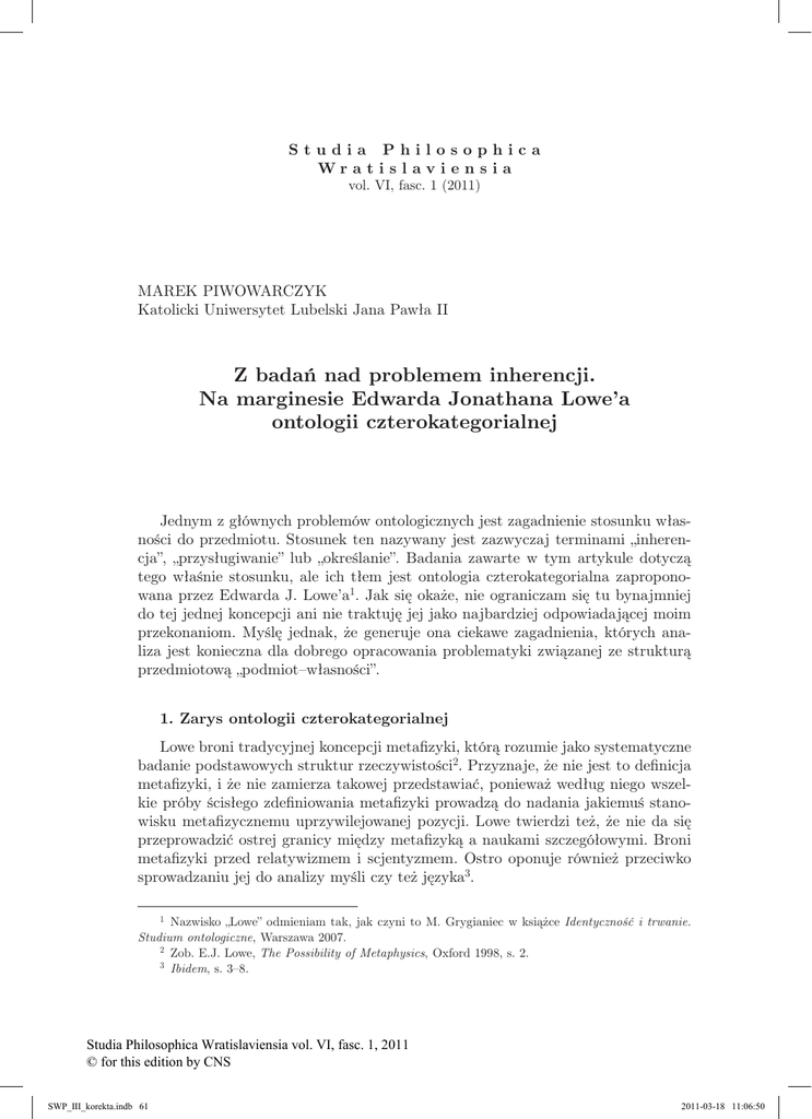 Studia Philosophica Wr a t i s l av i e n s i a vol. VI, fasc. 1 (2011) MAREK PIWOWARCZYK Katolicki Uniwersytet Lubelski Jana Pawła II Z badań nad problemem inherencji. Na marginesie Edwarda Jonathana Lowe’a ontologii czterokategorialnej Jednym z głównych problemów ontologicznych jest zagadnienie stosunku własności do przedmiotu. Stosunek ten nazywany jest zazwyczaj terminami „inherencja”, „przysługiwanie” lub „określanie”. Badania zawarte w tym artykule dotyczą tego właśnie stosunku, ale ich tłem jest ontologia czterokategorialna zaproponowana przez Edwarda J. Lowe’a1. Jak się okaże, nie ograniczam się tu bynajmniej do tej jednej koncepcji ani nie traktuję jej jako najbardziej odpowiadającej moim przekonaniom. Myślę jednak, że generuje ona ciekawe zagadnienia, których analiza jest konieczna dla dobrego opracowania problematyki związanej ze strukturą przedmiotową „podmiot–własności”. 1. Zarys ontologii czterokategorialnej Lowe broni tradycyjnej koncepcji metafizyki, którą rozumie jako systematyczne badanie podstawowych struktur rzeczywistości2. Przyznaje, że nie jest to definicja metafizyki, i że nie zamierza takowej przedstawiać, ponieważ według niego wszelkie próby ścisłego zdefiniowania metafizyki prowadzą do nadania jakiemuś stanowisku metafizycznemu uprzywilejowanej pozycji. Lowe twierdzi też, że nie da się przeprowadzić ostrej granicy między metafizyką a naukami szczegółowymi. Broni metafizyki przed relatywizmem i scjentyzmem. Ostro oponuje również przeciwko sprowadzaniu jej do analizy myśli czy też języka3. 1 Nazwisko „Lowe” odmieniam tak, jak czyni to M. Grygianiec w książce Identyczność i trwanie. Studium ontologiczne, Warszawa 2007. 2 Zob. E.J. Lowe, The Possibility of Metaphysics, Oxford 1998, s. 2. 3 Ibidem, s. 3–8. Studia Philosophica Wratislaviensia vol. VI, fasc. 1, 2011 © for this edition by CNS SWP_III_korekta.indb 61 2011-03-18 11:06:50 M. Piwowarczyk, Z badań nad problemem inherencji 62 Sercem metafizyki jest wedle Lowe’a ontologia, nazywana także nauką o bycie4. Ontologia zawiera część czysto aprioryczną oraz empiryczno-aprioryczną. Pierwsza dotyczy dziedziny metafizycznych możliwości: jest poszukiwaniem tego, jakie kategorie bytów (w szerokim sensie tego słowa; entities) mogą istnieć, czy też lepiej: współistnieć, tworząc możliwy świat. W części empiryczno-apriorycznej bada się, jakie kategorie bytów rzeczywiście istnieją w świecie aktualnym. Druga część ontologii zależy od pierwszej: aby powiedzieć, co istnieje, trzeba wiedzieć, co może istnieć, ponieważ dla Lowe’a świadectwo empiryczne jest świadectwem istnienia czegoś, co jest uprzednio możliwe. Samo doświadczenie nie jest w stanie poinformować nas o tym, co jest aktualne, niezależnie od apriorycznie uzyskanej wiedzy o możliwościach. Wydaje się, że zgodnie z tą koncepcją doświadczenia, spełnia ono jedynie funkcję pozwalającą przeprowadzić granicę między możliwościami, tj. między możliwościami niezrealizowanymi a zrealizowanymi5. Zgodnie z tym, co powiedziano, sercem ontologii jest teoria kategorii6. Kategorie ontologiczne są rodzajami wyróżnionymi ze względu na warunki istnienia i identyczności bytów do nich należących7. Różnice kategorialne między bytami to różnice co do warunków ich istnienia i identyczności. Warunki te można poznać jedynie a priori. Słowo „rodzaj” odniesione do kategorii należy według Lowe’a rozumieć szeroko i nie wolno kategorii mylić z tak zwanymi rodzajami naturalnymi. Kategoriami są na przykład: substancja, własność, zdarzenie, ale nie: człowiek, złoto, ssak. Te ostatnie są rodzajami naturalnymi i mogą być odkryte i określone jedynie a posteriori8. Sugeruje to, że Lowe ogranicza badania z dziedziny teorii kategorii do badań, które Ingarden nazwałby egzystencjalno- i formalno-ontologicznymi, przenosząc rozważania materialno-ontologiczne poza sferę poznania apriorycznego. Tak jednak nie jest i to dlatego, że kategorie wyróżnione są też ze względu na warunki identyczności bytów, a te nie mogą być czysto formalne i egzystencjalne. Jedną z kategorii wyróżnionych przez Lowe’a jest na przykład kategoria organizmu, która musi być scharakteryzowana również materialnie. Oczywiście rodzaje naturalne należą do pewnych kategorii, na przykład rodzaj zwierzę jest specyfikacją kategorii organizm, a rodzaj złoto kategorii materiał, ale specyfikacja ta nie polega na podziale kategorii na nowe kategorie, to znaczy zasadą podziału nie są warunki istnienia i identyczności. Teoria kategorii to inaczej ontologia formalna. Zajmuje się ona właśnie wyróżnianiem kategorii ontologicznych i relacji formalnych (stąd jej nazwa) zachodzących między bytami należącymi do różnych kategorii9. Oczywiście nie każda relacja między bytami z różnych kategorii jest formalna, ale tylko taka, która jest zdeterminowana formą tych bytów. Przeprowadzając ontologiczne rozróżnienie 4 E.J. Lowe, The Four-Category Ontology, Oxford 2006, s. 3–4. Należy nadmienić, że w The Possibility of Metaphysics (s. 9) Lowe w ogóle odmawiał metafizykowi kompetencji stwierdzania istnienia. 6 E.J. Lowe, The Four-Category Ontology, s. 5. 7 Ibidem, s. 20. 8 Ibidem. 9 Ibidem, s. 69. 5 Studia Philosophica Wratislaviensia vol. VI, fasc. 1, 2011 © for this edition by CNS SWP_III_korekta.indb 62 2011-03-18 11:06:50 Studia Philosophica Wratislaviensia VI, 1 (2011) 63 między treścią i formą, Lowe za treść uważa byt, a za formę — pozycję tego bytu w systemie kategorii. Pozycja wyznacza możliwości i charakter powiązań danego bytu z bytami o odmiennej formie. Wydaje się, że na formę bytu po prostu składają się jego charakterystyki kategorialne, determinujące warunki jego istnienia i identyczności. Relacje formalne są zaś sposobami powiązań danego bytu z bytami z innych kategorii, wyzna