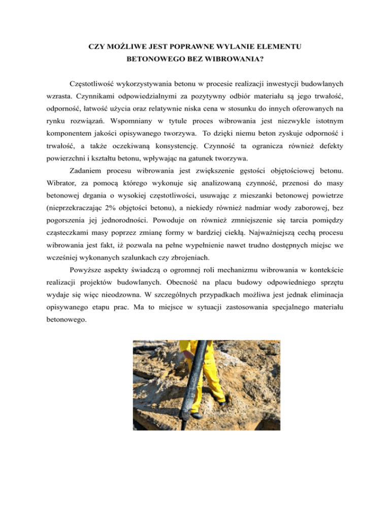 CZY MOŻLIWE JEST POPRAWNE WYLANIE ELEMENTU BETONOWEGO BEZ WIBROWANIA? Częstotliwość wykorzystywania betonu w procesie realizacji inwestycji budowlanych wzrasta. Czynnikami odpowiedzialnymi za pozytywny odbiór materiału są jego trwałość, odporność, łatwość użycia oraz relatywnie niska cena w stosunku do innych oferowanych na rynku rozwiązań. Wspomniany w tytule proces wibrowania jest niezwykle istotnym komponentem jakości opisywanego tworzywa. To dzięki niemu beton zyskuje odporność i trwałość, a także oczekiwaną konsystencję. Czynność ta ogranicza również defekty powierzchni i kształtu betonu, wpływając na gatunek tworzywa. Zadaniem procesu wibrowania jest zwiększenie gęstości objętościowej betonu. Wibrator, za pomocą którego wykonuje się analizowaną czynność, przenosi do masy betonowej drgania o wysokiej częstotliwości, usuwając z mieszanki betonowej powietrze (nieprzekraczając 2% objętości betonu), a niekiedy również nadmiar wody zaborowej, bez pogorszenia jej jednorodności. Powoduje on również zmniejszenie się tarcia pomiędzy cząsteczkami masy poprzez zmianę formy w bardziej ciekłą. Najważniejszą cechą procesu wibrowania jest fakt, iż pozwala na pełne wypełnienie nawet trudno dostępnych miejsc we wcześniej wykonanych szalunkach czy zbrojeniach. Powyższe aspekty świadczą o ogromnej roli mechanizmu wibrowania w kontekście realizacji projektów budowlanych. Obecność na placu budowy odpowiedniego sprzętu wydaje się więc nieodzowna. W szczególnych przypadkach możliwa jest jednak eliminacja opisywanego etapu prac. Ma to miejsce w sytuacji zastosowania specjalnego materiału betonowego. Beton compacton jest specyficznym produktem posiadających w swojej budowie domieszki chemiczne, dodane w odpowiednich proporcjach do mieszanki betonowej. Równocześnie zachowuje on wszystkie najważniejsze atuty standardowych mieszanek betonowych. Tak przygotowana zaprawa dostarczana jest na plac budowy w formie ciekłej. Umożliwia to wypełnienie wszystkich, nawet najmniejszych szczelin, oraz idealne przyleganie do wykonanych wcześniej stalowych zbrojeń konstrukcyjnych. Mieszanka jest samozagęszczalna co sprawia, że zastosowanie jej na placu budowy znacznie skraca czas położenia jak również wysychania użytego materiału, a tym samym ogranicza ramy czasowe realizacji całego projektu. W odróżnieniu od standardowych produktów, beton compacton pozwala na wykonanie zupełnie nietypowych kształtów danych konstrukcji. Powyższe cechy sprawiają, iż opisywany wariant staję się gratką dla architektów, projektujących coraz to odważniejsze konstrukcje.