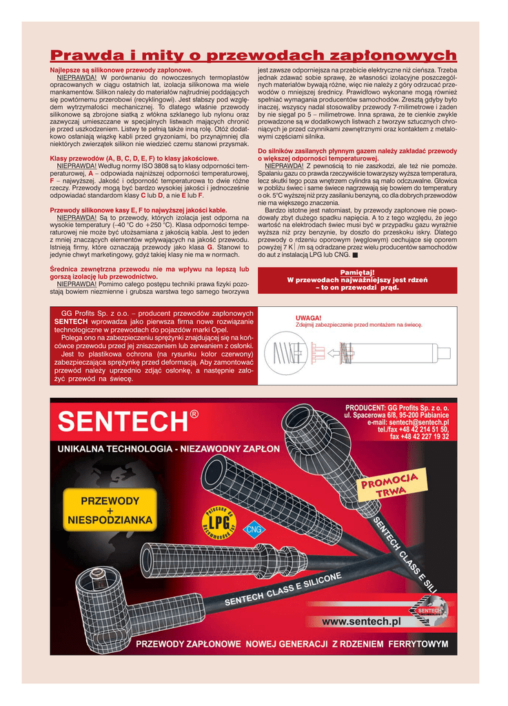 Prawda i mity o przewodach zap∏onowych Najlepsze sà silikonowe przewody zap∏onowe. NIEPRAWDA! W porównaniu do nowoczesnych termoplastów opracowanych w ciàgu ostatnich lat, izolacja silikonowa ma wiele mankamentów. Silikon nale˝y do materia∏ów najtrudniej poddajàcych si´ powtórnemu przerobowi (recyklingowi). Jest s∏abszy pod wzgl´dem wytrzyma∏oÊci mechanicznej. To dlatego w∏aÊnie przewody silikonowe sà zbrojone siatkà z w∏ókna szklanego lub nylonu oraz zazwyczaj umieszczane w specjalnych listwach majàcych chroniç je przed uszkodzeniem. Listwy te pe∏nià tak˝e innà rol´. Otó˝ dodatkowo os∏aniajà wiàzk´ kabli przed gryzoniami, bo przynajmniej dla niektórych zwierzàtek silikon nie wiedzieç czemu stanowi przysmak. Klasy przewodów (A, B, C, D, E, F) to klasy jakoÊciowe. NIEPRAWDA! Wed∏ug normy ISO 3808 sà to klasy odpornoÊci temperaturowej, A – odpowiada najni˝szej odpornoÊci temperaturowej, F – najwy˝szej. JakoÊç i odpornoÊç temperaturowa to dwie ró˝ne rzeczy. Przewody mogà byç bardzo wysokiej jakoÊci i jednoczeÊnie odpowiadaç standardom klasy C lub D, a nie E lub F. Przewody silikonowe kasy E, F to najwy˝szej jakoÊci kable. NIEPRAWDA! Sà to przewody, których izolacja jest odporna na wysokie temperatury (–40 °C do +250 °C). Klasa odpornoÊci temperaturowej nie mo˝e byç uto˝samiana z jakoÊcià kabla. Jest to jeden z mniej znaczàcych elementów wp∏ywajàcych na jakoÊç przewodu. Istniejà firmy, które oznaczajà przewody jako klasa G. Stanowi to jedynie chwyt marketingowy, gdy˝ takiej klasy nie ma w normach. Ârednica zewn´trzna przewodu nie ma wp∏ywu na lepszà lub gorszà izolacj´ lub przewodnictwo. NIEPRAWDA! Pomimo ca∏ego post´pu techniki prawa fizyki pozostajà bowiem niezmienne i grubsza warstwa tego samego tworzywa GG Profits Sp. z o.o. – producent przewodów zap∏onowych SENTECH wprowadza jako pierwsza firma nowe rozwiàzanie technologiczne w przewodach do pojazdów marki Opel. Polega ono na zabezpieczeniu spr´˝ynki znajdujàcej si´ na koƒcówce przewodu przed jej zniszczeniem lub zerwaniem z os∏onki. Jest to plastikowa ochrona (na rysunku kolor czerwony) zabezpieczajàca spr´˝ynk´ przed deformacjà. Aby zamontowaç przewód nale˝y uprzednio zdjàç os∏onk´, a nast´pnie za∏o˝yç przewód na Êwiec´. jest zawsze odporniejsza na przebicie elektryczne ni˝ cieƒsza. Trzeba jednak zdawaç sobie spraw´, ˝e w∏asnoÊci izolacyjne poszczególnych materia∏ów bywajà ró˝ne, wi´c nie nale˝y z góry odrzucaç przewodów o mniejszej Êrednicy. Prawid∏owo wykonane mogà równie˝ spe∏niaç wymagania producentów samochodów. Zresztà gdyby by∏o inaczej, wszyscy nadal stosowaliby przewody 7-milimetrowe i ˝aden by nie si´ga∏ po 5 – milimetrowe. Inna sprawa, ˝e te cienkie zwykle prowadzone sà w dodatkowych listwach z tworzyw sztucznych chroniàcych je przed czynnikami zewn´trznymi oraz kontaktem z metalowymi cz´Êciami silnika. Do silników zasilanych p∏ynnym gazem nale˝y zak∏adaç przewody o wi´kszej odpornoÊci temperaturowej. NIEPRAWDA! Z pewnoÊcià to nie zaszkodzi, ale te˝ nie pomo˝e. Spalaniu gazu co prawda rzeczywiÊcie towarzyszy wy˝sza temperatura, lecz skutki tego poza wn´trzem cylindra sà ma∏o odczuwalne. G∏owica w pobli˝u Êwiec i same Êwiece nagrzewajà si´ bowiem do temperatury o ok. 5°C wy˝szej ni˝ przy zasilaniu benzynà, co dla dobrych przewodów nie ma wi´kszego znaczenia. Bardzo istotne jest natomiast, by przewody zap∏onowe nie powodowa∏y zbyt du˝ego spadku napi´cia. A to z tego wzgl´du, ˝e jego wartoÊç na elektrodach Êwiec musi byç w przypadku gazu wyraênie wy˝sza ni˝ przy benzynie, by dosz∏o do przeskoku iskry. Dlatego przewody o rdzeniu oporowym (w´glowym) cechujàce si´ oporem powy˝ej 7 KΩ/m sà odradzane przez wielu producentów samochodów do aut z instalacjà LPG lub CNG. ■ Pami´taj! W przewodach najwa˝niejszy jest rdzeƒ – to on przewodzi pràd.