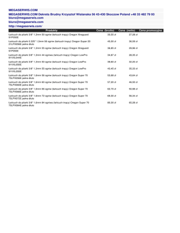 MEGASERWIS.COM MEGASERWIS.COM Dekrets Brudny Krzysztof Wislanska 56 43-430 Skoczow Poland +48 33 482 79 93 [email protected] [email protected] http://megaserwis.com/ Produkty Cena (brutto) Cena (netto) Cena promocyjna Łańcuch do pilarki 3/8" 1,3mm 50 ogniw (łańcuch tnący) Oregon Xtraguard 91P050E 33,55 zł 27,28 zł Łańcuch do pilarki 0.325" 1,5mm 56 ogniw (łańcuch tnący) Oregon Super 20 21LPX056E pełne dłuto 45,00 zł 36,59 zł Łańcuch do pilarki 3/8" 1,3mm 55 ogniw (łańcuch tnący) Oregon Xtraguard 91P055E 36,85 zł 29,96 zł Łańcuch do pilarki 3/8" 1,3mm 44 ogniwa (łańcuch tnący) Oregon LowPro 91VXL044E 34,87 zł 28,35 zł Łańcuch do pilarki 3/8" 1,3mm 50 ogniw (łańcuch tnący) Oregon LowPro 91VXL050E 39,60 zł 32,20 zł Łańcuch do pilarki 3/8" 1,3mm 55 ogniw (łańcuch tnący) Oregon LowPro 91VXL055E 43,45 zł 35,33 zł Łańcuch do pilarki 3/8" 1,6mm 56 ogniw (łańcuch tnący) Oregon Super 70 75LPX056E pełne dłuto 53,68 zł 43,64 zł Łańcuch do pilarki 3/8" 1,6mm 60 ogniw (łańcuch tnący) Oregon Super 70 75LPX060E pełne dłuto 57,20 zł 46,50 zł Łańcuch do pilarki 3/8" 1,6mm 66 ogniw (łańcuch tnący) Oregon Super 70 75LPX066E pełne dłuto 62,70 zł 50,98 zł Łańcuch do pilarki 3/8" 1,6mm 72 ogniw (łańcuch tnący) Oregon Super 70 75LPX072E pełne dłuto 69,30 zł 56,34 zł Łańcuch do pilarki 3/8" 1,6mm 84 ogniwa (łańcuch tnący) Oregon Super 70 75LPX084E pełne dłuto 80,30 zł 65,28 zł