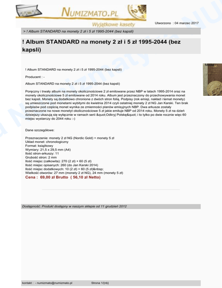 U N Utworzono : 04 marzec 2017 a k > ! Album STANDARD na monety 2 zł i 5 zł 1995-2044 (bez kapsli) y t a ! Album STANDARD na monety 2 zł i 5 zł 1995-2044 (bez kapsli) m z i m u ! Album STANDARD na monety 2 zł i 5 zł 1995-2044 (bez kapsli) Producent : - Album STANDARD na monety 2 zł i 5 zł 1995-2044 (bez kapsli) Poręczny i trwały album na monety okolicznościowe 2 zł emitowane przez NBP w latach 1995-2014 oraz na monety okolicznościowe 5 zł emitowane od 2014 roku. Album jest przeznaczony do przechowywania monet bez kapsli. Monety są dodatkowo chronione z dwóch stron folią. Podpisy (rok emisji, nakład i temat monety) są umieszczone pod monetami wybitymi do kwietnia 2014 czyli ostatniej monety 2 zł NG Jan Karski. Ten brak podpisów pod częścią monet wynika ze zmienności planów emisyjnych NBP. Dwa arkusze zostały przeznaczone na nowe monetyt okolicznościowe 5 zł jakie emituje NBP od 2014 roku. Monety 5 zł na dzień dzisiejszy ukazują się wyłącznie w ramach serii "Odkryj Polskę" i to tylko po dwie rocznie więc 60 miejsc wystarczy do 2044 roku :-) N a Dane szczegółowe: Przeznaczenie: monety 2 zł NG (Nordic Gold) + monety 5 zł Układ monet: chronologiczny Format: książkowy Wymiary: 21,5 x 29,5 mm (A4) Ilość stron-arkuszy: 11 Grubość stron: 2 mm Ilość miejsc (całkowita): 270 (2 zł) + 60 (5 zł) Ilość miejsc opisanych: 260 (do Jan Karski 2014) Ilość miejsc dodatkowych: 10 (2 zł) + 60 (5 zł) Wielkość otworów: 27 mm (monety 2 zł NG), 24 mm (monety 5 zł) Cena : 69,00 zł Brutto ( 56,10 zł Netto) Dostępność: Produkt dostępny w naszym sklepie od 11 grudzień 2012 kontakt : - [email protected] Strona 1/{nb} Model : -