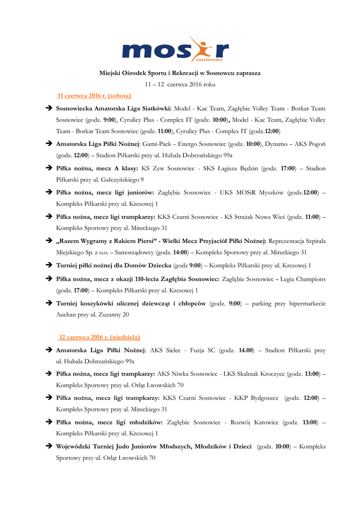Miejski Ośrodek Sportu i Rekreacji w Sosnowcu zaprasza 11 – 12 czerwca 2016 roku 11 czerwca 2016 r. (sobota) ➔ Sosnowiecka Amatorska Liga Siatkówki: Model - Kac Team, Zagłębie Volley Team - Borkar Team Sosnowiec (godz. 9:00), Cyrulicy Plus - Complex IT (godz. 10:00), Model - Kac Team, Zagłębie Volley Team - Borkar Team Sosnowiec (godz. 11:00), Cyrulicy Plus - Complex IT (godz.12:00) ➔ Amatorska Liga Piłki Nożnej: Gami-Pack – Energo Sosnowiec (godz. 10:00), Dynamo – AKS Pogoń (godz. 12:00) – Stadion Piłkarski przy ul. Hubala Dobrzańskiego 99a ➔ Piłka nożna, mecz A klasy: KS Zew Sosnowiec - SKS Łagisza Będzin (godz. 17:00) – Stadion Piłkarski przy ul. Gałczyńskiego 9 ➔ Piłka nożna, mecz ligi juniorów: Zagłębie Sosnowiec - UKS MOSiR Myszków (godz.12:00) – Kompleks Piłkarski przy ul. Kresowej 1 ➔ Piłka nożna, mecz ligi trampkarzy: KKS Czarni Sosnowiec - KS Strażak Nowa Wieś (godz. 11:00) – Kompleks Sportowy przy al. Mireckiego 31 ➔ „Razem Wygramy z Rakiem Piersi” - Wielki Mecz Przyjaciół Piłki Nożnej: Reprezentacja Szpitala Miejskiego Sp. z o.o. – Samorządowcy (godz. 14:00) – Kompleks Sportowy przy al. Mireckiego 31 ➔ Turniej piłki nożnej dla Domów Dziecka (godz 9:00) – Kompleks Piłkarski przy ul. Kresowej 1 ➔ Piłka nożna, mecz z okazji 110-lecia Zagłębia Sosnowiec: Zagłębie Sosnowiec - Legia Champions (godz. 17:00) – Kompleks Piłkarski przy ul. Kresowej 1 ➔ Turniej koszykówki ulicznej dziewcząt i chłopców (godz. 9:00) – parking przy hipermarkecie Auchan przy ul. Zuzanny 20 12 czerwca 2016 r. (niedziela) ➔ Amatorska Liga Piłki Nożnej: AKS Sielec - Fuzja SC (godz. 14.00) – Stadion Piłkarski przy ul. Hubala Dobrzańskiego 99a ➔ Piłka nożna, mecz ligi trampkarzy: AKS Niwka Sosnowiec - LKS Skalniak Kroczyce (godz. 13:00) – Kompleks Sportowy przy ul. Orląt Lwowskich 70 ➔ Piłka nożna, mecz ligi trampkarzy: KKS Czarni Sosnowiec - KKP Bydgoszcz (godz. 12:00) – Kompleks Sportowy przy al. Mireckiego 31 ➔ Piłka nożna, mecz ligi młodzików: Zagłębie Sosnowiec - Rozwój Katowice (godz. 13:00) – Kompleks Piłkarski przy ul. Kresowej 1 ➔ Wojewódzki Turniej Judo Juniorów Młodszych, Młodzików i Dzieci (godz. 10:00) – Kompleks Sportowy przy ul. Orląt Lwowskich 70