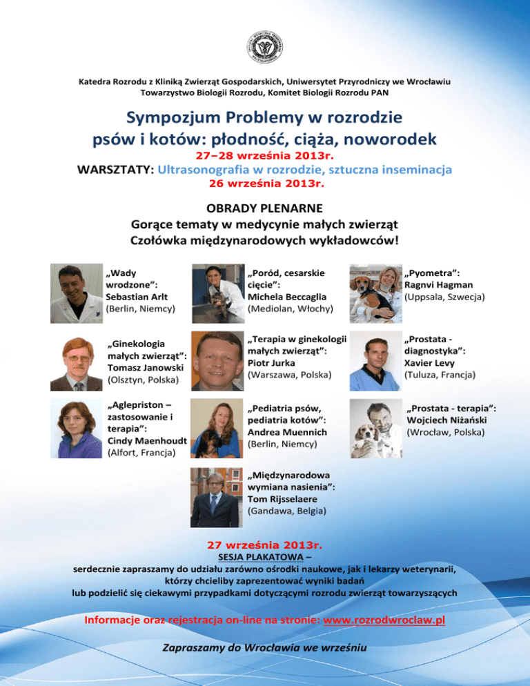 Katedra Rozrodu z Kliniką Zwierząt Gospodarskich, Uniwersytet Przyrodniczy we Wrocławiu Towarzystwo Biologii Rozrodu, Komitet Biologii Rozrodu PAN Sympozjum Problemy w rozrodzie psów i kotów: płodność, ciąża, noworodek 27–28 września 2013r. WARSZTATY: Ultrasonografia w rozrodzie, sztuczna inseminacja 26 września 2013r. OBRADY PLENARNE Gorące tematy w medycynie małych zwierząt Czołówka międzynarodowych wykładowców! „Wady wrodzone”: Sebastian Arlt (Berlin, Niemcy) „Poród, cesarskie cięcie”: Michela Beccaglia (Mediolan, Włochy) „Pyometra”: Ragnvi Hagman (Uppsala, Szwecja) „Ginekologia małych zwierząt”: Tomasz Janowski (Olsztyn, Polska) „Terapia w ginekologii małych zwierząt”: Piotr Jurka (Warszawa, Polska) „Prostata diagnostyka”: Xavier Levy (Tuluza, Francja) „Aglepriston – zastosowanie i terapia”: Cindy Maenhoudt (Alfort, Francja) „Pediatria psów, pediatria kotów”: Andrea Muennich (Berlin, Niemcy) „Prostata - terapia”: Wojciech Niżański (Wrocław, Polska) „Międzynarodowa wymiana nasienia”: Tom Rijsselaere (Gandawa, Belgia) 27 września 2013r. SESJA PLAKATOWA – serdecznie zapraszamy do udziału zarówno ośrodki naukowe, jak i lekarzy weterynarii, którzy chcieliby zaprezentować wyniki badań lub podzielić się ciekawymi przypadkami dotyczącymi rozrodu zwierząt towarzyszących Informacje oraz rejestracja on-line na stronie: www.rozrodwroclaw.pl Zapraszamy do Wrocławia we wrześniu