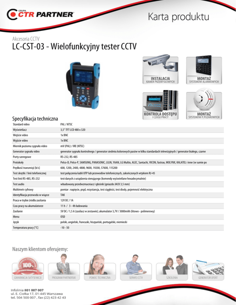 Akcesoria CCTV LC-CST-03 - Wielofunkcyjny tester CCTV INSTALACJA KAMER PRZEMYSŁOWYCH KONTROLA DOSTĘPU I CZASU PRACY Specyfikacja techniczna MONTAŻ SYSTEMÓW ALARMOWYCH MONTAŻ SYSTEMÓW P.POŻAROWYCH Standard video PAL / NTSC Wyświetlacz 3,5" TFT LCD 480 x 320 Wejście video 1x BNC Wyjście video 1x BNC Miernik poziomu sygnału video mV (PAL) / IRE (NTSC) Generator sygnału video generator sygnału kontrolnego / generator siedmiu kolorowych pasów w kilku standardach telewizyjnych / generator białego, czarne Porty szeregowe RS-232, RS-485 Protokoły Pelco-D, Pelco-P, SAMSUNG, PANASONIC, LILIN, YAAN, LG Multix, ALEC, Santachi, VICON, fastrax, MOLYNX, KALATEL i inne (w sumie po Prędkość transmisji [b/s] 600, 1200, 2400, 4800, 9600, 19200, 57600, 115200 Test skrętki / linii telefonicznej test połączenia kabli UTP lub przewodów telefonicznych, zakończonych wtykiem RJ-45 Test linii RS-485, RS-232 test danych z urządzenia sterującego (komendy wyświetlane hexadecymalnie) Test audio wbudowany przedwzmacniacz i głośnik (gniazdo JACK 3,5 mm) Multimetr cyfrowy pomiar : napięcie, prąd, rezystancja, test ciągłości, test diody, pojemność elektryczna Identyfikacja przewodu w wiązce TAK Praca w trybie źródła zasilania 12V DC / 1A Czas pracy na akumulatorze 11 h / 3 - 4h ładowania Zasilanie 5V DC / 1,5 A (zasilacz w zestawie); akumulator 3,7V / 3000mAh (litowo - polimerowy) Menu OSD Język polski, angielski, francuski, hiszpański, portugalski, niemiecki Temperatura pracy [°C] -10 - 50 Naszym klientom oferujemy: GWARANCJA SATYSFAKCJI PROGRAM PARTNERSKI POMOC TECHNICZNA SERWIS CCTV SZKOLENIA GENERATOR OFERT