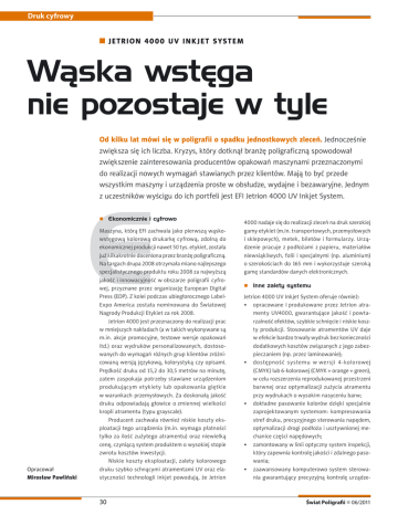Druk cyfrowy t Jetrion 4 0 0 0 UV Ink jet System Wąska wstęga nie pozostaje w tyle Od kilku lat mówi się w poligrafii o spadku jednostkowych zleceń. Jednocześnie zwiększa się ich liczba. Kryzys, który dotknął branżę poligraficzną spowodował zwiększenie zainteresowania producentów opakowań maszynami przeznaczonymi do realizacji nowych wymagań stawianych przez klientów. Mają to być przede wszystkim maszyny i urządzenia proste w obsłudze, wydajne i bezawaryjne. Jednym z uczestników wyścigu do ich portfeli jest EFI Jetrion 4000 UV Inkjet System. E r Ekonomicznie i cyfrowo Opracował Mirosław Pawliński Maszyna, którą EFI zachwala jako pierwszą wąskowstęgową kolorową drukarkę cyfrową, zdolną do ekonomicznej produkcji nawet 50 tys. etykiet, została już kilkakrotnie doceniona przez branżę poligraficzną. Na targach drupa 2008 otrzymała miano najlepszego specjalistycznego produktu roku 2008 za najwyższą jakość i innowacyjność w obszarze poligrafii cyfrowej, przyznane przez organizację European Digital Press (EDP). Z kolei podczas ubiegłorocznego LabelExpo America została nominowana do Światowej Nagrody Produkcji Etykiet za rok 2008. Jetrion 4000 jest przeznaczony do realizacji prac w mniejszych nakładach (a w takich wykonywane są m.in. akcje promocyjne, testowe wersje opakowań itd.) oraz wydruków personalizowanych, dostosowanych do wymagań różnych grup klientów zróżnicowaną wersją językową, kolorystyką czy opisami. Prędkość druku od 15,2 do 30,5 metrów na minutę, zatem zaspokaja potrzeby stawiane urządzeniom produkującym etykiety lub opakowania giętkie w warunkach przemysłowych. Za doskonałą jakość druku odpowiadają głowice o zmiennej wielkości kropli atramentu (typu grayscale). Producent zachwala również niskie koszty eksploatacji tego urządzenia (m.in. wymaga płatności tylko za ilość zużytego atramentu) oraz niewielką cenę, czyniącą system produktem o wysokiej stopie zwrotu kosztów inwestycji. Niskie koszty eksploatacji, zalety kolorowego druku szybko schnącymi atramentami UV oraz elastyczności technologii inkjet powodują, że Jetrion 30 4000 nadaje się do realizacji zleceń na druk szerokiej gamy etykiet (m.in. transportowych, przemysłowych i sklepowych), metek, biletów i formularzy. Urządzenie pracuje z podłożami z papieru, materiałów niewsiąkliwych, folii i specjalnymi (np. aluminium) o szerokościach do 165 mm i wykorzystuje szeroką gamę standardów danych elektronicznych. r Inne zalety systemu Jetrion 4000 UV Inkjet System oferuje również: • opracowane i produkowane przez Jetrion atramenty UV4000, gwarantujące jakość i powtarzalność efektów, szybkie schnięcie i niskie koszty produkcji. Stosowanie atramentów UV daje w efekcie bardzo trwały wydruk bez konieczności dodatkowych kosztów związanych z jego zabezpieczaniem (np. przez laminowanie); • dostępność systemu w wersji 4-kolorowej (CMYK) lub 6-kolorowej (CMYK + orange + green), w celu rozszerzenia reprodukowanej przestrzeni barwnej oraz optymalizacji zużycia atramentu przy wydrukach o wysokim nasyceniu barw; • dokładne pasowanie kolorów dzięki specjalnie zaprojektowanym systemom: kompresowania stref druku, precyzyjnego sterowania napędem, optymalizacji drogi podłoża i usztywnionej mechanice części napędowych; • zamontowany w linii optyczny system inspekcji, który zapewnia kontrolę jakości i zdalnego pasowania; • zaawansowany komputerowo system sterowania gwarantujący precyzyjną kontrolę urządze- Świat Poligrafii r 06/2011 Druk cyfrowy nia i głowic drukujących, zarządzanie pracami, projektowanie i ustawienie etykiet, kontrolę drukowania zmiennych danych według zadanego szablonu, diagnostykę urządzenia w czasie rzeczywistym, oszacowanie zużycia atramentu i inteligentny system ponowienia produkcji; • łatwą obsługę dzięki zintegrowaniu systemu z RIP-em EFI Fiery XF oraz oparciu zarządzania kolorem na technologii Bestcolor. r Szczegółowe informacje Jetrion 4000 wyposażony jest w głowice skonstruowane na piezoelektrycznych modułach drukujących Xaar-1001 typu grayscale, produkowanych w zaawansowanej technologii DOD, które w połączeniu z atramentami Jetrion oferują jakość druku bliską fotograficznej. Moduły te, fizycznie posiadające 6 poziomów szarości, pozwalają w praktyce na drukowanie z 16 poziomami szarości. Dowodem wysokiej klasy modułu Xaar była PIA/GATF Intertech Technology Award, ceniona w branży poligraficznej nagroda przyznana w 2008 r. Organizacja przyznająca nagrodę doceniła w ten sposób zastosowaną w module technologię HSS, która podtrzymuje drożność dysz przez samooczyszczanie, co zapewnia ciągłość produkcji. Druk w urządzeniu odbywa się za pomocą atramentów Jetrion. Producent wypracował własny patent na atramenty UV pracujące w temperaturze otoczenia, nie wymagające podgrzewania głowic w celu uzyskania właściwej lepkości. „Atramentowy” patent Jetrion’a pozwolił na uproszczenie, udoskonalenie, przedłużenie żywotności i potanienie głowic produkowanych przez firmy Xaar, Spectra oraz Toshiba TEC. Głowice typu grayscale umożliwiają natryskiwanie na podłoże punktów o zmiennej wielkości. Jest to uzyskiwane za pomocą emisji pojedynczych kropelek lub serii kropelek atramentu, które na podłożu łączą się tworząc jeden punkt. Dysz emitujących kropelki jest 1000, ułożone są w dwu rzędach po 500, dając fizyczną rozdzielczość 360 dpi. Każda kropelka zawiera 6 pikolitrów atramentu. Głowica Xaar 1001 pozwala na uzyskanie serii do 7 kropelek o sumarycznych pojemnościach od 6 pl do 42 pl. W rezultacie efektywna rozdzielczość postrzegana wzrokowo wynosi 1080 dpi zamiast 360 dpi. Jest to znacząca różnica w porównaniu z tzw. głowicami binarnymi. Technologia grayscale daje znacznie wierniejszą reprodukcję barw i łatwiejsze uzyskanie zgodności kolorystycznej, wyraźniejszy tekst i ciągło