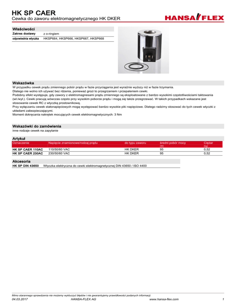 HK SP CAER Cewka do zaworu elektromagnetycznego HK DKER Właściwości Zakres dostawy z o-ringiem odpowiednia wtyczka HKSP664, HKSP666, HKSP667, HKSP668 Wskazówka W przypadku cewek prądu zmiennego pobór prądu w fazie przyciągania jest wyraźnie wyższy niż w fazie trzymania. Dlatego nie wolno ich używać bez rdzenia, ponieważ grozi to przegrzaniem i przepaleniem cewki. Podobny efekt występuje, gdy zawory z elektromagnesami prądu zmiennego są eksploatowane z bardzo wysokimi częstotliwościami taktowania (wł./wył.). Cewki pracują wówczas często przy wysokim poborze prądu i mogą się także przegrzewać. W takich przypadkach wskazane jest stosowanie cewek RC z wtyczką prostownikową. Przy wyłączaniu cewek stałonapięciowych mogą występować bardzo wysokie piki napięciowe. Dlatego radzimy stosować do tych cewek wtyczki z układami zabezpieczającymi. Moment dokręcania nakrętek mocujących cewek elektromagnetycznych: 3 Nm Wskazówki do zamówienia inne rodzaje cewek na zapytanie Artykuł Oznaczenie HK SP CAER 110AC HK SP CAER 230AC Napięcie znamionowe/rodzaj prądu 110/50/60 VAC 230/50/60 VAC do typu zaworu HK DKER HK DKER średni pobór mocy Ciężar (W) (kg) 95 95 0,52 0,52 Akcesoria HK SP DIN 43650 Wtyczka elektryczna do cewki elektromagnetycznej DIN 43650 / ISO 4400 Mimo starannego sprawdzenia nie możemy wykluczyć błędów i nie gwarantujemy prawidłowości podanych informacji. 04.03.2017 HANSA-FLEX AG www.hansa-flex.com 1