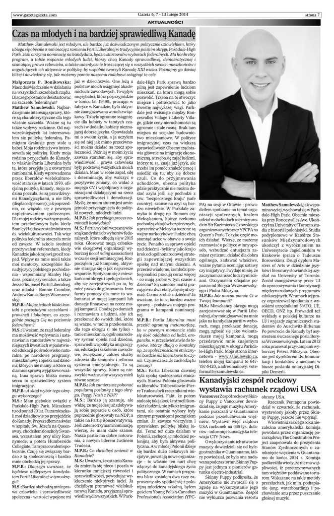 Gazeta 6, 7 - 13 lutego 2014 www.gazetagazeta.com strona 7 AKTUALNOŚCI Czas na młodych i na bardziej sprawiedliwą Kanadę Matthew Samulewski jest młodym, ale bardzo już doświadczonym politycznie człowiekiem, który ubiega się obecnie o nominację z ramienia Partii Liberalnej w tradycyjnie polskim okręgu Parkdale-High Park. Jeśli otrzyma nominację na kandydata, będzie startował w wyborach federalnych. Ma konkretny program, a także wsparcie młodych ludzi, którzy chcą Kanady sprawiedliwej, demokratycznej i szanującej prawa człowieka, a także autentycznie troszczącej się o wszystkich swoich mieszkańców i angażujących ich aktywnie w politykę, by wspólnie tworzyli Kanadę XXI wieku. Poznajmy go dzisiaj bliżej i dowiedzmy się, jak możemy pomóc naszemu rodakowi osiągnąć te cele. Małgorzata P. Bonikowska: Masz doświadczenie w działaniu na wszystkich szczeblach rządu. Dlaczego postanowiłeś startować na szczeblu federalnym? Matthew Samulewski: Najbardziej mnie interesują sprawy, które są charakterystyczne dla tego właśnie szczebla. Ważne są tu także wpływy rodzinne. Od najwcześniejszych lat interesowałem się polityką federalną. Pamiętam dyskusje przy stole u babci. Moja rodzina żywo interesowała się polityką. Kiedy moja rodzina przyjechała do Kanady, to właśnie Partia Liberalna była tą, która przyjęła ją z otwartymi ramionami. Kiedy wprowadzona przez liberałów wielokulturowość stała się w latach 1970. oficjalną polityką Kanady, moja rodzina poczuła, że są prawdziwymi Kanadyjczykami, a nie DPs (displaced persons), jak poprzednio, co wiązało się z pewnym napiętnowaniem społecznym. Dla mojej rodziny ważnym punktem przełomowym było kiedy Stanley Hajdasz został ministrem ds. wielokulturowości. Tak więc polityka federalna otaczała mnie od zawsze. W szkole średniej przeżywałem referendum, kiedy Kanadzie jako krajowi groził rozpad. Wpływ na mnie mieli także moi mentorzy, szczególnie Kanadyjczycy polskiego pochodzenia - wspomniany Stanley Hajdasz, późniejszy senator, a także Jesse Flis, poseł Partii Liberalnej, oraz młodsi - Bonnie Crombie, Andrew Kania, Borys Wrzesnewskyj. M.P.B.: Mając jednak bliski kontakt z pozostałymi szczeblami prowincji i lokalnym, co szczególnie pociąga Cię na poziomie federalnym? M.S.: Uważam, że rząd federalny ma możliwość wpływania i ustanawiania standardów w najważniejszych kwestiach w państwie od edukacji po środowisko naturalne, po narodowe programy: mieszkaniowy i opieki nad dziećmi, których nie mamy, a które są dla mnie sprawą wyjątkowo ważną. Inna sprawa bliska memu sercu to sprawiedliwy system imigracyjny. M.P.B.: A skąd wybór tego okręgu wyborczego? M.S.: Mam głębokie związki z Parkdale-High Park. Mieszkam tu od ponad 20 lat. Tu zamieszkali moi dziadkowie po przyjeździe do Kanady. Przyszedłem na świat w szpitalu Św. Józefa na Queensway, chodziłem do szkoły Swansea, wzrastałem przy ulicy Runnymede, a potem Humberside Collegiate. Tam pracowałem społecznie. Czuję się związany bardzo z tą społecznością i bardzo mnie obchodzą jej sprawy. M.P.B.: Dlaczego uważasz, że będziesz najlepszym kandydatem Partii Liberalnej w tym okręgu? M.S.: Bardzo obchodzą mnie prawa człowieka i sprawiedliwość społeczna - wartości wpojone mi już w dzieciństwie. One leżą u podstaw moich osiągnięć akademickich i zawodowych. To wpływ mojej babci, która po przyjeździe w końcu lat 19490., pracując w fabryce w Kanadzie, była aktywnie zaangażowana w ruch związkowy. To było ogromne osiągnięcie dla kobiety w tamtych czasach i w dodatku kobiety nieznającej dobrze języka. Opowiadała mi o swoim życiu, a ja uczyłem się od niej jak mimo przeciwności można działać na rzecz społeczności. Później w moim życiu zawsze starałem się, aby sprawiedliwość i prawa człowieka były podstawą wszystkich moich działań. Mam w sobie zapał, siłę i determinację, aby walczyć o pozytywne zmiany, co widać z mojego CV i współpracy z organizacjami działającymi na rzecz sprawiedliwości i demokracji. Myślę, że moim atutem jest umiejętność przyciągnięcia do polityki nowych, młodych ludzi. M.P.B.: Jak przebiega proces nominacji kandydata? M.S.: Partia wyłoni wczesną wiosną kandydata do wyborów federalnych, które odbędą się w 2015 roku. Głosować mogą członkowie okręgowej organizacji wyborczej (local riding association) w czasie sesji nominacyjnej. Rozpocząłem już kampanię, aktywnie starając się o jak najszersze wsparcie. Spotykam się z mieszkańcami okręgu i apeluję do nich, aby się zarejestrowali po to, by mieć prawo do głosowania. Inne formy pomocy dla mnie to wolontariat w mojej kampanii lub donacje finansowe na rzecz mojej kampanii. Chodzę po domach i rozmawiam z ludźmi, aby ich przekonać do swoich idei, które są ważne, w moim przekonaniu, dla tego okręgu (i nie tylko) tanie mieszkania, ogólnonarodowy system opieki nad dziećmi, sprawiedliwa polityka imigracyjna, edukacja i szkolenie zawodowe, zwiększony zakres służby zdrowia dla seniorów i reforma systemu emerytalnego. To są wszystko sprawy, które są niezwykle ważne, aby wszyscy mieli równe szanse. M.P.B.: Jak zamierzasz pokonać popularną posłankę z tego okręgu, Peggy Nash z NDP? M.S.: Bardzo ją szanuję, ale widzę, że moje idee już zdobywają sobie poparcie u osób, które poprzednio głosowały na NDP, a także na Partię Konserwatywną. Jeśli zatem otrzymam nominację, wierzę, że mam duże szanse. Nasza partia ma dobre notowania, z nowym liderem Justinem Trudeau. M.P.B.: Co chciałbyś zmienić w Kanadzie? M.S.: Uważam, że ostatnio Kanada zmieniła się nieco i poszła w kierunku mniejszej równości i sprawiedliwości, powodując wykluczenie niektórych ludzi. Ja chciałbym promować wielokulturową Kanadę, przyjazną i sprawiedliwą dla wszystkich. W Park- dale-High Park sprawą bardzo pilną jest zapewnieni