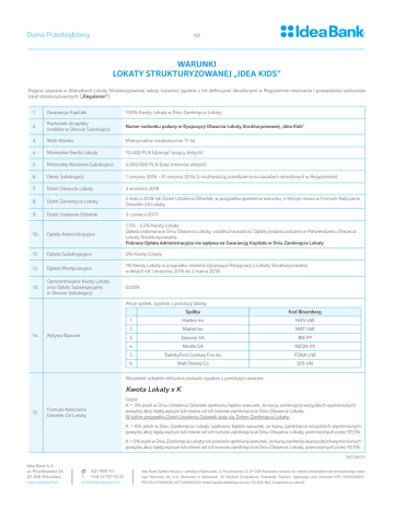 Duma Przedsiębiorcy 1/2 Warunki Lokaty Strukturyzowanej „IDEA KIDS” Pojęcia używane w Warunkach Lokaty Strukturyzowanej należy rozumieć zgodnie z ich definicjami określonymi w Regulaminie otwierania i prowadzenia rachunków lokat strukturyzowanych („Regulamin”). 1. Gwarancja Kapitału 100% Kwoty Lokaty w Dniu Zamknięcia Lokaty 2. Rachunek do wpłaty środków w Okresie Subskrypcji Numer rachunku podany w Dyspozycji Otwarcia Lokaty Strukturyzowanej „Idea Kids” 3. Wiek Klienta Maksymalnie nieukończone 71 lat 4. Minimalna Kwota Lokaty 10.000 PLN (dziesięć tysięcy złotych) 5. Minimalny Wolumen Subskrypcji 5.000.000 PLN (pięć milionów złotych) 6. Okres Subskrypcji 1 sierpnia 2016 - 31 sierpnia 2016 (z możliwością przedłużenia na zasadach określonych w Regulaminie) 7. Dzień Otwarcia Lokaty 2 września 2016 8. Dzień Zamknięcia Lokaty 2 marca 2018 lub Dzień Ustalenia Odsetek, w przypadku spełnienia warunku, o którym mowa w Formule Naliczania Odsetek Od Lokaty 9. Dzień Ustalenia Odsetek 2 czerwca 2017 10. Opłata Administracyjna 1,5% - 3,5% Kwoty Lokaty Opłata pobierana w Dniu Otwarcia Lokaty, ostateczna wartość Opłaty podana zostanie w Potwierdzeniu Otwarcia Lokaty Strukturyzowanej Pobrana Opłata Administracyjna nie wpływa na Gwarancję Kapitału w Dniu Zamknięcia Lokaty 11. Opłata Subskrypcyjna 0% Kwoty Lokaty 12. Opłata Manipulacyjna 1% Kwoty Lokaty w przypadku złożenia Dyspozycji Rezygnacji z Lokaty Strukturyzowanej w dniach od 1 września 2016 do 2 marca 2018 13. Oprocentowanie Kwoty Lokaty oraz Opłaty Subskrypcyjnej w Okresie Subskrypcji: 0,00% Akcje spółek, zgodnie z poniższą tabelą: 14. Aktywo Bazowe Spółka Kod Bloomberg 1. Hasbro Inc HAS UW 2. Mattel Inc MAT UW 3. Danone SA BN FP 4. Nestle SA NESN VX 5. TwentyFirst Century Fox Inc FOXA UW 6. Walt Disney Co DIS UN Wysokość odsetek obliczona zostanie zgodnie z poniższym wzorem: Kwota Lokaty x K 15. Formuła Naliczania Odsetek Od Lokaty Gdzie: K = 3% jeżeli w Dniu Ustalenia Odsetek spełniony będzie warunek, że kursy zamknięcia wszystkich wymienionych powyżej akcji będą wyższe lub równe od ich kursów zamknięcia w Dniu Otwarcia Lokaty. W takim przypadku Dzień Ustalenia Odsetek staje się Dniem Zamknięcia Lokaty. K = 6% jeżeli w Dniu Zamknięcia Lokaty spełniony będzie warunek, że kursy zamknięcia wszystkich wymienionych powyżej akcji będą wyższe lub równe od ich kursów zamknięcia w Dniu Otwarcia Lokaty, pomnożonych przez 97,5%. K = 0% jeżeli w Dniu Zamknięcia Lokaty nie zostanie spełniony warunek, że kursy zamknięcia wszystkich wymienionych powyżej akcji będą wyższe lub równe od ich kursów zamknięcia w Dniu Otwarcia Lokaty, pomnożonych przez 97,5%. 1607281121 Idea Bank S.A. ul. Przyokopowa 33 01-208 Warszawa www.ideabank.pl 801 999 111 +48 22 101 10 10 [email protected] T: Idea Bank Spółka Akcyjna z siedzibą w Warszawie, ul. Przyokopowa 33, 01-208 Warszawa, wpisana do rejestru przedsiębiorców prowadzonego przez Sąd Rejonowy dla m.st. Warszawy w Warszawie, XII Wydział Gospodarczy Krajowego Rejestru Sądowego, pod numerem KRS 0000026052, REGON 011063638, NIP 5260307560, której kapitał zakładowy wynosi 156 803 962 zł (opłacony w całości). Duma Przedsiębiorcy 2/2 16. Współczynnik Partycypacji 100% 17. Dzień Wyceny Każdy 10. Dzień Roboczy miesiąca kalendarzowego Okresu Lokaty 18. Kwota Wykupu Wartość Bieżąca Lokaty Strukturyzowanej przypadająca na najbliższy Dzień Wyceny następujący po dniu złożenia Dyspozycji Rezygnacji z Lokaty Strukturyzowanej Ważne zastrzeżenia prawne Informacje zawarte w niniejszym materiale nie mogą być traktowane, jako usługa doradztwa inwestycyjnego, podatkowego lub jako forma świadczenia pomocy prawnej. Idea Bank S.A. dołożył starań, aby zamieszczone w niniejszym materiale informacje były rzetelne oraz oparte na wiarygodnych źródłach. Wszystkie określenia pisane wielkimi literami maja znaczenie nadane im w „Regulaminie otwierania i prowadzenia rachunków lokat strukturyzowanych” („Regulamin”). Zawieranie umów o Lokaty Strukturyzowane może się wiązać z konsekwencjami podatkowymi. W celu uzyskania szczegółowych informacji w zakresie opodatkowania zysków z umów o Lokaty Strukturyzowane, Klient powinien zasięgnąć porady profesjonalnego doradcy podatkowego. Idea Bank S.A. oferując lokatę strukturyzowaną nie świadczy usług doradztwa inwestycyjnego, ani nie udziela porad inwestycyjnych lub rekomendacji zawarcia transakcji. Ostateczna decyzja, co do otwarcia Lokaty Strukturyzowanej oraz wielkości zaangażowanych środków należy wyłącznie do Klienta. Otwarcie Lokaty Strukturyzowanej wiąże się z opłatami, których wysokość i sposób pobierania zostały określone w niniejszych Warunkach oraz w Regulaminie. Zawarcie umowy o Lokatę Strukturyzowaną nie gwarantuje osiągnięcia zysku. Ewentualny zysk z Lokaty Strukturyzowanej wynika ze zmiany wyceny Aktywa Bazowego i ustalonego Współczynnika Partycypacji. Lokata podlega ochronie w ramach Bankowego Funduszu Gwarancyjnego do wysokości nieprzekraczającej równowartości w złotych 100 000 euro. Korzystanie z Lokat Strukturyzowanych wiąże się z ryzykiem, w szczególności z: - ryzykiem związanym ze spadkiem wartości Aktywa Bazowego. W Okresie Lokaty Wartość Bieżąca Lokaty Strukturyzowanej może ulegać znacznym wahaniom ze względu na zmiany wyceny Aktywa Bazowego spowodowane różnorodnymi czynnikami rynkowymi, - ryzykiem utraty części Kwoty Lokaty, w przypadku złożenia Dyspozycji Rezygnacji z Lokaty Strukturyzowanej przed końcem Okresu Lokaty ze względu na zmiany Wartości Bieżącej Lokaty Strukturyzowanej oraz obowiązek zapłaty Opłaty Manipulacyjnej; - ryzykiem przedłużenia Okresu Subskrypcji lub nieotwarcia Lokaty Strukturyzowanej, oraz zwrotu Kwoty Lokaty. Niezależnie od informacji przekazanych przez Idea Bank S.A., przed zawarciem umowy o Lokatę Strukturyzowaną Klient jes