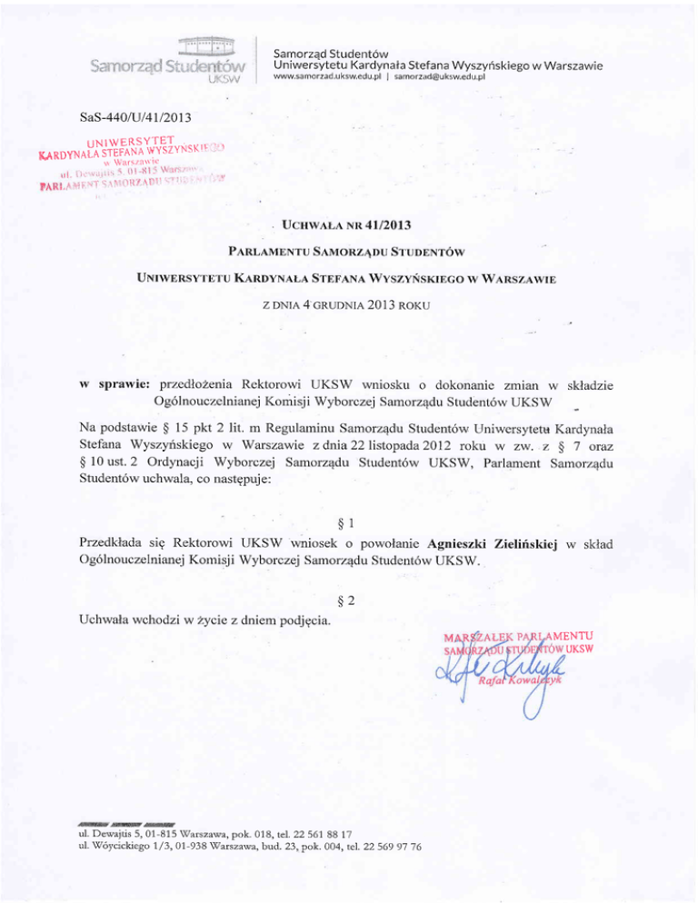 $*t n $**# Samorzqd Student6w U n iwersytetu Kardyn ata Stef r,,il www.samorzad.uksw.edu.pl :-i# I an a Wyszyriskiego w Wa rszawi e [email protected] SaS-440/U l4Il2013 uN IwERSYTE-TYNSI{ r} ldA RDYN A LA :llrtl,t,x, l,' l " . UcnwarA NR 4112013 Pnnr,uvrnNTu SAMoR z 4DU SrulnNrow UNrwnRsyrETU KanoyNu,A STEFANA WyszyNsxrEco w WaRszawrB z DNIA 4 cRuoNrR 2013 w noru sprawie: przedlohenia Rektorowi UKSW wniosku o dokonanie zmian w skladzie Og6lnouczelnianej Komisj i Wyborczej Samorz4du Student6w UKS W Na podstawie $ 15 pkt2lit. m Regulaminu Samorz4du Student6w Uniwersytetu Kardynala Stefana Wyszyriskiego w Warszawie zdnra22listopada2}l2 roku w zw. z $ 7 oraz $ 10 ust. 2 Ordynacji Wyborczej Samorz4du Student6w UKSW, Parlament Samorz4du Student6w uchwala, co nastgpuje: $1 Pruedldada sig Rektorowi UKSW wniosek o powolanie Agnieszki Zielirflskiej Og6lnouczelnianej Komisj i Wyborczej Samorz4du Student6w UKSW. w sklad A' \Uchwala wchodzi w 2ycie z dniempodjgcia. MENTU UKSW ul. Dewajtis 5, 01-815 Watsza'wa, pok, 018, teL 22 561. 88 !7 ul. \T6ycickiego 1/3,01-938 \/arszawa,bud.23, pok. 004, tel.22 569 97 76