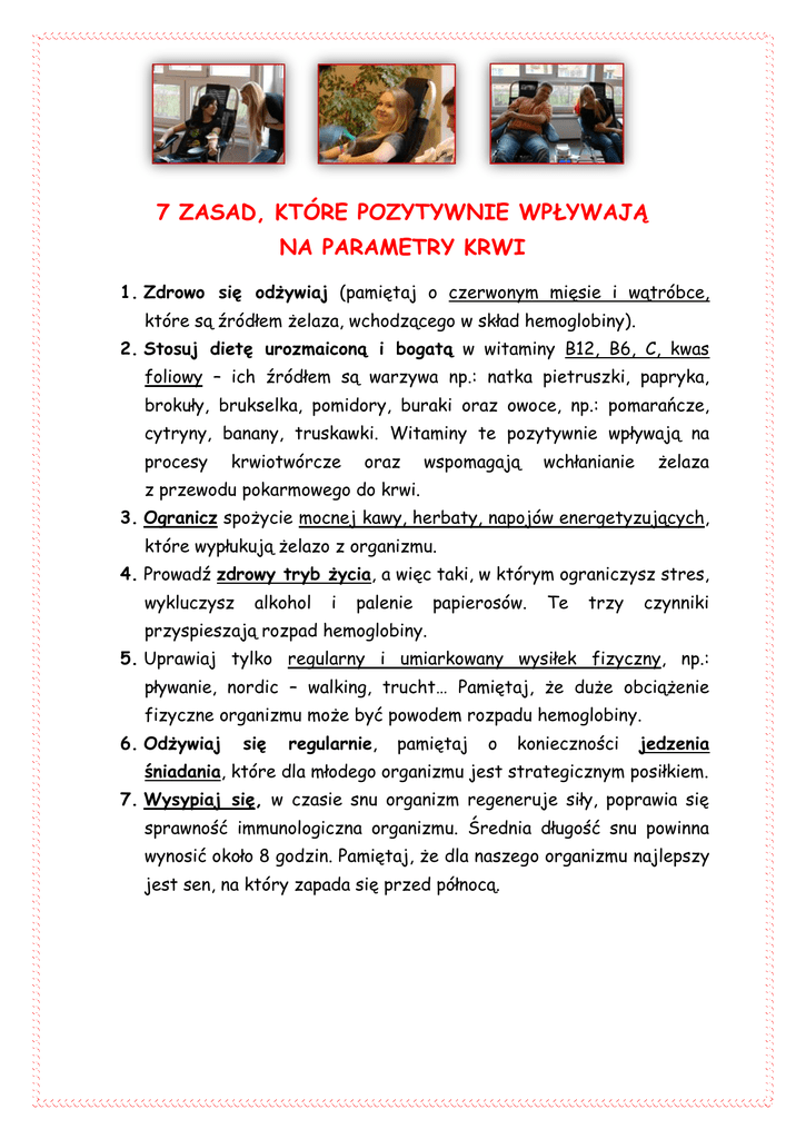 7 ZASAD, KTÓRE POZYTYWNIE WPŁYWAJĄ NA PARAMETRY KRWI 1. Zdrowo się odżywiaj (pamiętaj o czerwonym mięsie i wątróbce, które są źródłem żelaza, wchodzącego w skład hemoglobiny). 2. Stosuj dietę urozmaiconą i bogatą w witaminy B12, B6, C, kwas foliowy – ich źródłem są warzywa np.: natka pietruszki, papryka, brokuły, brukselka, pomidory, buraki oraz owoce, np.: pomarańcze, cytryny, banany, truskawki. Witaminy te pozytywnie wpływają na procesy krwiotwórcze oraz wspomagają wchłanianie żelaza z przewodu pokarmowego do krwi. 3. Ogranicz spożycie mocnej kawy, herbaty, napojów energetyzujących, które wypłukują żelazo z organizmu. 4. Prowadź zdrowy tryb życia, a więc taki, w którym ograniczysz stres, wykluczysz alkohol i palenie papierosów. Te trzy czynniki przyspieszają rozpad hemoglobiny. 5. Uprawiaj tylko regularny i umiarkowany wysiłek fizyczny, np.: pływanie, nordic – walking, trucht… Pamiętaj, że duże obciążenie fizyczne organizmu może być powodem rozpadu hemoglobiny. 6. Odżywiaj się regularnie, pamiętaj o konieczności jedzenia śniadania, które dla młodego organizmu jest strategicznym posiłkiem. 7. Wysypiaj się, w czasie snu organizm regeneruje siły, poprawia się sprawność immunologiczna organizmu. Średnia długość snu powinna wynosić około 8 godzin. Pamiętaj, że dla naszego organizmu najlepszy jest sen, na który zapada się przed północą.