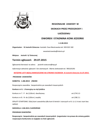 REGIONALNE ZAWODY W SKOKACH PRZEZ PRZESZKODY i UJEŻDZENIU DWOREK I STADNINA KONI JEZIORKI 1-2.08.2015 Organizator: KJ Jeziorki-Osieczna kontakt: Ewa Niestrawska tel. 503 022 182 [email protected] Miejsce: Jeziorki k/ Osiecznej Termin zgłoszeń: 29.07.2015 Zgłoszenia kierować na adres: [email protected] Informacje odnośnie zgłoszeń i list startowych: Marta Jankowiak tel. 785325291 WSTĘPNE LISTY BĘDĄ ZAMIESZCZONE NA STRONIE FACEBOOK KJ Jeziorki Osieczna 31.07.2015. PROGRAM ZAWODÓW: SOBOTA: 1.08.2015 /SKOKI Rozpoczęcie zawodów: bezpośrednio po zawodach towarzyskich Konkurs nr 6. L licencyjny na styl jeźdźca Konkurs nr 7. P do (110cm) dwufazowy art.274.5.3 Konkurs nr 8. N do (120cm.) zwykły art.238.2.1 OPŁATY STARTOWE: 50zŁ/start zawodnika (dla koni 6 letnich i starszych w kl. LL-L1 trzeci start bez opłaty) NIEDZIELA: 2.08.2015 /UJEŻDŻENIE PROGRAM ZAWODÓW: Rozpoczęcie : bezpośrednio po zawodach towarzyskich (organizator ma prawo do zmiany godzin rozpoczęcia konkursów ze względu na ilość zgłoszeń) Konkursy w kolejności: - L6-R, 2015 (20x40) – kuce -D1, 2015 (20x60) - N4, 2015 (20x60) -C1, 2015 (20x60) OBSADA SĘDZIOWSKA: SKOKI: Sędzia Główny: Robert Bartkowiak Sędzia WZJ: Katarzyna Kuta, sędzia Urszula Drapik Komisarz: Kalina Maćkowiak Sędzia stylu: Tadeusz Szymoniak Gospodarz toru: Tadeusz Szymoniak UJEŻDŻENIE: Żaneta Sokołowska, Monika Warych OPŁATY STARTOWE: 50 zł/ start NAGRODY: Flot’s dla koni. Zgłoszenia po wyznaczonym terminie oraz każda zmiana na listach startowych w dniu zawodów -opłata 20zł ( nie dotyczy skreśleń z listy). SPRAWY ORGANIZACYJNE: 1. Każdy zawodnik musi posiadać aktualne pozwolenie lekarskie o braku przeciwwskazań do jazdy konnej oraz aktualne licencje 2. W przypadku niepełnoletności zgodę rodzica lub opiekuna, ubezpieczenie NW 3.Zawody rozgrywane na podłożu piaszczystym, rozprężania- podłoże trawiaste. 4. Na terenie zawodów obecny będzie ratownik medyczny. 5. Organizator nie odpowiada za wypadki, szkody i kradzieże powstałe w trakcie zawodów i transportu. Organizator nie ponosi żadnej odpowiedzialności w razie wypadków i zachorowań trenera, zawodników, luzaków i koni, jak również w przypadku kradzieży, zniszczeń, pożarów i innych wydarzeń. Zawodnicy i właściciele odpowiadają osobiście za szkody w stosunku do osób trzecich, spowodowane przez nich samych, ich pracowników lub ich konie. Dlatego zalecane jest zawarcie stosownego pełnego ubezpieczenia na czas udziału w zawodach. 7.Boksy dla koni : Ewa Niestrawska tel. 503 022 182, [email protected] 50zł/dzień zawodów, 70 zł/ przyjazd w dniu poprzedzającym zawody (liczba ograniczona) SAMOWOLNE WPROWADZANIE KONI DO BOKSÓW-100ZŁ Propozycje zatwierdzone przez WZJ w dniu 30.06.2015 - Ryszard Szymoniak W dniu 31.07.2015 ( piątek) odbędzie się egzamin na odznaki jeździeckie (brązowa i srebrna ). Zgłoszenia : [email protected] Informacje: Ewa Niestrawska tel. 503 022 182 Kodeks Postępowania z Koniem 1. Polski Związek Jeździecki w ślad za Międzynarodową Federacją Jeździecką FEI oczekuje, że wszystkie osoby zaangażowane w jakikolwiek sposób w sporty konne, będą przestrzegać zasad niniejszego Kodeksu Postępowania z Koniem oraz przyjmą do wiadomości, że w każdym przypadku dobro konia musi być sprawą nadrzędną i nigdy nie może być podporządkowane współzawodnictwu sportowemu ani celom komercyjnym. 2. Na wszystkich etapach treningu i przygotowań konia do startu w zawodach, dobro konia musi stać ponad wszelkimi innymi wymaganiami. Dotyczy to stałej opieki, metod treningu, starannego obrządku, kucia i transportu. 3. Konie i jeźdźcy muszą być wytrenowani, kompetentni i zdrowi zanim wezmą udział w zawodach. Odnosi się to także do podawania leków i środków medycznych, zabiegów chirurgicznych zagrażających dobru konia lub ciąży klaczy, oraz do przypadków nadużywania pomocy medycznej. 4. Zawody nie mogą zagrażać dobru konia. Wymaga to zwrócenia szczególnej uwagi na teren zawodów, powierzchnię podłoża, pogodę, warunki stajenne, kondycję koni i ich bezpieczeństwo także podczas podróży powrotnej z zawodów. 5. Należy dołożyć wszelkich starań, aby zapewnić koniom staranną opiekę po zakończeniu zawodów, a także humanitarne traktowanie po zakończeniu kariery sportowej. Dotyczy to właściwej opieki weterynaryjnej obrażeń odniesionych na zawodach, spokojnej starości, ewentualnie eutanazji. PZJ zachęca wszystkie osoby działające w sporcie jeździeckim do stałego podnoszenia swojej wiedzy oraz umiejętności dotyczących wszelkich aspektów współpracy z koniem.