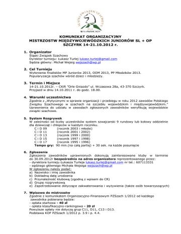 KOMUNIKAT ORGANIZACYJNY MISTRZOSTW MIĘDZYWOJEWÓDZKICH JUNIORÓW SL + OP SZCZYRK 14-21.10.2012 r. 1. Organizator Śląski Związek Szachowy Dyrektor turnieju: Łukasz Turlej [email protected] Sędzia główny: Michał Wejsig [email protected] 2. Cel Turnieju Wyłonienie finalistów MP Juniorów 2013, OOM 2013, PP Młodzików 2013. Popularyzacja szachów wśród dzieci i młodzieży. 3. Termin i Miejsce 14-21.10.2012r. – CKiR ”Orle Gniazdo” ul. Wczasowa 28a, 43-370 Szczyrk. Przyjazd w dniu 14.10.2011 r. do godz. 18.00. 4. Warunki uczestnictwa Zgodnie z „Wytycznymi w sprawie organizacji i przebiegu w roku 2012 zawodów Polskiego Związku Szachowego w szachach na szczeblu wojewódzkim i międzywojewódzkim.” Uprawnienia do udziału w zawodach zgłoszonych zawodników weryfikują wojewódzkie związki szachowe. 5. System Rozgrywek W zależności od liczby uczestników system szwajcarski 9 rundowy lub kołowy oddzielnie dla dziewcząt i chłopców w każdym roczniku. C i D 09 (rocznik 2003 i młodsi) C i D 11 (rocznik 2001 i 2002) C i D 13 (rocznik 1999 i 2000) C i D 15 (rocznik 1997 i 1998) C i D 17 (rocznik 1995 i 1996) Tempo gry: 90 min.(na całą partię) + 30 sek. na każde posunięcie 6. Zgłoszenia Zgłoszenia zawodników uprawnionych dokonują zainteresowane kluby w terminie do 30.09.2012r bezpośrednio na adres organizatora reprezentowanego przez: - dyrektora turnieju Łukasza Turleja [email protected] nr tel.: 607113331 - sędziego głównego Michała Wejsiga [email protected] W zgłoszeniu należy podać: a) Nazwisko i imię zawodnika b) Dokładną datę urodzenia c) Przynależność klubową (zgodną z wpisem do CR) d) Grupę rozgrywkową e) Zapotrzebowanie dotyczące zakwaterowania i wyżywienia (także osób towarzyszących) 7. Wpisowe do mistrzostw Zgodnie z komunikatem Organizacyjno-Finansowym PZSzach 1/2012 od każdego zawodnika pobierana będzie: - opłata startowa - 40 zł - opłata klasyfikacyjno-rankingowa - 20 zł Powyższe opłaty nie dotyczą grup C11, D11, C13 i D13. Podstawa KOF PZSzach 1/2012 p. 3.9 i p. 4.4. 8. Zakwaterowanie i wyżywienie Zakwaterowanie i wyżywienie w CKiR „Orle Gniazdo”, ul. Wczasowa 28a, 43-370 Szczyrk. Pokoje wyposażone są w pełny węzeł sanitarny oraz telewizor. Koszt zakwaterowania i wyżywienia od kolacji 14.10 do obiadu 21.10.2012r wynosi: Typ Rodzaj pokoju Standard Podstawowy A Studio 2+2 (1 łazienka na dwa pokoje) B Pokój 2 i 3 osobowy C Pokój 1 osobowy Standard Podwyższony D Pokój 2 osobowy E Pokój 1 osobowy F Apartament (za 1 miejsce) 1 osobodzień Koszt całkowity 62,65,75,- 434,455,525,- 85,95,150,- 595,665,1050,- 9. Finansowanie Koszty wpisowego (w tym opłat K-R) oraz Koszt zakwaterowania i wyżywienia pokrywają bezpośrednio jednostki delegujące - Kluby. Wyjątkowo wpłat mogą dokonywać bezpośrednio rodzice i opiekunowie prawni zawodników. W/w opłaty należy dokonać do dnia 5.10.2012 przelewem na konto ŚlZSzach BGŻ S.A Oddział w Zabrzu 54 2030 0045 1110 0000 0236 8940 podając w Tytule wpłaty dopisek „PMP Szczyrk” i nazwiska osób, których wpłata dotyczy. Można również dokonać wpłaty gotówkowej u Skarbnika Związku do dnia 5.10.2012. Uprasza się o bezpośredni kontakt ze Skarbnikiem (A.Maślanka tel.: 509-677-202 mail: [email protected] ) zaraz po dokonaniu wpłaty w celu ustalenia danych do rachunku za dokonaną wpłatę. Wpłaty w innym terminie i w innej formie muszą być wcześniej uzgodnione ze skarbnikiem ŚlZSzach. Wcześniejsza wpłata gwarantuje możliwość wyboru preferowanego typu pokojów. Ośrodek oferuje ograniczoną liczbę pokojów każdego typu. 10. Nagrody a) Zdobywcy 3 pierwszych miejsc otrzymają puchary b) Zdobywcy 6 pierwszych miejsc otrzymają dyplomy c) Wszyscy uczestnicy w grupach C9 i D9 otrzymają dyplomy pamiątkowe i upominki 11. Uwagi końcowe a) Procedura zgłoszeń dodatkowych podana jest na stronie www.szs.org.pl b) Zawodnik może uczestniczyć w rozgrywkach wyłącznie pod opieką uprawnionej osoby dorosłej, wskazanej w trakcie rejestracji. c) Za zdolność do startu oraz ubezpieczenie zawodnika odpowiada klub delegujący. d) Wszyscy zawodnicy muszą posiadać aktualną licencję zawodniczą PZSzach. e) Ostateczna weryfikacja zawodników nastąpi podczas odprawy technicznej w dniu 14.10.2012 r. o godz. 20.30 f) Biuro zawodów: CKiR „Orle Gniazdo” czynne w dniu 14.10.2012r. od godziny 14.00. Dyrektor Turnieju Łukasz Turlej
