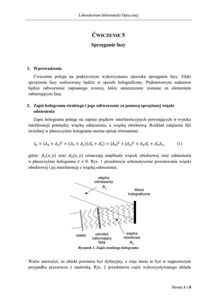 Laboratorium Informatyki Optycznej ĆWICZENIE 5 Sprzęganie fazy 1. Wprowadzenie Ćwiczenie polega na praktycznym wykorzystaniu zjawiska sprzęgania fazy. Efekt sprzężenia fazy realizowany będzie w sposób holograficzny. Podstawowym zadaniem będzie odtworzenie zapisanego wzorca, który umieszczony zostanie za elementem zaburzającym fazę. 2. Zapis hologramu cienkiego i jego odtworzenie za pomocą sprzężonej wiązki odniesienia Zapis hologramu polega na zapisie prążków interferencyjnych powstających w wyniku interferencji pomiędzy wiązką odniesienia, a wiązką obiektową. Rozkład natężenia fali świetlnej w płaszczyźnie hologramu można opisać równaniem: | | ( )( ) | | | | , (1) gdzie: ( ) oraz ( ) oznaczają amplitudy wiązek obiektowej oraz odniesienia w płaszczyźnie hologramu . Rys. 1 przedstawia schematycznie powstawanie wiązki obiektowej i jej interferencję z wiązką odniesienia. Rysunek 1. Zapis cienkiego hologramu Warto zauważyć, że obiekt powinien być dyfuzyjny, a więc może to być w najprostszym przypadku przezrocze z matówką. Rys. 2 przedstawia część wykorzystywanego układu Strona 1 z 8 Laboratorium Informatyki Optycznej opisującą powstawanie wiązki obiektowej, gdzie: ( ) – funkcja przeźrocza, funkcja matówki, ( ) – funkcja ośrodka zniekształcającego. ( )– Rysunek 2. Część wykorzystywanego układu – powstawanie wiązki obiektowej Funkcja ( ) oznacza obiekt 2D, który ma być zapisany i odtworzony z hologramu. Obraz ( ) jest mnożony przez funkcję losowej fazy ( ), czyli matówkę. Iloczyn ( ) ( ) po propagacji na zadaną odległość jest mnożony przez drugą funkcję losowej fazy ( ), która jest niezależna od funkcji ( ). Funkcja ( ) odpowiada elementowi zaburzającemu fazę. Funkcja ( ) oraz ( ) są tak dobrane, ( ) ( ) ) oraz ( ) aby były losowymi funkcjami fazy oraz , gdzie ( są z przedziału . Aby zrozumieć istotę zjawiska wyobraźmy sobie sytuację, w której pewien front falowy („1” na Rys. 3) propaguje się przez ośrodek zaburzający, którym w tym przypadku jest szkło. Ta jego część, która przeszła przez szkło doznała opóźnienia fazowego „2”, więc kształt tego frontu się zmienił. W przypadku, gdy taka fala odbije się od zwykłego zwierciadła to kształt tego frontu falowego nie zmieni się („3” na Rys. 3a – te fragmenty frontu falowego, które były „z przodu” są dalej „z przodu”, a te co były za nimi dalej są za nimi), a jedynie będzie się on poruszał w przeciwną stronę (przeciwbieżnie względem „2”). Przy ponownym przejściu przez ośrodek zaburzający (szkło) front falowy dozna kolejnego opóźnienia i utworzy falę zupełnie inną „4” niż fala początkowo padająca na nasz układ „1”. Natomiast w przypadku odbicia frontu falowego „2” od zwierciadła sprzęgającego fazę – nie dość, że front „3” będzie się poruszał przeciwbieżnie to jeszcze będzie miał sprzężony rozkład fazy względem frontu „2” – fragmenty frontu falowego, które były „z przodu” są teraz z tyłu i na odwrót. Dlatego po ponownym przejściu przez ośrodek zaburzający propagujący się front falowy „4” będzie miał rozkład fazy taki sam jak padający front falowy „1”. a) Strona 2 z 8 Laboratorium Informatyki Optycznej b) Rysunek 3. Zasada działania a) zwykłego zwierciadła oraz b) zwierciadła sprzęgającego fazę Wprowadzane przez ośrodek zaburzenie fazowe może zostać zniwelowane poprzez wygenerowanie fali do niego sprzężonej i propagację takiej fali przez ośrodek zaburzający (co schematycznie pokazuje rys. 3, który ilustruje różnicę pomiędzy odbiciem zwykłym oraz sprzężonym). Należy pamiętać, że w przypadku klasycznych zwierciadeł padający front falowy jest odbijany w taki sposób, że po odbiciu otrzymujemy front falowy wyglądający tak samo jak przed odbiciem, czyli tak jakby nie było zwierciadła na drodze propagacji, ale propaguje się on przeciwbieżnie. Gdybyśmy odbili front falowy od zwierciadła „sprzęgającego fazę”, front odbity byłby identyczny z frontem padającym. Falą sprzężoną do fali sferycznej rozbieżnej jest fala sferycznie zbieżna o tym samym promieniu krzywizny. W przypadku fali płaskiej, falą sprzężoną będzie fala płaska propagująca się w przeciwną stronę (będzie względem niej przeciwbieżna). W przypadku rekonstrukcji zapisanego hologramu, tak aby wiązka odtwarzająca była sprzężona do wiązki odniesienia, musi on być oświetlony jedną wiązką odtwarzającą A2 ( x, y) przeciwbieżną do wiązki odniesienia i padającą na hologram z prawej strony. Rysunek 4. Optyczne odtworzenie hologramu cienkiego Odtwarzając hologram wiązką ( ), otrzymujemy zależność w takiej sytuacji opisane wzorem: ( ), która ma sprzężoną fazę do wiązki odniesienia , a więc pole po lewej stronie hologramu jest Strona 3 z 8 Laboratorium Informatyki Optycznej (| | | | (| ) | | | ) ( ) | | (2) | | ) - jest proporcjonalny do pola Pierwszy składnik w zależności (2): (| | . W przypadku cienkiego hologramu możemy powiedzieć, że składnik ( ) ma ⃗ ) ( ⃗ czynnik fazowy , w którym faza jest niedopasowana. Interesuje nas składnik | | | | , który dla odpowiada „odwróceniu czasowemu” sprzężonej fazy wiązki obiektowej . 3. Realizacja sprzężenia fazowego Jeśli rozumiemy już ideę zapisu i odczytu hologramu cienkiego przejdźmy teraz do części, w której przedstawiona zostanie idea wykorzystywana w naszym ćwiczeniu, a mianowicie realizacja sprzężenia fazowego. Wiązka propagująca się przez ośrodek zaburzający fazę w kierunku powoduje zaburzenie frontu falowego opisane następującym równaniem: ( ) | ( ) ( ) | | ( ) |. (3) Zależność pomiędzy oraz odzwierciedla modulację przestrzenną frontu falowego pochodzącego od informacji wejściowej, efektów zniekształceń oraz dyfrakcji. W niektórych obszarach przestrzeni bliskich odległości wy