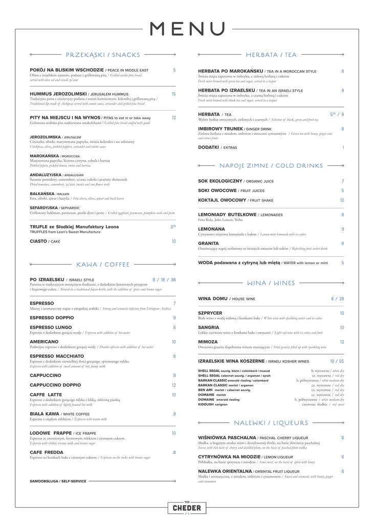 PRZEKĄSKI / SNACKS menu 5 POKÓJ NA BLISKIM WSCHODZIE / PEACE IN MIDDLE EAST Oliwa z izraelskim zatarem, podana z grillowaną pitą / Grilled arabic pita bread served with olive oil and israeli za’atar HERBATA / TEA 8 HERBATA PO MAROKAŃSKU / TEA IN A MOROCCAN STYLE Świeża mięta zaparzona w imbryku, z zieloną herbatą i cukrem Fresh mint brewed with green tea and sugar, served in a teapot 15 HUMMUS JEROZOLIMSKI / JERUSALEM HUMMUS Tradycyjna pasta z ciecierzycy podana z sosem kuminowym, kolendrą i grillowaną pitą / Traditional dip made of chickpeas served with cumin sauce, coriander and grilled pita bread 12 PITY NA MIEJSCU I NA WYNOS / PITAS to eat in or take away Grilowana arabska pita nadziewana smakołykami / Grilled pita bread stuffed with goods 8 HERBATA PO IZRAELSKU / TEA IN AN ISRAELI STYLE Świeża mięta zaparzona w imbryku, z czarną herbatą i cukrem Fresh mint brewed with black tea and sugar, served in a teapot HERBATA / TEA Wybór herbat owocowych, zielonych i czarnych / Selection of black, green and fruit tea 550 / 8 IMBIROWY TRUNEK / GINGER DRINK 8 DODATKI 1 Zielona herbata z miodem, imbirem i owocami cytrusowymi / Green tea with honey, ginger root and citrus fruits JEROZOLIMSKA / JERUSALEM Cieciorka, oliwki, marynowana papryka, świeża kolendra i sos tahinowy Chickpeas, olives, pickled peppers, coriander and tahini sauce / EXTRAS MAROKAŃSKA / MOROCCAN Marynowana papryka, kiszona cytryna, cebula i harrisa Pickled pepers, pickled lemon, onion and harrisa NAPOJE ZIMNE / COLD DRINKS ANDALUZYJSKA / ANDALUSIAN Suszone pomidory, camembert, za’atar, rukola i prażony słonecznik Dried tomatoes, camembert, za’atar, rucola and sun flower seeds BAŁKAŃSKA / BALKAN Feta, oliwki, ajwar i bazylia / Feta cheese, olives, ajwar and basil leaves SOK EKOLOGICZNY / ORGANIC JUICE 7 SOKI OWOCOWE / FRUIT JUICES 5 KOKTAJL OWOCOWY / FRUIT SHAKE 10 LEMONIADY BUTELKOWE 8 SEFARDYJSKA / SEPHARDIC Grillowany bakłażan, parmezan, pestki dyni i pesto / Grilled eggplant, parmesan, pumpkin seeds and pesto / LEMONADES Fritz Kola, John Lemon, Yerba TRUFLE ze Słodkiej Manufaktury Leona TRUFFLES from Leon’s Sweet Manufacture 350 9 LEMONANA Cytrynowo miętowa lemoniada z lodem / Lemon-mint lemonade with ice cubes 10 CIASTO / CAKE 8 GRANITA Orzeźwiający napój sorbetowy ze świeżych owoców lub soków / Refreshing fruit sorbet drink / ISRAELI STYLE 9 / 18 Parzona w tradycyjnym mosiężnym findżanie, z dodatkiem korzennych przypraw i brązowego cukru / Brewed in a traditional finjan kettle, with the addition of spices and brown sugar PO IZRAELSKU / 36 ESPRESSO Mocny i aromatyczny napar z etiopskiej arabiki / Strong and aromatic infusion from Ethiopian Arabica 7 WINA / WINES WINA DOMU 8 / 28 / HOUSE WINE 9 Białe wino z wodą sodową i kostkami lodu / White wine with sparkling water and ice cubes ESPRESSO LUNGO 8 SANGRIA 10 MIMOZA AMERICANO Podwójne espresso z dodatkiem gorącej wody / Double espresso with addition of hot water ESPRESSO MACCHIATO Espresso z dodatkiem niewielkiej ilości gorącego, spienionego mleka Espresso with addition of small amount of hot, foamy milk 8 CAPPUCCINO 9 CAPPUCCINO DOPPIO 12 CAFFE LATTE 10 Espresso z dodatkiem gorącego mleka z lekką, mleczną pianką Espresso with addition of lightly foamed hot milk BIAŁA KAWA / WHITE COFFEE Espresso z ciepłym mlekiem / Espresso with warm milk LODOWE FRAPPE / ICE FRAPPE Espresso ze zmrożonym, kremowym mlekiem i ciemnym cukrem Espresso with chilled, creamy milk and brown sugar CAFE FREDDA Espresso na kostkach lodu z ciemnym cukrem / Espresso on the rocks with brown sugar 10 SZPRYCER ESPRESSO DOPPIO Espresso z dodatkiem gorącej wody / Espresso with addition of hot water 5 WODA podawana z cytryną lub miętą / WATER with lemon or mint KAWA / COFFEE 10 Lekkie czerwone wino z kostkami lodu i owocami / Light red wine with ice cubes and fruit 12 Owocowa granita dopełniona winem musującym / Fruit granita filled up with sparkling wine IZRAELSKIE WINA KOSZERNE / ISRAELI KOSHER WINES SHELL SEGAL sauvig. blanc / colombard / muscat SHELL SEGAL cabernet sauvig. / argaman / syrah BARKAN CLASSIC emerald riesling / colombard BARKAN CLASSIC merlot / argaman BEN AMI merlot / cabernet sauvig. DOMAINE merlot DOMAINE emerald riesling KIDDUSH carignan 10 / 55 b. wytrawne / white dry cz. wytrawne / red dry b. półwytrawne / white medium-dry cz. wytrawne / red dry cz. wytrawne / red dry cz. wytrawne / red dry b. półwytrawne / white medium-dry czerwone słodkie / red sweet 9 NALEWKI / LIQUEURS 10 8 WIŚNIÓWKA PASCHALNA / PASCHAL CHERRY LIQUEUR Słodka, o bogatym smaku wiśni i destylowanej śliwki, na bazie śliwowicy paschalnej Sweet, with rich taste of cherry and distilled plum, on the basis of paschal plum vodka CYTRYNÓWKA NA MIODZIE / LEMON LIQUEUR Półsłodka, na bazie spirytusu z miodem / Semi-sweet, on the basis of spirit with honey NALEWKA ORIENTALNA / ORIENTAL FRUIT LIQUEUR SAMOOBSŁUGA / SELF-SERVICE Słodka i aromatyczna, z miodem, imbirem i cynamonem / Sweet and aromatic, with honey, ginger and cinnamon 6 6 6