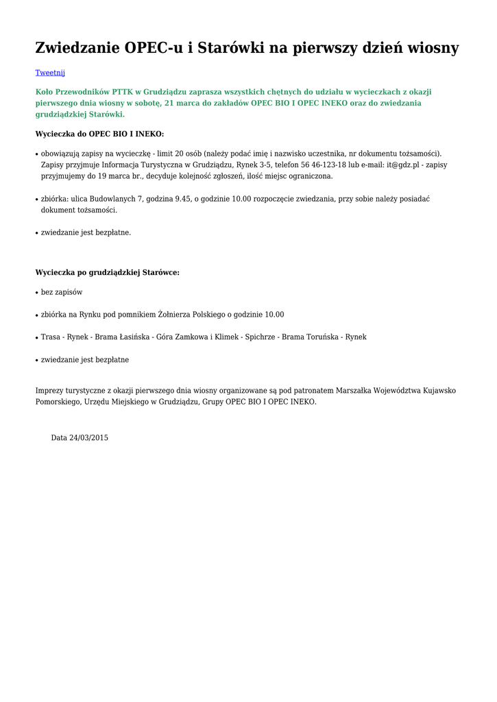 Zwiedzanie OPEC-u i Starówki na pierwszy dzień wiosny Tweetnij Koło Przewodników PTTK w Grudziądzu zaprasza wszystkich chętnych do udziału w wycieczkach z okazji pierwszego dnia wiosny w sobotę, 21 marca do zakładów OPEC BIO I OPEC INEKO oraz do zwiedzania grudziądzkiej Starówki. Wycieczka do OPEC BIO I INEKO: ● ● ● obowiązują zapisy na wycieczkę - limit 20 osób (należy podać imię i nazwisko uczestnika, nr dokumentu tożsamości). Zapisy przyjmuje Informacja Turystyczna w Grudziądzu, Rynek 3-5, telefon 56 46-123-18 lub e-mail: [email protected] - zapisy przyjmujemy do 19 marca br., decyduje kolejność zgłoszeń, ilość miejsc ograniczona. zbiórka: ulica Budowlanych 7, godzina 9.45, o godzinie 10.00 rozpoczęcie zwiedzania, przy sobie należy posiadać dokument tożsamości. zwiedzanie jest bezpłatne. Wycieczka po grudziądzkiej Starówce: ● bez zapisów ● zbiórka na Rynku pod pomnikiem Żołnierza Polskiego o godzinie 10.00 ● Trasa - Rynek - Brama Łasińska - Góra Zamkowa i Klimek - Spichrze - Brama Toruńska - Rynek ● zwiedzanie jest bezpłatne Imprezy turystyczne z okazji pierwszego dnia wiosny organizowane są pod patronatem Marszałka Województwa Kujawsko Pomorskiego, Urzędu Miejskiego w Grudziądzu, Grupy OPEC BIO I OPEC INEKO. Data 24/03/2015
