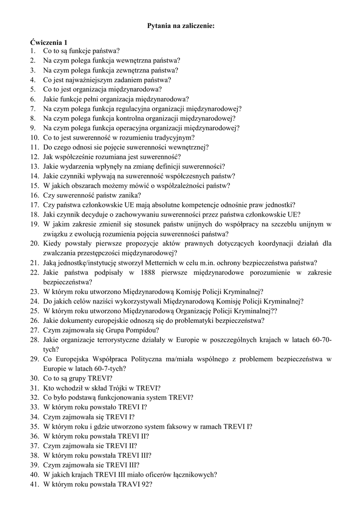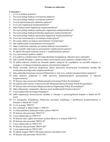 Pytania na zaliczenie: Ćwiczenia 1 1. Co to są funkcje państwa? 2. Na czym polega funkcja wewnętrzna państwa? 3. Na czym polega funkcja zewnętrzna państwa? 4. Co jest najważniejszym zadaniem państwa? 5. Co to jest organizacja międzynarodowa? 6. Jakie funkcje pełni organizacja międzynarodowa? 7. Na czym polega funkcja regulacyjna organizacji międzynarodowej? 8. Na czym polega funkcja kontrolna organizacji międzynarodowej? 9. Na czym polega funkcja operacyjna organizacji międzynarodowej? 10. Co to jest suwerenność w rozumieniu tradycyjnym? 11. Do czego odnosi sie pojęcie suwerenności wewnętrznej? 12. Jak współcześnie rozumiana jest suwerenność? 13. Jakie wydarzenia wpłynęły na zmianę definicji suwerenności? 14. Jakie czynniki wpływają na suwerenność współczesnych państw? 15. W jakich obszarach możemy mówić o współzależności państw? 16. Czy suwerenność państw zanika? 17. Czy państwa członkowskie UE mają absolutne kompetencje odnośnie praw jednostki? 18. Jaki czynnik decyduje o zachowywaniu suwerenności przez państwa członkowskie UE? 19. W jakim zakresie zmienił się stosunek państw unijnych do współpracy na szczeblu unijnym w związku z ewolucją rozumienia pojęcia suwerenności państwa? 20. Kiedy powstały pierwsze propozycje aktów prawnych dotyczących koordynacji działań dla zwalczania przestępczości międzynarodowej? 21. Jaką jednostkę/instytucję stworzył Metternich w celu m.in. ochrony bezpieczeństwa państwa? 22. Jakie państwa podpisały w 1888 pierwsze międzynarodowe porozumienie w zakresie bezpieczeństwa? 23. W którym roku utworzono Międzynarodową Komisję Policji Kryminalnej? 24. Do jakich celów naziści wykorzystywali Międzynarodową Komisję Policji Kryminalnej? 25. W którym roku utworzono Międzynarodową Organizację Policji Kryminalnej?? 26. Jakie dokumenty europejskie odnoszą się do problematyki bezpieczeństwa? 27. Czym zajmowała się Grupa Pompidou? 28. Jakie organizacje terrorystyczne działały w Europie w poszczególnych krajach w latach 60-70tych? 29. Co Europejska Współpraca Polityczna ma/miała wspólnego z problemem bezpieczeństwa w Europie w latach 60-7-tych? 30. Co to są grupy TREVI? 31. Kto wchodził w skład Trójki w TREVI? 32. Co było podstawą funkcjonowania system TREVI? 33. W którym roku powstało TREVI I? 34. Czym zajmowała się TREVI I? 35. W którym roku i gdzie utworzono system faksowy w ramach TREVI I? 36. W którym roku powstała TREVI II? 37. Czym zajmowała sie TREVI II? 38. W którym roku powstała TREVI III? 39. Czym zajmowała sie TREVI III? 40. W jakich krajach TREVI III miało oficerów łącznikowych? 41. W którym roku powstała TRAVI 92? 42. 43. 44. 45. 46. 47. 48. 49. 50. 51. 52. 53. 54. 55. 56. 57. 58. 59. 60. 61. 62. 63. 64. 65. 66. 67. 68. 69. 70. 71. 72. 73. 74. 75. 76. 77. Czym zajmowała się TREVI 92? W którym roku powstała Grupa Imigracyjna? Czym zajmowała się Grupa Imigracyjna? Kto tworzył Grupę Imigracyjną? W którym roku powstała Europejska Jednostka Łącznikowa? W którym roku powstała Grupa Robocza Policji ds. Terroryzmu? Jakie kraje jako pierwsze weszły w skład Grupy Roboczej Policji ds. Terroryzmu? W którym roku powstała Grupa ad hoc ds. Europolu? Kompetencje których grup TREVI przejęła Grupa ad hoc ds. Europolu? W którym roku powstała Grupa Wzajemnej Pomocy? Kto wchodził w skład Grupy Wzajemnej Pomocy? Czym zajmowała się Grupa Wzajemnej Pomocy? Jakie dokumenty regulowały działanie TREVI? Czego dotyczył Dokument z Palmy? Czego dotyczyła Deklaracja Ministrów TREVI? Czego dotyczył Raport Koordynatorów o rozwoju pracy nad Dokumentami z Palmy? Co uważa się za genezę powstania systemu Schengen? W którym roku Komisja Europejska zaleciła po raz pierwszy złagodzenie a następnie zniesienie kontroli na granicach wewnętrznych? Czy Komisja Europejska rozważając kwestię zniesienia granic wewnętrznych w latach 70-tych dopuszczała możliwość swobodnego przemieszczania się na terenie Wspólnoty obywateli państw trzecich? Jakie państwa sprzeciwiały się w latach 70-tych koncepcji Komisji Europejskiej w zakresie zniesienia granic wewnętrznych? W którym roku stworzono Komitet ad hoc "Obywatelstwa Europejskiego"? W którym roku miało miejsce spotkanie w Saarbrucken, na którym doszło do porozumienia w sprawie ograniczenia kontroli na granicach wewnętrznych? Przedstawiciele jakich państw wzięli udział w spotkaniu Saarbrucken, na którym doszło do porozumienia w sprawie ograniczenia kontroli na granicach wewnętrznych? W którym roku została podpisana Umowa międzyrządowa o stopniowym zniesieniu kontroli na granicach Republiki Francuskiej i Republiki Federalnej Niemiec? W którym roku podpisano Układ o stopniowym znoszeniu kontroli na wspólnych granicach w Schengen? Jakie kraje podpisały układ z Schengen? W jakim kraju podpisano układ z Schengen? Z ilu części składa się układ z Schengen? Z jakich części składa się układ z Schengen? Do końca którego roku miały zostać wprowadzone działania krótkoterminowe, o których mówił układ z Schengen? Czego dotyczyły działania krótkoterminowe, o których mówił układ z Schengen? Do końca którego roku miały zostać zakończone działania długoterminowe, o których mówił układ z Schengen? Czego dotyczyły działania długoterminowe, o których mówił układ z Schengen? Do harmonizacji przepisów prawa krajowego w jakim zakresie zobowiązali się sygnatariusze układu z Schengen? Podstawy współpracy w jakim zakresie tworzono podpisując układ z Schengen? Jakie czynniki spowodowały konieczność dostosowania układu z Schengen do prawa wspólnotowego? 78. 79. 80. 81. 82. 83. 84. 85. 86. 87. 88. 89. 90. 91. 92. W którym roku podpisano Konwencję Wykonawczą do Układu z Schengen? W którym roku weszła w życie Konwencja z Schengen? Z ilu części składała się Konwencja Wykonawcza do Układu z Schengen? Jakie zasady dotyczą