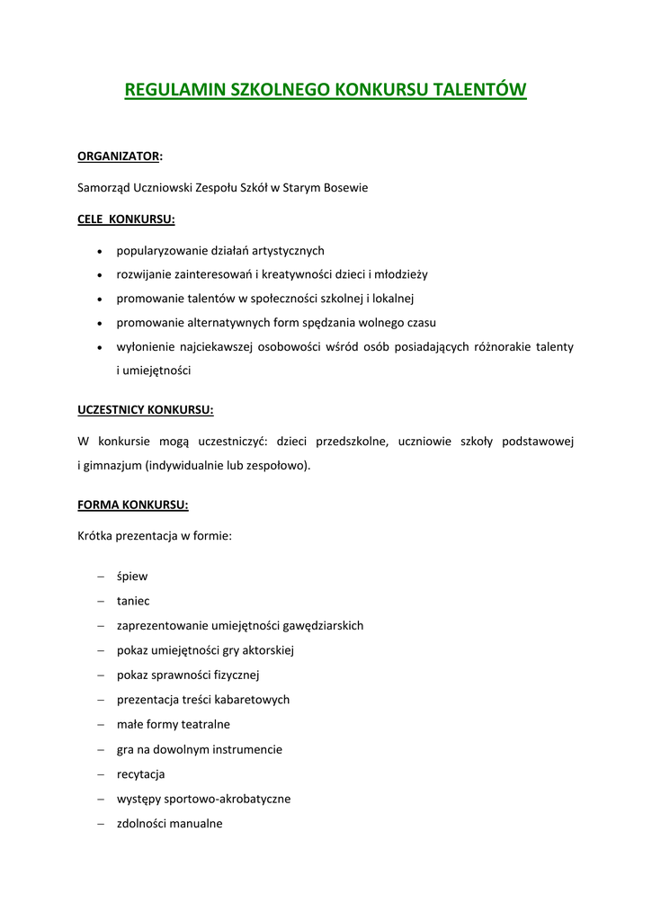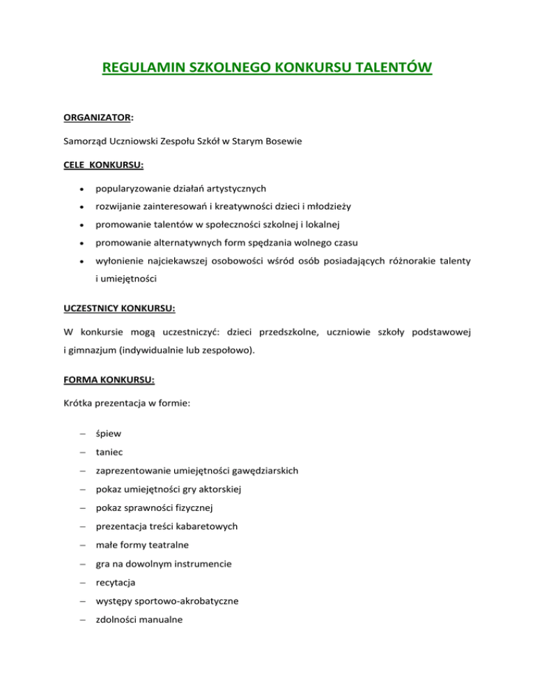 REGULAMIN SZKOLNEGO KONKURSU TALENTÓW ORGANIZATOR: Samorząd Uczniowski Zespołu Szkół w Starym Bosewie CELE KONKURSU: popularyzowanie działań artystycznych rozwijanie zainteresowań i kreatywności dzieci i młodzieży promowanie talentów w społeczności szkolnej i lokalnej promowanie alternatywnych form spędzania wolnego czasu wyłonienie najciekawszej osobowości wśród osób posiadających różnorakie talenty i umiejętności UCZESTNICY KONKURSU: W konkursie mogą uczestniczyć: dzieci przedszkolne, uczniowie szkoły podstawowej i gimnazjum (indywidualnie lub zespołowo). FORMA KONKURSU: Krótka prezentacja w formie: śpiew taniec zaprezentowanie umiejętności gawędziarskich pokaz umiejętności gry aktorskiej pokaz sprawności fizycznej prezentacja treści kabaretowych małe formy teatralne gra na dowolnym instrumencie recytacja występy sportowo-akrobatyczne zdolności manualne inne INFORMACJE OGÓLNE: Występ nie może zawierać treści dyskryminujących lub wulgarnych. Prezentacja nie może być dłuższa niż 5 minut. Dopuszcza się prezentacje dłuższe, nieprzekraczające jednak 10 minut w przypadku występów grup powyżej 3 osób, prezentujących treści kabaretowe lub małe formy teatralne. Uczestnicy są także zobowiązani dostarczyć przed występem wolny od wad nośnik CD audio z nagraniem podkładu muzycznego. Zwycięzcy Finału zostaną wyłonieni przez powołane jury. MIEJSCE REALIZACJI: Przesłuchania – sala kolumnowa Finał konkursu – hala sportowa TERMIN REALIZACJI: Przesłuchania w dniu 18 marca 2016r. Finał w dniu 21 marca 2016r. PRZEBIEG KONKURSU: Organizator zawiadamia o konkursie dzieci przedszkolne, uczniów szkoły podstawowej i gimnazjum. Konkurs składa się z dwóch etapów: przesłuchania w dniu 18 marca 2016r. i finału w dniu 21 marca 2016r. W konkursie zostaną wyłonieni zdobywcy I miejsca. Zostanie przyznana również nagroda publiczności (o zwycięstwie uczestnika decyduje widownia poprzez oddanie głosu na specjalnych kartach). Pozostali finaliści otrzymają dyplomy uczestnictwa. Decyzja organizatora i jury jest ostateczna i niepodważalna. Uczestnicy konkursu podczas całego trwania realizacji konkursu nie mogą dyskutować lub radzić się członków jury w żadnej sprawie dotyczącej ich udziału w programie a w szczególności przebiegu występu przez nich wykonywanego, ich wyglądu lub prezentowanych umiejętności. SPOSÓB I KRYTERIA OCENY UCZESTNIKÓW W KONKURSIE: Prezentacje (występy) oceniane będą przez Komisję Konkursową, która oceni: Oryginalność Ogólne wrażenie artystyczne POSTANOWIENIA KOŃCOWE: O kolejności występów decydują organizatorzy. Informacja o kolejności występów zostanie podana do wiadomości godzinę przed planowanym rozpoczęciem konkursu. Szczegółowe informacje – osoba do kontaktu – p. Anita Skibińska