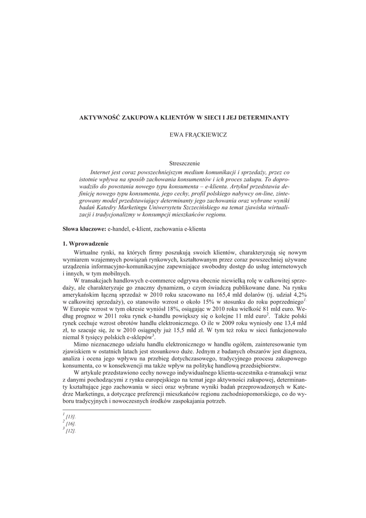 AKTYWNOĝû ZAKUPOWA KLIENTÓW W SIECI I JEJ DETERMINANTY EWA FRCKIEWICZ Streszczenie Internet jest coraz powszechniejszym medium komunikacji i sprzedaĪy, przez co istotnie wpływa na sposób zachowania konsumentów i ich proces zakupu. To doprowadziło do powstania nowego typu konsumenta – e-klienta. Artykuł przedstawia definicjĊ nowego typu konsumenta, jego cechy, profil polskiego nabywcy on-line, zintegrowany model przedstawiający determinanty jego zachowania oraz wybrane wyniki badaĔ Katedry Marketingu Uniwersytetu SzczeciĔskiego na temat zjawiska wirtualizacji i tradycjonalizmy w konsumpcji mieszkaĔców regionu. Słowa kluczowe: e-handel, e-klient, zachowania e-klienta 1. Wprowadzenie Wirtualne rynki, na których firmy poszukuj swoich klientów, charakteryzuj si nowym wymiarem wzajemnych powiza rynkowych, kształtowanym przez coraz powszechniej uywane urzdzenia informacyjno-komunikacyjne zapewniajce swobodny dostp do usług internetowych i innych, w tym mobilnych. W transakcjach handlowych e-commerce odgrywa obecnie niewielk rol w całkowitej sprzeday, ale charakteryzuje go znaczny dynamizm, o czym wiadcz publikowane dane. Na rynku amerykaskim łczn sprzeda w 2010 roku szacowano na 165,4 mld dolarów (tj. udział 4,2% w całkowitej sprzeday), co stanowiło wzrost o około 15% w stosunku do roku poprzedniego1. W Europie wzrost w tym okresie wyniósł 18%, osigajc w 2010 roku wielko 81 mld euro. Według prognoz w 2011 roku rynek e-handlu powikszy si o kolejne 11 mld euro2. Take polski rynek cechuje wzrost obrotów handlu elektronicznego. O ile w 2009 roku wyniosły one 13,4 mld zł, to szacuje si, e w 2010 osignły ju 15,5 mld zł. W tym te roku w sieci funkcjonowało niemal 8 tysicy polskich e-sklepów3. Mimo nieznacznego udziału handlu elektronicznego w handlu ogółem, zainteresowanie tym zjawiskiem w ostatnich latach jest stosunkowo due. Jednym z badanych obszarów jest diagnoza, analiza i ocena jego wpływu na przebieg dotychczasowego, tradycyjnego procesu zakupowego konsumenta, co w konsekwencji ma take wpływ na polityk handlow przedsibiorstw. W artykule przedstawiono cechy nowego indywidualnego klienta-uczestnika e-transakcji wraz z danymi pochodzcymi z rynku europejskiego na temat jego aktywnoci zakupowej, determinanty kształtujce jego zachowania w sieci oraz wybrane wyniki bada przeprowadzonych w Katedrze Marketingu, a dotyczce preferencji mieszkaców regionu zachodniopomorskiego, co do wyboru tradycyjnych i nowoczesnych rodków zaspokajania potrzeb. 1 [13]. [16]. 3 [12]. 2 6 Ewa Frąckiewicz AktywnoĞü zakupowa klientów w sieci i jej determinanty 2. Sylwetka nowego klienta Globalna sie Internet, znana od prawie 30 lat, a na polskim rynku obecna ju od 20, zmienia zachowania konsumentów w wielu obszarach, w tym take w obszarze zakupów. Znajduje to swoje odzwierciedlenie w postawach, zachowaniach i opiniach klienta nowego typu – e-klienta. Konsumenta ery informacji okrela si jako jednostk, która konsumuje towary i usługi przy wykorzystaniu Internetu, aby w ten sposób ułatwi sobie proces konsumpcji składajcy si z identyfikacji potrzeb, wyszukiwania rozwiza, zakupu, odpowiadania na nurtujce pytania i rozwizywanie problemów4. E-konsumenci s uczestnikami transakcji wystpujcymi zarówno po stronie kupujcych (rynek B2C i C2C) jak i sprzedajcych (rynek C2C), a przedmiotem wymiany s towary i usługi. Wirtualni nabywcy aktywnie uczestnicz przede wszystkim w dwóch formach e-handlu tj. w aukcjach internetowych oraz sklepach on-line, coraz czciej poszukujc ofert z wykorzystaniem porównywarek cen. Ich aktywno zakupowa objawia si w zawieraniu transakcji jak równie poszukiwaniu informacji i umieszczaniu komentarzy, rekomendacji czy opinii. E-klient znacznie róni si od sylwetki klienta tradycyjnego. Przede wszystkim posiada on wikszy i łatwiejszy dostp do szerokich i zrónicowanych ródeł informacji, a tym samym istotnemu wzmocnieniu ulega jego pozycja negocjacyjna wzgldem firmy. Nowy klient oczekuje swobody wyboru miejsca i czasu zapoznania si z ofert, jest bardziej krytyczny wobec przekazywanych mu informacji i chtnie je konfrontuje z dowiadczeniami innych uytkowników danego produktu czy marki. Tym samym, mimo i nadal główn korzyci z dostpu do globalnej sieci pozostaje moliwo szybkiego znalezienia poszukiwanej informacji, to Internet przeobraa cały proces zakupowy, od etapu pobudzenia potrzeby po moment zawarcia transakcji i reakcje posprzedaowe. Poszukujc odpowiedzi na pytanie jaka jest typologia konsumentów online mona odwoła si do wyrónionych przez socjologów pokole: „cichych”, baby boomers (yuppies), pokolenia X oraz pokolenia Y. Najstarsza grupa, ze wzgldu na swoje dowiadczenia kryzysu lat 30. XX wieku i II wojny wiatowej z pewnoci w mniejszym stopniu ni baby boomers jest nastawiona na osignicie osobistego sukcesu. Urodzonych po zakoczeniu II wojny wiatowej, ale przed 1959, cechuje typowo konsumpcyjne podejcie (dzisiaj nazywane jest papy boomers, ze wzgldu na osignity wiek). Pokolenie X, podobnie jak poprzednie, odrzucało filozofi ycia swoich rodziców. Urodzeni w latach 60. i 70. XX wieku uznaj sukces i konsumpcjonizm za wizy krpujce ich moliwoci samorealizacji. Ceni za to swobod obyczajów i wolno wypowiedzi5. Nowe pokolenie okrelane jest mianem generacji Y, cho moe by opisywane równie jako video kids, pokolenie milenijne, generacja sieci itp. Urodzeni po 1980 roku, wychowani na przekazie telewizyjnym, znacznie zobojtnieli na sił jego perswazji. Swobodny dostp do rónorodnych ródeł informacji z jednej strony uodpornił ich na szum informacyjny, a z drugiej – pozwala im by bardziej wiadomymi wiata, w którym yj. Osoby nalece do generacji sieci wyrónia osiem zasadniczych cech6: 1. freedom – poszukiwanie wolnoci, rónie rozumianej i wyraanej, std te czasami mówi si o syndromie butterfly customer, czyli o konsumentach chtnie zmieniajcych marki, firmy, 2. customization – poszukiwanie produktów wyjtkowych, innych, tworzonych na indywid