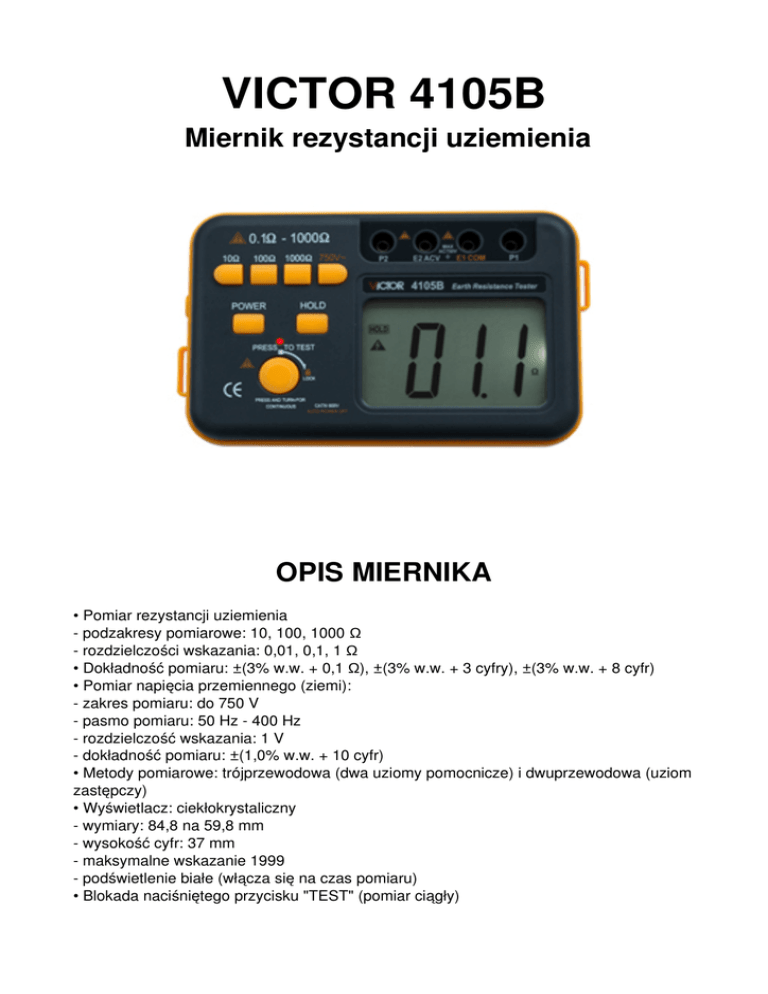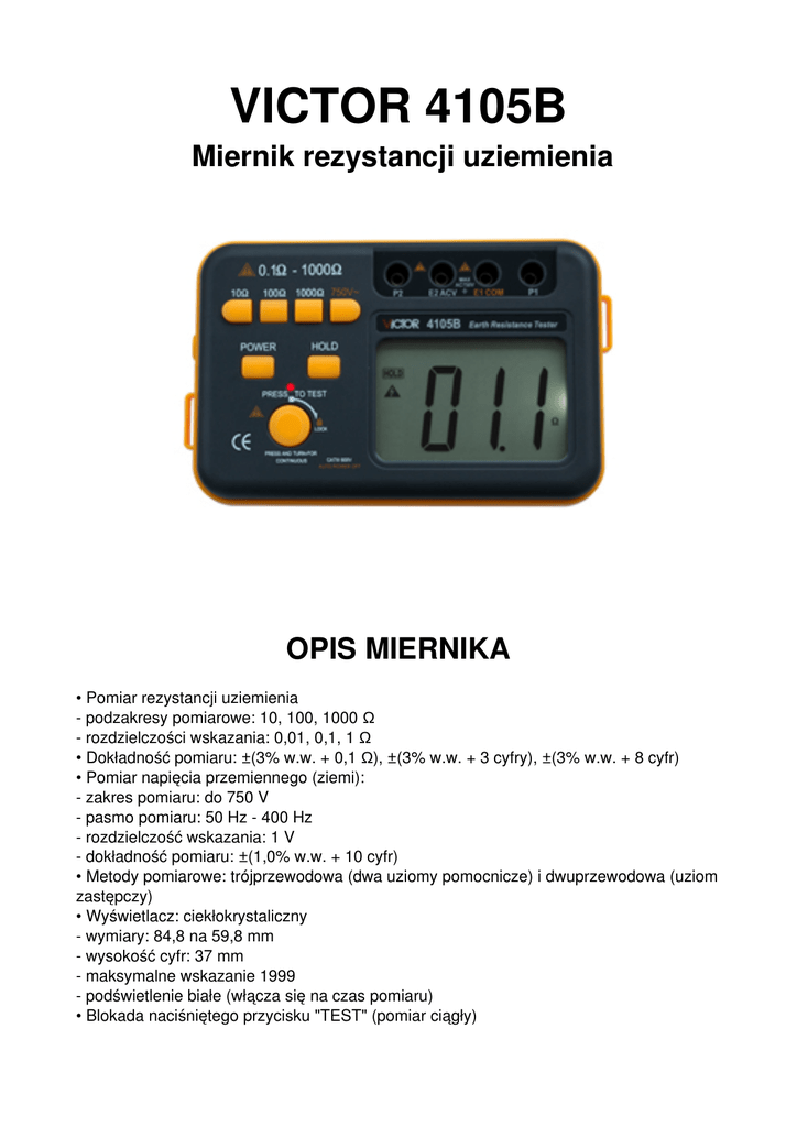 VICTOR 4105B Miernik rezystancji uziemienia OPIS MIERNIKA • Pomiar rezystancji uziemienia podzakresy pomiarowe: 10, 100, 1000 Ω rozdzielczości wskazania: 0,01, 0,1, 1 Ω • Dokładność pomiaru: ±(3% w.w. + 0,1 Ω), ±(3% w.w. + 3 cyfry), ±(3% w.w. + 8 cyfr) • Pomiar napięcia przemiennego (ziemi): zakres pomiaru: do 750 V pasmo pomiaru: 50 Hz 400 Hz rozdzielczość wskazania: 1 V dokładność pomiaru: ±(1,0% w.w. + 10 cyfr) • Metody pomiarowe: trójprzewodowa (dwa uziomy pomocnicze) i dwuprzewodowa (uziom zastępczy) • Wyświetlacz: ciekłokrystaliczny wymiary: 84,8 na 59,8 mm wysokość cyfr: 37 mm maksymalne wskazanie 1999 podświetlenie białe (włącza się na czas pomiaru) • Blokada naciśniętego przycisku "TEST" (pomiar ciągły) • Zasilanie: 12 V, 8 baterii alkalicznych typu LR6 pobór mocy w trakcie testu bez obciążenia: ≤800 mW automatyczne wyłączanie zasilania gniazdo zewnętrznego zasilania 12 V • Zakres temperatur pracy: 0°C 40°C • Zakres wilgotności względnych pracy: 30% 85% • Wymiary całkowite: 175 x 110 x 70 [mm] • Masa: ok. 600 g (z bateriami) • Akcesoria: torba miękka, z paskiem, dwukomorowa, zamykana na suwak błyskawiczny, z pokrywą zamykaną na rzep pasek do zawieszenia przyrządu na szyi 2 uziomy prętowe 3 przewody pomiarowe (czerwony 15 m, żółty 10 m, zielony 5 m) zakończone z jednej strony wtykami bananowymi bezpiecznymi, a z drugiej chwytakami krokodylowymi izolowanymi podwójny przewód pomiarowy (zielony i czerwony) zakończony z jednej strony wtykami bananowymi bezpiecznymi, a z drugiej chwytakami krokodylowymi izolowanymi, długość 1,6 m 8 szt. baterii alkalicznych LR6 Firma Pomiarowa Tadeusz Piwkowski Al. Jerozolimskie 200 lok. 527, 02486 Warszawa tel. 664 082 832 [email protected] www.wzorcowaniemiernikow.pl