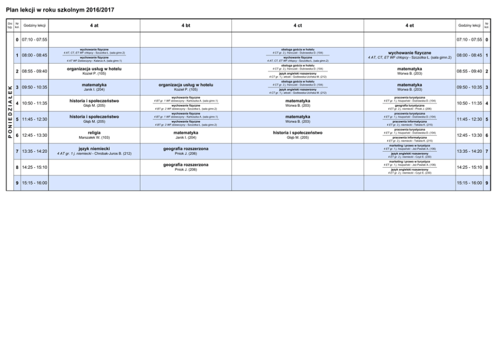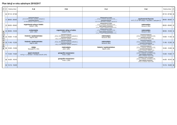 Plan lekcji w roku szkolnym 2016/2017 Dni Nr tyg. kol. Godziny lekcji 4 at 4 bt 4 ct 4 et 0 07:10 - 07:55 1 08:00 - 08:45 PONIEDZIAŁEK 2 08:55 - 09:40 3 09:50 - 10:35 4 10:50 - 11:35 5 11:45 - 12:30 6 12:45 - 13:30 7 13:35 - 14:20 8 14:25 - 15:10 9 15:15 - 16:00 Godziny lekcji Nr kol. 07:10 - 07:55 0 wychowanie fizyczne obsługa gościa w hotelu 4 AT, CT, ET WF chłopcy - Szczotka Ł. (sala gimn.2) 4 CT gr. 2 j. francuski - Dubrawska D. (104) wychowanie fizyczne wychowanie fizyczne wychowanie fizyczne 4 AT WF Dziewczyny - Kalarus A. (sala gimn.1) 4 AT, CT, ET WF chłopcy - Szczotka Ł. (sala gimn.2) 4 AT, CT, ET WF chłopcy - Szczotka Ł. (sala gimn.2) organizacja usług w hotelu 4 CT gr. 2 j. francuski - Dubrawska D. (104) matematyka Kozieł P. (105) język angielski rozszerzony Worwa B. (203) obsługa gościa w hotelu 4 CT gr. 1 j. włoski - Godlewska-Ucińska M. (212) obsługa gościa w hotelu matematyka organizacja usług w hotelu 4 CT gr. 2 j. francuski - Dubrawska D. (104) matematyka Janik I. (204) Kozieł P. (105) język angielski rozszerzony Worwa B. (203) historia i społeczeństwo 4 BT gr. 1 WF dziewczyny - Karkoszka A. (sala gimn.1) matematyka wychowanie fizyczne Worwa B. (203) Głąb M. (205) historia i społeczeństwo Głąb M. (205) wychowanie fizyczne 4 BT gr. 2 WF dziewczyny - Szczotka Ł. (sala gimn.2) wychowanie fizyczne 4 CT gr. 1 j. włoski - Godlewska-Ucińska M. (212) 4 BT gr. 1 WF dziewczyny - Karkoszka A. (sala gimn.1) matematyka wychowanie fizyczne Worwa B. (203) 4 BT gr. 2 WF dziewczyny - Szczotka Ł. (sala gimn.2) religia matematyka historia i społeczeństwo Marszałek W. (103) Janik I. (204) Głąb M. (205) język niemiecki geografia rozszerzona 4 AT gr. 1 j. niemiecki - Chrobak-Juros B. (212) Pniok J. (206) geografia rozszerzona Pniok J. (206) 08:00 - 08:45 1 08:55 - 09:40 2 09:50 - 10:35 3 pracownia turystyczna 4 ET gr. 1 j. hiszpański - Dubrawska D. (104) geografia turystyczna 10:50 - 11:35 4 4 ET gr. 2 j. niemiecki - Pniok J. (206) pracownia turystyczna 4 ET gr. 1 j. hiszpański - Dubrawska D. (104) pracownia informatyczna 11:45 - 12:30 5 4 ET gr. 2 j. niemiecki - Tekiela K. (215) pracownia turystyczna 4 ET gr. 1 j. hiszpański - Dubrawska D. (104) pracownia informatyczna 12:45 - 13:30 6 4 ET gr. 2 j. niemiecki - Tekiela K. (215) marketing i prawo w turystyce 4 ET gr. 1 j. hiszpański - Jeż-Pawlak A. (106) język angielski rozszerzony 13:35 - 14:20 7 4 ET gr. 2 j. niemiecki - Czyż E. (230) marketing i prawo w turystyce 4 ET gr. 1 j. hiszpański - Jeż-Pawlak A. (106) język angielski rozszerzony 14:25 - 15:10 8 4 ET gr. 2 j. niemiecki - Czyż E. (230) 15:15 - 16:00 9 0 07:10 - 07:55 1 08:00 - 08:45 2 08:55 - 09:40 WTOREK 3 09:50 - 10:35 4 10:50 - 11:35 07:10 - 07:55 0 obsługa gościa w hotelu podstawy dietetyki 4 AT gr. 2 j. hiszpański - Sadłek B. (101) 4 BT gr. 1 j. niemiecki - Nowak J. (13) religia geografia rozszerzona podstawy marketingu i zarządzania pracownia hotelarska 4 AT gr. 1 j. niemiecki - Jeż-Pawlak A. (106) 4 BT gr. 2 j. hiszpański - Winiarska Hankus J. (226) Kliś M. (207) Pniok J. (206) obsługa gościa w hotelu podstawy dietetyki 4 AT gr. 2 j. hiszpański - Sadłek B. (101) 4 BT gr. 1 j. niemiecki - Nowak J. (13) religia geografia rozszerzona podstawy marketingu i zarządzania pracownia hotelarska 4 AT gr. 1 j. niemiecki - Jeż-Pawlak A. (106) 4 BT gr. 2 j. hiszpański - Winiarska Hankus J. (226) Kliś M. (207) Pniok J. (206) obsługa gościa w hotelu podstawy marketingu i zarządzania język angielski rozszerzony język angielski rozszerzony 4 AT gr. 2 j. hiszpański - Sadłek B. (101) 4 BT gr. 1 j. niemiecki - Jeż-Pawlak A. (106) 4 CT gr. 2 j. francuski - Godlewska-Ucińska M. (218) 4 ET gr. 1 j. hiszpański - Czyż E. (230) podstawy dietetyki język angielski rozszerzony pracownia hotelarska język niemiecki 4 AT gr. 1 j. niemiecki - Nowak J. (13) 4 BT gr. 2 j. hiszpański - Dziewiński P. (206) 4 CT gr. 1 j. włoski - Winiarska Hankus J. (226) 4 ET gr. 2 j. niemiecki - Chrobak-Juros B. (212) język angielski rozszerzony podstawy marketingu i zarządzania język angielski rozszerzony 4 AT gr. 2 j. hiszpański - Raczek K. (230) 4 BT gr. 1 j. niemiecki - Jeż-Pawlak A. (106) 4 CT gr. 2 j. francuski - Godlewska-Ucińska M. (218) historia i społeczeństwo podstawy dietetyki język angielski rozszerzony pracownia hotelarska 4 AT gr. 1 j. niemiecki - Nowak J. (13) 4 BT gr. 2 j. hiszpański - Dziewiński P. (206) 4 CT gr. 1 j. włoski - Winiarska Hankus J. (226) Głąb M. (205) 4 AT gr. 2 j. hiszpański - Raczek K. (230) godzina do dyspozycji wychowawcy język polski organizacja pracy w recepcji Górska D. (102) Knyps K. (207) język angielski rozszerzony 5 11:45 - 12:30 4 AT gr. 1 j. niemiecki - Sadłek B. (218) 6 12:45 - 13:30 7 13:35 - 14:20 historia i społeczeństwo Głąb M. (205) 09:50 - 10:35 3 10:50 - 11:35 4 język angielski zawodowy 11:45 - 12:30 5 4 ET gr. 2 j. niemiecki - Czyż E. (212) 4 BT gr. 1 j. niemiecki - Górska D. (102) wychowanie fizyczne język hiszpański 4 CT gr. 1 WF dziewczyny (WF 1) - Thiel E. (sala gimn.2) 4 BT gr. 2 j. hiszpański - Stadnicka M. (230) 08:55 - 09:40 2 organizacja imprez i usług turystycznych 4 ET gr. 1 j. hiszpański - Nawrocka-Kaniewska A. (217) język angielski rozszerzony organizacja imprez i usług turystycznych 4 ET gr. 1 j. hiszpański - Nawrocka-Kaniewska A. (217) język angielski zawodowy 4 BT gr. 1 j. niemiecki - Dziewiński P. (218) wychowanie fizyczne Tomkiewicz A. (201) organizacja pracy w recepcji 4 ET WF Dziewczyny (WF 1) - Thiel E. (sala gimn.4) 4 BT gr. 2 j. hiszpański - Górska D. (102) 12:45 - 13:30 6 4 ET gr. 2 j. niemiecki - Czyż E. (212) geografia rozszerzona język angielski rozszerzony 8 14:25 - 15:10 13:35 - 14:20 7 14:25 - 15:10 8 4 BT gr. 1 j. niemiecki - Dziewiński P. (218) 9 15:15 - 16:00 15:15 - 16:00 9 0 07:10 - 07:55 07:10 - 07:55 0 2 08:55 - 09:40 3 09:50 - 10:35 4 AT gr. 2 j. hiszpański - Sadłek B. (105) Kliś M. (207) matematyka historia i społ