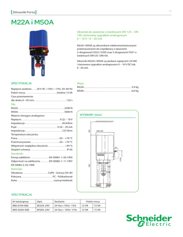 01 Siłowniki Forta M22A i M50A Siłownik do zaworów o średnicach DN 125 – DN 150, sterowany sygnałem analogowym 0 – 10 V / 0 – 20 mA. M22A i M50A są siłownikami elektromechanicznymi przeznaczonymi do współpracy z zaworami 2-drogowymi V222 i V292 oraz 3-drogowymi V321 o średnicach DN125 i DN150. Siłowniki M22A i M50A są zasilane napięciem 24 VAC i sterowane sygnałem analogowym 0 – 10 V DC lub 0 - 20 mA. SPECYFIKACJA Napięcie zasilania. . . . . 24 V AC +10% / -15%, 50–60 Hz Pobór mocy. . . . . . . . . . . . . . . . . . . . . . . . . . . .średnio 15 VA Czas przestawienia: dla skoku 0 –50 mm. . . . . . . . . . . . . . . . . . . . . . . . . . . . 132 s Siła: M22A. . . . . . . . . . . . . . . . . . . . . . . . . . . . . . . . . . . . . . . . . 2200 N M50A. . . . . . . . . . . . . . . . . . . . . . . . . . . . . . . . . . . . . . . . . 5000 N Wejście sterujące analogowe: Napięcie. . . . . . . . . . . . . . . . . . . . . . . . . . . . . . . . . . 0 (2) – 10 V Impedancja. . . . . . . . . . . . . . . . . . . . . . . . . . . . . . . . . 30 kOhm Prąd. . . . . . . . . . . . . . . . . . . . . . . . . . . . . . . . . . . . 0 (4) – 20 mA Impedancja. . . . . . . . . . . . . . . . . . . . . . . . . . . . . . . . 125 Ohm Temperatura otoczenia: Praca. . . . . . . . . . . . . . . . . . . . . . . . . . . . . . . . . . . –20 – +70 °C Przechowywanie. . . . . . . . . . . . . . . . . . . . . . . . –20 – +70 °C Wilgotność względna otoczenia. . . . . . . . . . . . . . . <95 % Stopień ochrony. . . . . . . . . . . . . . . . . . . . . . . . . . . . . . . . iP 65 Waga: M22A. . . . . . . . . . . . . . . . . . . . . . . . . . . . . . . . . . . . . . . . . . 5,4 kg M50A. . . . . . . . . . . . . . . . . . . . . . . . . . . . . . . . . . . . . . . . . . 6,0 kg WYMIARY (mm) Standardy: Emisja zakłółceń. . . . . . . . . . . . . . . . EN 50081-1: 03.1993 Odporność na zakłócenia . . . . . . . EN 50082-1: 11.1997 EN 50082-2: 02.1996 Materiały: Obudowa. . . . . . . . . . . . . . . . . . . . . . CoPA - Grivory GV-4H Pokrywa. . . . . . . . . . . . . . . . . . . . . . . . . . . PC - Polikarbonat Kolor. . . . . . . . . . . . . . . . . . . . . . . . . . . . . . . czarny/niebieski SPECYFIKACJA Nr katalogowy Opis Zasilanie Pobór mocy 890-0104-000 M22A-24V 24 Vac+10%/-15% 12 VA 15 VA 890-0204-000 M50A-24V 24 Vac+ 10%/-15% 12 VA 15 VA Siłowniki Forta 02 3 MZ10T FUNKCJE Siłownik M22A i M50A posiada silnik dwukierunkowy z przekładnią zębatą. Wszystkie elementy silnika oraz przekładni nie wymagają smarowania w trakcie eksploatacji. Siłownik posiada wyłączniki krañcowe zatrzymujące silnik w obu położeniach krańcowych. Sygnał sterujący M22A i M50A posiadają wbudowany elektroniczny pozycjoner ES11 dzięki czemu pozycja siłownika zawsze odpowiada poziomowi sygnału sterującego. Siłownik posiada przełącznik do zmiany kierunku działania z normalnego na odwrotny. Uwaga: Przed przejściem na pracę ręczną siłownik należy odłączyć od zasilania. Siłownik posiada wskaźnik (między zaworem i siłownikiem) sygnalizujący procent otwarcia zaworu. MONTAŻ Montaż siłowników M22A i M50A na zaworze oraz konfiguracja ustawień siłownika jest opisana w instrukcji użytkownika dla M22 i M50. Siłownik może być zamontowany nad zaworem lub prostopadle do zaworu. Siłownika nie powinno montować się pod zaworem istnieje zagrożenie zalania siłownika. Praca ręczna Siłownik wyposażony jest w pokrętło do ręcznego ustawiania położenia. Nie należy przestawiać ręcznie siłownika w trakcie jego pracy napędzanej silnikiem istnieje zagrożenie zranieniem. © 2009 Schneider Electric. All rights reserved. POŁĄCZENIA ELEKTRYCZNE Wszystkie wymienione w dokumencie marki, znaki towarowe i zarejestrowane znaki towarowe są własnością odpowiednich firm i instytucji. Informacje zawarte w tym dokumencie mogą ulec zmianie bez uprzedniego powiadomienia. 1 października 2009, TAC przyjął nazwę Schneider Electric, tworząc w ramach organizacji pion Buildings Business. Wizualizacja dokumentu została uaktualniona według standardów korporacyjnych Schneider Electric. Treść dokumentu pozostała bez zmian, jest zgodna z dawnymi kartami katalogowymi TAC. Schneider Electric Buildings Polska Sp. z o.o. , ul. Rzymowskiego 53, 02-697 Warszawa, tel.: +48 22 313 24 10, fax: +48 22 313 24 11 www.schneider-electric.com/buildings 003-0000-0 2007 mf