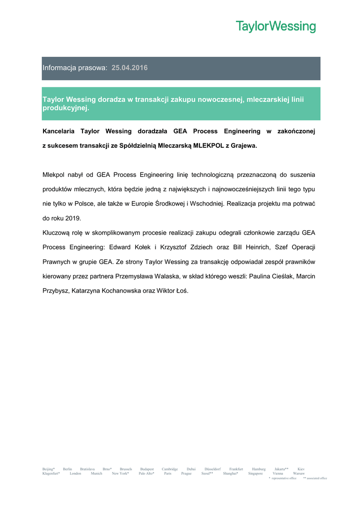 Informacja prasowa: 25.04.2016 Taylor Wessing doradza w
