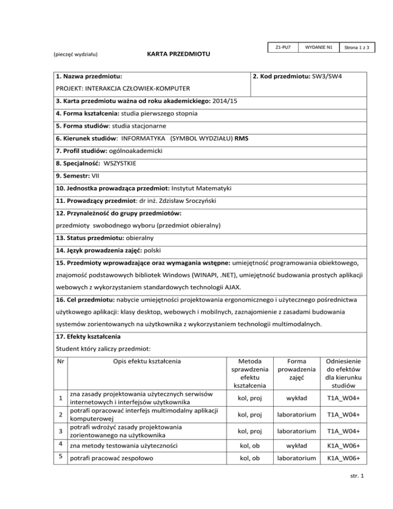 Z1-PU7 WYDANIE N1 Strona 1 z 3 KARTA PRZEDMIOTU (pieczęć wydziału) 1. Nazwa przedmiotu: 2. Kod przedmiotu: SW3/SW4 PROJEKT: INTERAKCJA CZŁOWIEK-KOMPUTER 3. Karta przedmiotu ważna od roku akademickiego: 2014/15 4. Forma kształcenia: studia pierwszego stopnia 5. Forma studiów: studia stacjonarne 6. Kierunek studiów: INFORMATYKA (SYMBOL WYDZIAŁU) RMS 7. Profil studiów: ogólnoakademicki 8. Specjalność: WSZYSTKIE 9. Semestr: VII 10. Jednostka prowadząca przedmiot: Instytut Matematyki 11. Prowadzący przedmiot: dr inż. Zdzisław Sroczyński 12. Przynależność do grupy przedmiotów: przedmioty swobodnego wyboru (przedmiot obieralny) 13. Status przedmiotu: obieralny 14. Język prowadzenia zajęć: polski 15. Przedmioty wprowadzające oraz wymagania wstępne: umiejętność programowania obiektowego, znajomość podstawowych bibliotek Windows (WINAPI, .NET), umiejętność budowania prostych aplikacji webowych z wykorzystaniem standardowych technologii AJAX. 16. Cel przedmiotu: nabycie umiejętności projektowania ergonomicznego i użytecznego pośrednictwa użytkowego aplikacji: klasy desktop, webowych i mobilnych, zaznajomienie z zasadami budowania systemów zorientowanych na użytkownika z wykorzystaniem technologii multimodalnych. 17. Efekty kształcenia Student który zaliczy przedmiot: Nr 1 2 3 Opis efektu kształcenia zna zasady projektowania użytecznych serwisów internetowych i interfejsów użytkownika potrafi opracować interfejs multimodalny aplikacji komputerowej potrafi wdrożyć zasady projektowania zorientowanego na użytkownika Metoda sprawdzenia efektu kształcenia Forma prowadzenia zajęć Odniesienie do efektów dla kierunku studiów kol, proj wykład T1A_W04+ kol, proj laboratorium T1A_W04+ kol, proj laboratorium T1A_W04+ 4 zna metody testowania użyteczności kol, ob wykład K1A_W06+ 5 potrafi pracować zespołowo kol, ob laboratorium K1A_W06+ str. 1 18. Formy zajęć dydaktycznych i ich wymiar (liczba godzin) Wykład Ćwiczenia 15 Laboratorium Projekt Seminarium 45 19. Treści kształcenia: wykład: formy interakcji człowiek-komputer. Zasady projektowania zorientowanego na użytkownika. Model użytkownika, interakcje multimodalne. Prototypowanie i testowanie użyteczności. User-Centered Desing (UCD). Wytyczne branżowe tworzenia pośrednictwa graficznego aplikacji. Zasady projektowania i metody realizacji ergonomicznego GUI aplikacji desktopowych i mobilnych. Funkcjonalność systemów webowych – zasady projektowania, metody realizacji. Komunikacja graficzna – rozpoznawanie obrazów i gestów. Komunikacja werbalna – wykorzystanie syntezy i rozpoznawania mowy. Rozwiązania oparte na modelowaniu języka naturalnego i sztucznej inteligencji. Interakcje dostosowane do potrzeb osób niepełnosprawnych. projekt: w ramach projektu sekcje laboratoryjne wykonują w formie pracy zespołowej aplikacje o podanej tematyce wraz z dokumentacją, a następnie przedstawiają je do publicznej dyskusji i oceny. 20. Egzamin: nie 21. Literatura podstawowa: 1. Sikorski M.: Interakcja człowiek-komputer. Wydawnictwo PJWSTK 2010. 2. Nielsen, J., Budiu, R.: Funkcjonalność aplikacji mobilnych. Nowoczesne standardy UX i UI, Helion 2013. 3. Tidwell J.: Projektowanie interfejsów. Sprawdzone wzorce projektowe. Helion 2012. 4. Nielsen J., Loranger H.: Optymalizacja funkcjonalności serwisów internetowych. Helion 2007. 22. Literatura uzupełniająca: 1. Spolsky J.: Projektowanie interfejsu użytkownika. Poradnik dla programistów, Mikom 2001. 2. Krug S.: Nie każ mi myśleć. O życiowym podejściu do funkcjonalności stron internetowych, Helion 2006. 3. Kasperski M., Boguska-Torbicz A.: Projektowanie stron WWW. Użyteczność w praktyce, Helion 2008. 4. Stąpor K.: Metody klasyfikacji obiektów w wizji komputerowej, PWN 2011. 5. Gatkowska I., Lubaszewski W.: Interfejs dla osób z dysfunkcją wzroku. Model kognitywny i przykład dobrej praktyki. Wydawnictwo Uniwersytetu Jagiellońskiego, Kraków 2013. 6. Vetulani Z.: Komunikacja człowieka z maszyną. Komputerowe modelowanie kompetencji językowej, Exit 2004. 7. Sharp H., Rogers Y., Preece J.: Interaction Design. Beyond Human-Computer Interaction. Wiley 2005. str. 2 23. Nakład pracy studenta potrzebny do osiągnięcia efektów kształcenia Lp. Liczba godzin kontaktowych / pracy studenta 15/15 Forma zajęć 1 Wykład 2 Ćwiczenia / 3 Laboratorium / 4 Projekt 5 Seminarium / 6 Inne: / 45/45 Suma godzin 60/60 24. Suma wszystkich godzin 120 25. Liczba punktów ECTS 4 26. Liczba punktów ECTS uzyskanych na zajęciach z bezpośrednim udziałem nauczyciela akademickiego 4 27. Liczba punktów ECTS uzyskanych na zajęciach o charakterze 3 praktycznym (laboratoria, projekty) 28. Uwagi: zaliczenie polega na publicznym przedstawieniu zrealizowanego projektu w formie dokumentacji elektronicznej oraz interaktywnej prezentacji na kolokwium, w którym mają obowiązek aktywnie uczestniczyć wszyscy studenci uczęszczający na zajęcia przedmiotu. W ten sposób wszystkie sekcje zaznajamiają się z każdą zastosowaną w pozostałych projektach technologią, poznają wady i zalety poszczególnych rozwiązań, a także mają możliwość zadawania pytań. Przedstawienie projektu jest oceniane w skali punktowej od 0 do 100 podzielonej wg efektów kształcenia: student powinien uzyskać powyżej 40% punktów z każdego efektu kształcenia. Zatwierdzono: ……………………………. ………………………………………………… (data i podpis prowadzącego) (data i podpis dyrektora instytutu/kierownika katedry/ Dyrektora Kolegium Języków Obcych/kierownika lub dyrektora jednostki międzywydziałowej) str. 3