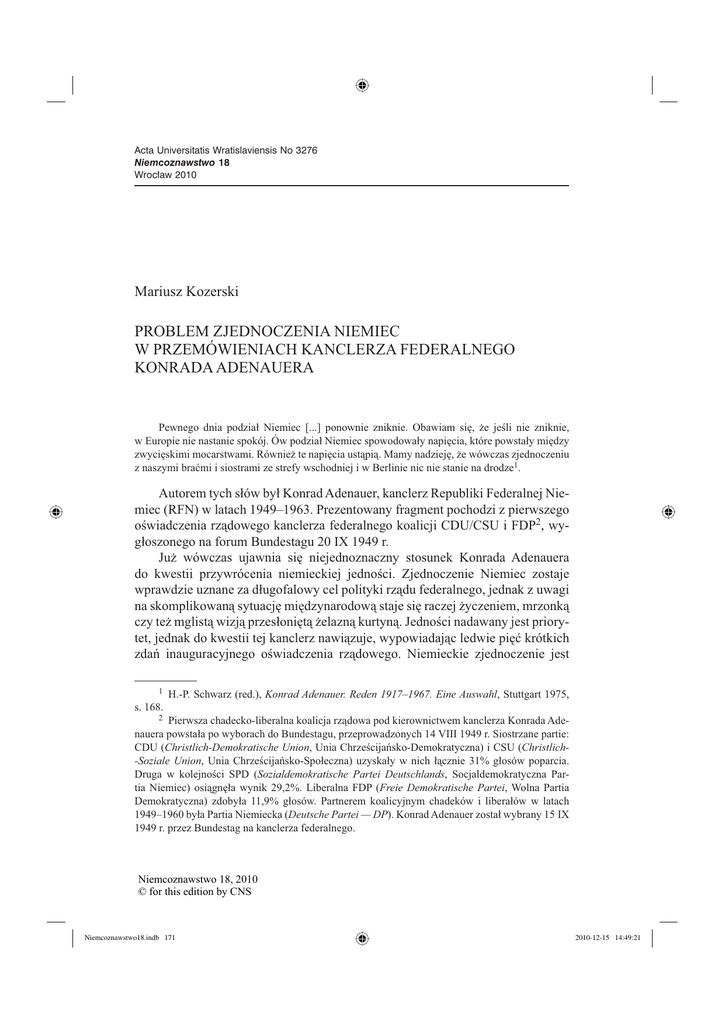 Acta Universitatis Wratislaviensis No 3276 Niemcoznawstwo 18 Wroc³aw 2010 Mariusz Kozerski PROBLEM ZJEDNOCZENIA NIEMIEC W PRZEMÓWIENIACH KANCLERZA FEDERALNEGO KONRADA ADENAUERA Pewnego dnia podział Niemiec [...] ponownie zniknie. Obawiam się, że jeśli nie zniknie, w Europie nie nastanie spokój. Ów podział Niemiec spowodowały napięcia, które powstały między zwycięskimi mocarstwami. Również te napięcia ustąpią. Mamy nadzieję, że wówczas zjednoczeniu z naszymi braćmi i siostrami ze strefy wschodniej i w Berlinie nic nie stanie na drodze1. Autorem tych słów był Konrad Adenauer, kanclerz Republiki Federalnej Niemiec (RFN) w latach 1949–1963. Prezentowany fragment pochodzi z pierwszego oświadczenia rządowego kanclerza federalnego koalicji CDU/CSU i FDP2, wygłoszonego na forum Bundestagu 20 IX 1949 r. Już wówczas ujawnia się niejednoznaczny stosunek Konrada Adenauera do kwestii przywrócenia niemieckiej jedności. Zjednoczenie Niemiec zostaje wprawdzie uznane za długofalowy cel polityki rządu federalnego, jednak z uwagi na skomplikowaną sytuację międzynarodową staje się raczej życzeniem, mrzonką czy też mglistą wizją przesłoniętą żelazną kurtyną. Jedności nadawany jest priorytet, jednak do kwestii tej kanclerz nawiązuje, wypowiadając ledwie pięć krótkich zdań inauguracyjnego oświadczenia rządowego. Niemieckie zjednoczenie jest 1 H.-P. Schwarz (red.), Konrad Adenauer. Reden 1917–1967. Eine Auswahl, Stuttgart 1975, s. 168. 2 Pierwsza chadecko-liberalna koalicja rządowa pod kierownictwem kanclerza Konrada Adenauera powstała po wyborach do Bundestagu, przeprowadzonych 14 VIII 1949 r. Siostrzane partie: CDU (Christlich-Demokratische Union, Unia Chrześcijańsko-Demokratyczna) i CSU (Christlich-Soziale Union, Unia Chrześcijańsko-Społeczna) uzyskały w nich łącznie 31% głosów poparcia. Druga w kolejności SPD (Sozialdemokratische Partei Deutschlands, Socjaldemokratyczna Partia Niemiec) osiągnęła wynik 29,2%. Liberalna FDP (Freie Demokratische Partei, Wolna Partia Demokratyczna) zdobyła 11,9% głosów. Partnerem koalicyjnym chadeków i liberałów w latach 1949–1960 była Partia Niemiecka (Deutsche Partei — DP). Konrad Adenauer został wybrany 15 IX 1949 r. przez Bundestag na kanclerza federalnego. Niemcoznawstwo 18, 2010 © for this edition by CNS Niemcoznawstwo18.indb 171 2010-12-15 14:49:21 MARIUSZ KOZERSKI 172 ważnym dziejowym nakazem, a mimo to Adenauer wzmiankuje o nim w końcowej części swojego przemówienia. Znacznie więcej miejsca i uwagi poświęca innym zagadnieniom: ograniczeniu uprawnień Bundestagu i rządu federalnego w warunkach obowiązywania Statutu Okupacyjnego3, uwolnieniu niemieckich jeńców wojennych przetrzymywanych na terenie Związku Radzieckiego, sprowadzeniu do RFN ok. 200 tys. Niemców przebywających na terenie Prus Wschodnich, Śląska i Czechosłowacji, zawarciu traktatów pokojowych, nieuznawaniu granicy na Odrze i Nysie Łużyckiej oraz przystąpieniu Niemiec Zachodnich do Wspólnoty Europejskiej4. Treść wystąpienia z 20 IX 1949 r. ukazuje także niezwykle charakterystyczny dla Konrada Adenauera trzeźwy i realistyczny stosunek do polityki. W koncepcji kanclerza jest ona sztuką osiągania celów państwowych w sposób sprawny i skuteczny, przy wykorzystaniu dostępnych środków i możliwości. Adenauer był przekonany, że w polityce intelektualizm i naukowość muszą ustąpić miejsca konsekwentnemu pragmatycznemu działaniu. Sprawujący władzę powinni koncentrować się na nielicznych, lecz istotnych z punktu widzenia interesów państwa zagadnieniach. Preferowane jest rozwiązywanie bieżących problemów oraz określanie możliwych do osiągnięcia celów. Ich realizacja stanowi gwarancję pozyskania lub utrzymania władzy. Postulaty wprowadzenia RFN do grona integrujących się państw Europy Zachodniej, doprowadzenia do uwolnienia niemieckich jeńców wojennych, objęcia opieką państwa przesiedleńców ze Wschodu czy wyrażona niebawem wola uzbrojenia RFN oraz pojednania i zacieśnienia dobrosąsiedzkich stosunków z Francją, tworzyły spójny i racjonalny program działania, zgodny z przedstawioną powyżej koncepcją polityki. Pojawiające się w kolejnych wystąpieniach z równą częstotliwością hasło zjednoczenia Niemiec było tylko pozornie — tak brzmi teza niniejszej pracy — częścią politycznego programu Konrada Adenauera. Idea niemieckiej jedności była zbyt upragniona i piękna, aby ją oficjalnie porzucić, jednocześnie zaś nazbyt odległa i nierealna, aby wprowadzać ją w życie. W okresie sprawowania władzy kanclerskiej Konrad Adenauer — uznając podtrzymywanie marzenia o jedności za niezbędny element politycznej retoryki rządu — wielokrotnie przedstawiał w jego imieniu stanowisko wobec zjednoczenia Niemiec. Swój punkt widzenia prezentował, składając nie tylko oświadczenia rządowe w Bundestagu, ale również zabierając głos na zjazdach CDU oraz na 3 Statut Okupacyjny wszedł w życie dzień po wspomnianym wystąpieniu K. Adenauera w Bundestagu — 21 IX 1949 r. Był dokumentem określającym kompetencje państw okupacyjnych oraz prawa władz zachodnioniemieckich w pierwszym okresie istnienia RFN. O Statucie Okupacyjnym bliżej Niemcy współczesne. Zarys encyklopedyczny, red. H. Dmochowska et al., Poznań 1999, s. 648; oraz E. Osmańczyk, Niemcy 1945–1950. Liczby, fakty, daty, komentarze, Warszawa 1951, s. 22–23. 4 H.-P. Schwarz (red.), op. cit., s. 153–168. Niemcoznawstwo 18, 2010 © for this edition by CNS Niemcoznawstwo18.indb 172 2010-12-15 14:49:21 PROBLEM ZJEDNOCZENIA NIEMIEC W PRZEMÓWIENIACH KANCLERZA KONRADA ADENAUERA 173 posiedzeniach zarządu partii, wygłaszając przemówienia radiowe i wykłady na uniwersytetach, uczestnicząc w konferencjach prasowych, biorąc udział w spotkaniach grup zawodowych i organizacji społecznych, a nawet kierując do narodu życzenia świąteczne i noworoczne5. Zapisy tych wyst