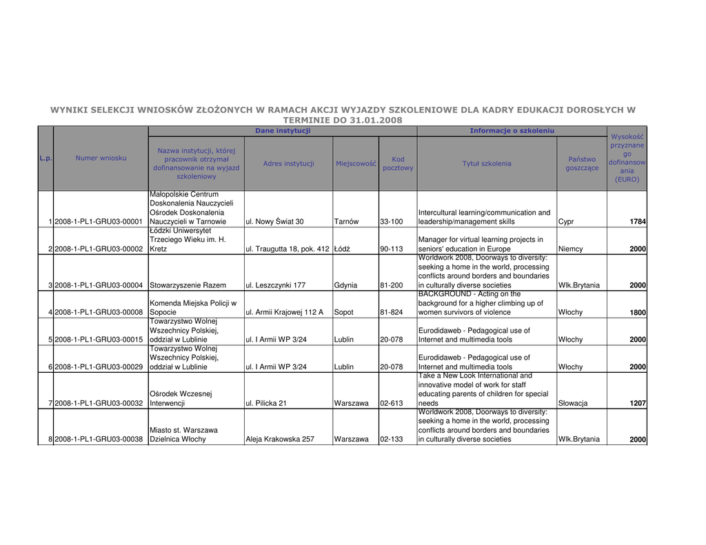 WYNIKI SELEKCJI WNIOSKÓW ZŁOŻONYCH W RAMACH AKCJI WYJAZDY SZKOLENIOWE DLA KADRY EDUKACJI DOROSŁYCH W TERMINIE DO 31.01.2008 Dane instytucji L.p. Numer wniosku Nazwa instytucji, której pracownik otrzymał dofinansowanie na wyjazd szkoleniowy Adres instytucji Informacje o szkoleniu Miejscowość Kod pocztowy Małopolskie Centrum Doskonalenia Nauczycieli Ośrodek Doskonalenia 1 2008-1-PL1-GRU03-00001 Nauczycieli w Tarnowie Łódzki Uniwersytet Trzeciego Wieku im. H. 2 2008-1-PL1-GRU03-00002 Kretz ul. Traugutta 18, pok. 412 Łódź 90-113 3 2008-1-PL1-GRU03-00004 Stowarzyszenie Razem ul. Leszczynki 177 Gdynia 81-200 ul. Armii Krajowej 112 A Sopot ul. I Armii WP 3/24 ul. Nowy Świat 30 Tarnów 33-100 Tytuł szkolenia Intercultural learning/communication and leadership/management skills Państwo goszczące Wysokość przyznane go dofinansow ania (EURO) Cypr 1784 Niemcy 2000 Wlk.Brytania 2000 81-824 Manager for virtual learning projects in seniors' education in Europe Worldwork 2008, Doorways to diversity: seeking a home in the world, processing conflicts around borders and boundaries in culturally diverse societies BACKGROUND - Acting on the background for a higher climbing up of women survivors of violence Włochy 1800 Lublin 20-078 Eurodidaweb - Pedagogical use of Internet and multimedia tools Włochy 2000 ul. I Armii WP 3/24 Lublin 20-078 Włochy 2000 Ośrodek Wczesnej 7 2008-1-PL1-GRU03-00032 Interwencji ul. Pilicka 21 Warszawa 02-613 Słowacja 1207 Miasto st. Warszawa 8 2008-1-PL1-GRU03-00038 Dzielnica Włochy Aleja Krakowska 257 Warszawa 02-133 Wlk.Brytania 2000 Komenda Miejska Policji w 4 2008-1-PL1-GRU03-00008 Sopocie Towarzystwo Wolnej Wszechnicy Polskiej, 5 2008-1-PL1-GRU03-00015 oddział w Lublinie Towarzystwo Wolnej Wszechnicy Polskiej, 6 2008-1-PL1-GRU03-00029 oddział w Lublinie Eurodidaweb - Pedagogical use of Internet and multimedia tools Take a New Look International and innovative model of work for staff educating parents of children for special needs Worldwork 2008, Doorways to diversity: seeking a home in the world, processing conflicts around borders and boundaries in culturally diverse societies KONIEC MILCZENIA Stowarzyszenie Pomocy Dorosłym Ofiarom Nadużyć 9 2008-1-PL1-GRU03-00039 Seksualnych w Dzieciństwie ul. Balladyny 1 m. 26 KONIEC MILCZENIA Stowarzyszenie Pomocy Dorosłym Ofiarom Nadużyć 10 2008-1-PL1-GRU03-00043 Seksualnych w Dzieciństwie ul. Balladyny 1 m. 26 Fundacja Instytut Spraw ul. Więckowskiego 33 p. 127 11 2008-1-PL1-GRU03-00050 Obywatelskich Stowarzyszenie Pomocy Osobom Niepełnosprawnym 12 2008-1-PL1-GRU03-00057 SPON ul. Niepodległości 783 Stowarzyszenie "Same o 13 2008-1-PL1-GRU03-00065 Sobie S.O.S." Al. Wyzwolenia 18/33 Fundacja Pomocy Dzieciom 14 2008-1-PL1-GRU03-00073 z Chorobą Nowotworową ul. Przybyszewskiego 47 Fundacja SZKOŁA BEZ BARIER na Rzecz Edukacji Dzieci i Młodzieży ze Sprzężonymi ul. Dygasińskiego 25 15 2008-1-PL1-GRU03-00083 Niepełnosprawnościami Fundacja SZKOŁA BEZ BARIER na Rzecz Edukacji Dzieci i Młodzieży ze Sprzężonymi 16 2008-1-PL1-GRU03-00085 Niepełnosprawnościami ul. Dygasińskiego 25 Fundacja SZKOŁA 17 2008-1-PL1-GRU03-00087 DIALOGU Siepraw 1205 02-501 Worldwork 2008, Doorways to diversity: seeking a home in the world, processing conflicts around borders and boundaries in culturally diverse societies Wlk.Brytania 2000 02-501 Worldwork 2008, Doorways to diversity: seeking a home in the world, processing conflicts around borders and boundaries in culturally diverse societies Wlk.Brytania 2000 Łódź 90-734 ELTIS Seminar for Mid Career Urban Transport Professionals from New EU Member States and Accession Countries Węgry Sopot 81-805 Warszawa 00-570 Warszawa 01-849 Open Distance Learning and Personal Learning Environments Worldwork 2008, Doorways to diversity: seeking a home in the world, processing conflicts around borders and boundaries in culturally diverse societies Worldwork 2008, Doorways to diversity: seeking a home in the world, processing conflicts around borders and boundaries in culturally diverse societies 30-820 Take a New Look International and innovative model of work for staff educating parents of children for special needs Warszawa Warszawa Kraków Kraków 30-820 Siepraw 32-447 Take a New Look International and innovative model of work for staff educating parents of children for special needs Take a New Look International and innovative model of work for staff educating parents of children for special needs 607 Włochy 1900 Wlk.Brytania 2000 Wlk.Brytania 2000 Wlk.Brytania 1956 Wlk.Brytania 1956 Słowacja 1334 18 2008-1-PL1-GRU03-00095 Fundacja Wspierająca Prawidłowy Rozwój Dzieci i Młodzieży ROŚNIJ ZDROWO Nauczycielskie Kolegium Języków Obcych w Cieszynie Gabinet psychologiczny "Przystań Szkraba" s .c. Maja Szymor, Maria Skrzypiec-Sjöholm Gabinet psychologiczny "Przystań Szkraba" s .c. Maja Szymor, Maria Skrzypiec-Sjöholm Centrum Kształcenia Ustawicznego w Białymstoku ul. Grodzka 54 Kraków 31-044 ul. Frysztacka 44 Cieszyn 43-400 ul. Kobielska 52/18A Warszawa 04-389 ul. Kobielska 52/18A Warszawa 04-389 ul. Żabia 5 Białystok 15-448 ul. Bagatela 13 m 43 Warszawa 00-585 ul. Żabia 5 Białystok 15-448 ul. Żwirki i Wigury 4a Mikołów 43-190 ul. Siekierkowska 28 Warszawa 00-709 Warszawa 01-459 28 2008-1-PL1-GRU03-00102 Instytut Psychologii Procesu ul. Kochanowskiego 27/7 Warszawa Starostwo Powiatowe w 29 2008-1-PL1-GRU03-00143 Mikołowie ul. Żwirki i Wigury 4a Mikołów 01-864 19 2008-1-PL1-GRU03-00097 20 2008-1-PL1-GRU03-00120 21 2008-1-PL1-GRU03-00123 22 2008-1-PL1-GRU03-00127 Polskie Towarzystwo 23 2008-1-PL1-GRU03-00129 Stwardnienia Rozsianego Centrum Kształcenia Ustawicznego w 24 2008-1-PL1-GRU03-00171 Białymstoku Starostwo Powiatowe w 25 2008-1-PL1-GRU03-00173 Mikołowie Dom Kultury Dorożkarnia w dz. Mokotów m. st. 26 2008-1-PL1-GRU03-00174 Warszawy 27 2008-1-PL1-GRU03-00176 Bemowskie Centrum Kultury ul. Górczewska 201 43-190 Take a New Look International and