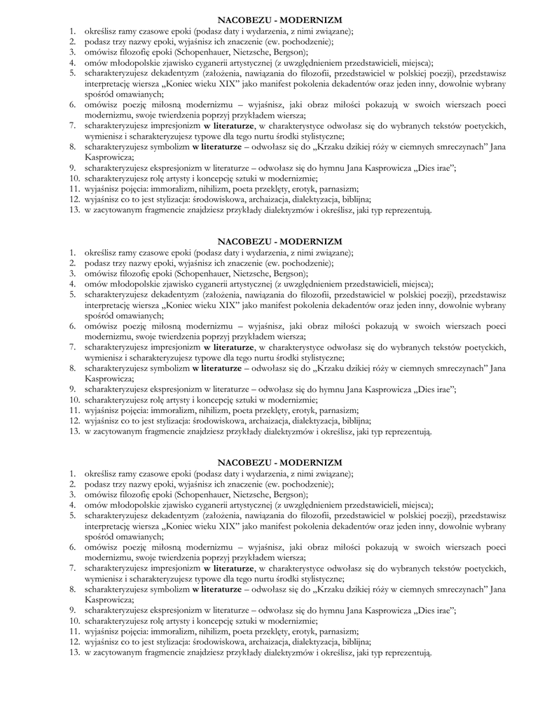 1. 2. 3. 4. 5. 6. 7. 8. 9. 10. 11. 12. 13. 1. 2. 3. 4. 5. 6. 7. 8. 9. 10. 11. 12. 13. 1. 2. 3. 4. 5. 6. 7. 8. 9. 10. 11. 12. 13. NACOBEZU - MODERNIZM określisz ramy czasowe epoki (podasz daty i wydarzenia, z nimi związane); podasz trzy nazwy epoki, wyjaśnisz ich znaczenie (ew. pochodzenie); omówisz filozofię epoki (Schopenhauer, Nietzsche, Bergson); omów młodopolskie zjawisko cyganerii artystycznej (z uwzględnieniem przedstawicieli, miejsca); scharakteryzujesz dekadentyzm (założenia, nawiązania do filozofii, przedstawiciel w polskiej poezji), przedstawisz interpretację wiersza „Koniec wieku XIX” jako manifest pokolenia dekadentów oraz jeden inny, dowolnie wybrany spośród omawianych; omówisz poezję miłosną modernizmu – wyjaśnisz, jaki obraz miłości pokazują w swoich wierszach poeci modernizmu, swoje twierdzenia poprzyj przykładem wiersza; scharakteryzujesz impresjonizm w literaturze, w charakterystyce odwołasz się do wybranych tekstów poetyckich, wymienisz i scharakteryzujesz typowe dla tego nurtu środki stylistyczne; scharakteryzujesz symbolizm w literaturze – odwołasz się do „Krzaku dzikiej róży w ciemnych smreczynach” Jana Kasprowicza; scharakteryzujesz ekspresjonizm w literaturze – odwołasz się do hymnu Jana Kasprowicza „Dies irae”; scharakteryzujesz rolę artysty i koncepcję sztuki w modernizmie; wyjaśnisz pojęcia: immoralizm, nihilizm, poeta przeklęty, erotyk, parnasizm; wyjaśnisz co to jest stylizacja: środowiskowa, archaizacja, dialektyzacja, biblijna; w zacytowanym fragmencie znajdziesz przykłady dialektyzmów i określisz, jaki typ reprezentują. NACOBEZU - MODERNIZM określisz ramy czasowe epoki (podasz daty i wydarzenia, z nimi związane); podasz trzy nazwy epoki, wyjaśnisz ich znaczenie (ew. pochodzenie); omówisz filozofię epoki (Schopenhauer, Nietzsche, Bergson); omów młodopolskie zjawisko cyganerii artystycznej (z uwzględnieniem przedstawicieli, miejsca); scharakteryzujesz dekadentyzm (założenia, nawiązania do filozofii, przedstawiciel w polskiej poezji), przedstawisz interpretację wiersza „Koniec wieku XIX” jako manifest pokolenia dekadentów oraz jeden inny, dowolnie wybrany spośród omawianych; omówisz poezję miłosną modernizmu – wyjaśnisz, jaki obraz miłości pokazują w swoich wierszach poeci modernizmu, swoje twierdzenia poprzyj przykładem wiersza; scharakteryzujesz impresjonizm w literaturze, w charakterystyce odwołasz się do wybranych tekstów poetyckich, wymienisz i scharakteryzujesz typowe dla tego nurtu środki stylistyczne; scharakteryzujesz symbolizm w literaturze – odwołasz się do „Krzaku dzikiej róży w ciemnych smreczynach” Jana Kasprowicza; scharakteryzujesz ekspresjonizm w literaturze – odwołasz się do hymnu Jana Kasprowicza „Dies irae”; scharakteryzujesz rolę artysty i koncepcję sztuki w modernizmie; wyjaśnisz pojęcia: immoralizm, nihilizm, poeta przeklęty, erotyk, parnasizm; wyjaśnisz co to jest stylizacja: środowiskowa, archaizacja, dialektyzacja, biblijna; w zacytowanym fragmencie znajdziesz przykłady dialektyzmów i określisz, jaki typ reprezentują. NACOBEZU - MODERNIZM określisz ramy czasowe epoki (podasz daty i wydarzenia, z nimi związane); podasz trzy nazwy epoki, wyjaśnisz ich znaczenie (ew. pochodzenie); omówisz filozofię epoki (Schopenhauer, Nietzsche, Bergson); omów młodopolskie zjawisko cyganerii artystycznej (z uwzględnieniem przedstawicieli, miejsca); scharakteryzujesz dekadentyzm (założenia, nawiązania do filozofii, przedstawiciel w polskiej poezji), przedstawisz interpretację wiersza „Koniec wieku XIX” jako manifest pokolenia dekadentów oraz jeden inny, dowolnie wybrany spośród omawianych; omówisz poezję miłosną modernizmu – wyjaśnisz, jaki obraz miłości pokazują w swoich wierszach poeci modernizmu, swoje twierdzenia poprzyj przykładem wiersza; scharakteryzujesz impresjonizm w literaturze, w charakterystyce odwołasz się do wybranych tekstów poetyckich, wymienisz i scharakteryzujesz typowe dla tego nurtu środki stylistyczne; scharakteryzujesz symbolizm w literaturze – odwołasz się do „Krzaku dzikiej róży w ciemnych smreczynach” Jana Kasprowicza; scharakteryzujesz ekspresjonizm w literaturze – odwołasz się do hymnu Jana Kasprowicza „Dies irae”; scharakteryzujesz rolę artysty i koncepcję sztuki w modernizmie; wyjaśnisz pojęcia: immoralizm, nihilizm, poeta przeklęty, erotyk, parnasizm; wyjaśnisz co to jest stylizacja: środowiskowa, archaizacja, dialektyzacja, biblijna; w zacytowanym fragmencie znajdziesz przykłady dialektyzmów i określisz, jaki typ reprezentują.