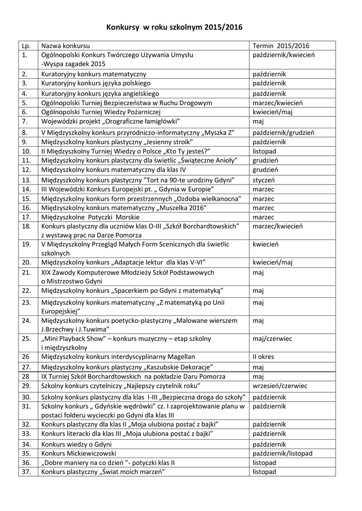 Konkursy w roku szkolnym 2015/2016 Lp. 1. 2. 3. 4. 5. 6. 7. 8. 9. 10. 11. 12. 13. 14. 15. 16. 17. 18. 19. 20. 21. 22. 23. 24. 25. 26 27. 28 29. 30. 31. 32. 33. 34. 35. 36. 37. Nazwa konkursu Ogólnopolski Konkurs Twórczego Używania Umysłu -Wyspa zagadek 2015 Kuratoryjny konkurs matematyczny Kuratoryjny konkurs języka polskiego Kuratoryjny konkurs języka angielskiego Ogólnopolski Turniej Bezpieczeństwa w Ruchu Drogowym Ogólnopolski Turniej Wiedzy Pożarniczej Wojewódzki projekt „Orograficzne łamigłówki” Termin 2015/2016 październik/kwiecień V Międzyszkolny konkurs przyrodniczo-informatyczny „Myszka Z” Międzyszkolny konkurs plastyczny „Jesienny stroik” II Międzyszkolny Turniej Wiedzy o Polsce „Kto Ty jesteś?” Międzyszkolny konkurs plastyczny dla świetlic „Świąteczne Anioły” Międzyszkolny konkurs matematyczny dla klas IV Międzyszkolny konkurs plastyczny ”Tort na 90-te urodziny Gdyni” III Wojewódzki Konkurs Europejski pt. „ Gdynia w Europie” Międzyszkolny konkurs form przestrzennych „Ozdoba wielkanocna” Międzyszkolny konkurs matematyczny „Muszelka 2016” Międzyszkolne Potyczki Morskie Konkurs plastyczny dla uczniów klas O-III „Szkół Borchardtowskich” z wystawą prac na Darze Pomorza V Międzyszkolny Przegląd Małych Form Scenicznych dla świetlic szkolnych Międzyszkolny konkurs „Adaptacje lektur dla klas V-VI” XIX Zawody Komputerowe Młodzieży Szkół Podstawowych o Mistrzostwo Gdyni Międzyszkolny konkurs „Spacerkiem po Gdyni z matematyką” październik/grudzień październik listopad grudzień grudzień styczeń marzec marzec marzec marzec marzec/kwiecień Międzyszkolny konkurs matematyczny „Z matematyką po Unii Europejskiej” Międzyszkolny konkurs poetycko-plastyczny „Malowane wierszem J.Brzechwy i J.Tuwima” „Mini Playback Show” – konkurs muzyczny – etap szkolny i międzyszkolny Międzyszkolny konkurs interdyscyplinarny Magellan Międzyszkolny konkurs plastyczny „Kaszubskie Dekoracje” IX Turniej Szkół Borchardtowskich na pokładzie Daru Pomorza Szkolny konkurs czytelniczy „Najlepszy czytelnik roku” maj Szkolny konkurs plastyczny dla klas I-III „Bezpieczna droga do szkoły” Szkolny konkurs „ Gdyńskie wędrówki” cz. I zaprojektowanie planu w postaci folderu wycieczki po Gdyni dla klas III Konkurs plastyczny dla klas II „Moja ulubiona postać z bajki” Konkurs literacki dla klas III „Moja ulubiona postać z bajki” Konkurs wiedzy o Gdyni Konkurs Mickiewiczowski „Dobre maniery na co dzień ”- potyczki klas II Konkurs plastyczny „Świat moich marzeń” październik październik październik październik październik marzec/kwiecień kwiecień/maj maj kwiecień kwiecień/maj maj maj maj maj/czerwiec II okres maj maj wrzesień/czerwiec październik październik październik październik/listopad listopad listopad 38. 39. 40. 41. 42. 43. 44. 45. 46. 47. 48. 49. 50. 51. 52. 53. 54. 55. 56. 57. 58. 59. 60. 61. 62. 63. Konkurs komputerowy w Power Point dla klas III „ Gdyńskie wędrówki” cz. II Konkurs poezji i piosenki patriotycznej dla klas 0-III Konkurs wiedzy o Polsce kl.II Szkolny konkurs „Ekologiczna bombka” Konkurs Poezji i Piosenki Świąteczno-Zimowej Konkurs biblijny – etap szkolny Konkurs plastyczny dla klas III „Najpiękniejsze budowle Gdyni” Konkurs recytatorski kl.IV-VI Konkurs wiedzy o Gdyni kl.III „Gdynia moje miasto” Konkurs recytatorski dla klas „O” Konkurs recytatorski dla klas I-III Konkurs na najciekawszą i najpiękniejszą „Piramidę zdrowia” Konkurs matematyczny kl.II Konkurs plastyczny „90 lat Gdyni ” VI Turniej wiedzy o patronie szkoły” dla klas IV-V Konkurs matematyczny kl.III Konkurs ortograficzny dla klas III Konkurs językowy kl.IV Szkolny konkurs ekologiczny dla klas VI Szkolny konkurs piosenki angielskiej dla klas I - III Szkolny konkurs z języka angielskiego kl.V-VI Konkurs plastyczno-techniczny „Zakładka do książki” Eurowizja–szkolny konkurs piosenki europejskiej dla klas I-III Konkurs wiedzy dla klas II „Jeden z czternastu” Rozgrywki sportowe „Piraci kontra żeglarze” dla klas 0 Konkurs na najciekawsze przebranie europejskie „Klasy Super Europejczyków” listopad listopad listopad grudzień grudzień styczeń styczeń luty luty luty luty/marzec marzec marzec marzec marzec marzec marzec/kwiecień kwiecień kwiecień kwiecień maj maj maj maj czerwiec czerwiec