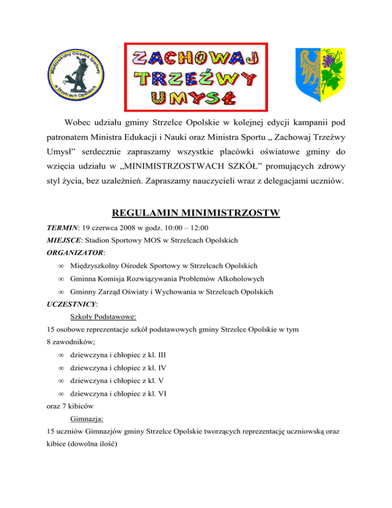 Wobec udziału gminy Strzelce Opolskie w kolejnej edycji kampanii pod patronatem Ministra Edukacji i Nauki oraz Ministra Sportu „ Zachowaj Trzeźwy Umysł” serdecznie zapraszamy wszystkie placówki oświatowe gminy do wzięcia udziału w „MINIMISTRZOSTWACH SZKÓŁ” promujących zdrowy styl Ŝycia, bez uzaleŜnień. Zapraszamy nauczycieli wraz z delegacjami uczniów. REGULAMIN MINIMISTRZOSTW TERMIN: 19 czerwca 2008 w godz. 10:00 – 12:00 MIEJSCE: Stadion Sportowy MOS w Strzelcach Opolskich ORGANIZATOR: • Międzyszkolny Ośrodek Sportowy w Strzelcach Opolskich • Gminna Komisja Rozwiązywania Problemów Alkoholowych • Gminny Zarząd Oświaty i Wychowania w Strzelcach Opolskich UCZESTNICY: Szkoły Podstawowe: 15 osobowe reprezentacje szkół podstawowych gminy Strzelce Opolskie w tym 8 zawodników; • dziewczyna i chłopiec z kl. III • dziewczyna i chłopiec z kl. IV • dziewczyna i chłopiec z kl. V • dziewczyna i chłopiec z kl. VI oraz 7 kibiców Gimnazja: 15 uczniów Gimnazjów gminy Strzelce Opolskie tworzących reprezentację uczniowską oraz kibice (dowolna ilość) KONKURENCJE: Szkoły Podstawowe 1. wyścig w workach 2. bieg z pałeczką sztafetową 3. tor przeszkód (płotek, słupek, piłka lekarska) 4. tor przeszkód (szarfa, płotek) 5. prowadzenie piłki pod płotkiem (chłopcy nogą, dziewczęta ręką) 6. strzały do bramki z 11m (chłopcy z powietrza, dziewczęta po ziemi) 7. przeskoki przez skakankę – jak największa liczba osób (udział całej reprezentacji szkoły – 15 osób) 8. przeciąganie liny 9. konkurs na hasło promujące zdrowy styl Ŝycia bez uzaleŜnień (reprezentacje szkół przynoszą ze sobą transparenty z wypisanymi hasłami) Gimnazja mecz piłki noŜnej pomiędzy reprezentacją uczniowską ,a reprezentacją nauczycieli gminy Strzelce Opolskie ( boisko główne, składy 11 osobowe, czas gry: 2 x 15 min.) ODPOWIEDZIALNY ZA DRUśYNĘ NAUCZYCIELI – Klaudiusz Radziej ODPOWIEDZIALNY ZA DRUśYNĘ UCZNIÓW – Paweł Bębas SĘDZIA MECZU – Konrad Anderwald SEKREATARIAT ZAWODÓW – Ewelina Pszowska, Aleksandra Stobierska, Alicja Stosik SPIKER ZAWODÓW – Paweł Bębas SEDZIA GŁÓWNY DLA PSP – Klaudiusz Radziej PRZEWODNICZĄCA KOMISJI KONKURSOWEJ OCENIAJĄCEJ HASŁO – Joanna Hołobut MIERZĄCY CZAS – uczniowie ZSZ Nr 1 Strzelce Op. Odpowiedzialni za sprzęt: Worki, pałeczki sztafetowe, szarfy, lina do skakania, piłki lekarskie – Klaudiusz Radziej, Paweł Bębas stroje piłkarskie – Andrzej Damaszek, Paweł Bębas stopery – Andrzej Damaszek przygotowanie obiektu oraz konkurencji dla PSP – Andrzej Damaszek