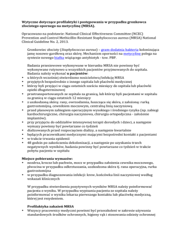Wytyczne dotyczące profilaktyki i postępowania w przypadku gronkowca złocistego opornego na metycylinę (MRSA). Opracowano na podstawie: National Clinical Effectiveness Committee (NCEC) Prevention and Control Methicillin-‐Resistant Staphylococcus aureus (MRSA) National Clinical Guideline No. 2, 2013. Gronkowiec złocisty (Staphylococcus aureus) – gram-‐dodatnia bakteria kolonizująca jamę nosowo-‐gardłową oraz skórę. Mechanizm oporności na metycylinę polega na syntezie nowego białka wiążącego antybiotyk -‐ tzw. PBP. Badania przesiewowe wykonywane w kierunku MRSA nie powinny być wykonywane rutynowo u wszystkich pacjentów przyjmowanych do szpitala. Badania należy wykonać u pacjentów: • u których wcześniej stwierdzono nosicielstwo/infekcję MRSA • przyjętych bezpośrednio z innego szpitala lub placówki medycznej • którzy byli przyjęci w ciągu ostatnich sześciu miesięcy do szpitala lub placówki opieki długoterminowej • przetransportowanych ze szpitala za granicą, lub którzy byli pacjentami w szpitalu za granicą w ciągu ostatnich 12 miesięcy • z uszkodzoną skórą: rany, owrzodzenia, łuszcząca się skóra, z założoną: rurką gastrostomijną, cewnikiem moczowym, centralną linią naczyniową • przed planowym zabiegiem operacyjnym wysokiego i średniego ryzyka (np. zabiegi kardiochirurgiczne, chirurgia naczyniowa, chirurgia ortopedyczna -‐ założenie implantów). • przy przyjęciu do oddziałów intensywnej terapii dorosłych i dzieci, a następnie wymazy powinny być powtarzane co tydzień • dializowanych przed rozpoczęciem dializy, a następnie kwartalnie • będących pracownikami medycznymi mającymi bezpośredni kontakt z pacjentami • w trakcie trwania epidemii • 48 godzin po zakończeniu dekolonizacji, a następnie po uzyskaniu trzech negatywnych wyników, badania powinny być powtarzane co tydzień w trakcie pobytu pacjenta w szpitalu Miejsce pobierania wymazów: • nozdrza, krocze lub pachwin, mocz w przypadku założenia cewnika moczowego, plwocina w przypadku odkrztuszania, uszkodzona skóra tj. rana operacyjna, rurka gastrostomijna • w przypadku diagnozowania infekcji: krew, końcówka linii naczyniowej według wskazań klinicznych W przypadku stwierdzenia pozytywnych wyników MRSA należy poinformować pacjenta o wyniku. W przypadku wypisania pacjenta ze szpitala należy poinformować o wyniku lekarza pierwszego kontaktu lub placówkę medyczną, której jest rezydentem. Profilaktyka zakażeń MRSA • Wszyscy pracownicy medyczni powinni być przeszkoleni w zakresie używania standardowych środków ochronnych, higieny rąk i stosowania odzieży ochronnej • • • • • • • • • • • przy przyjęciu do pracy, a następnie szkolenie powinno być powtarzane co roku. Pacjenci powinni być wyedukowani z zasad przestrzegania higieny rąk. Gdy izolatki jednoosobowe lub sale wieloosobowe na oddziale izolacyjnym nie są dostępne, skolonizowanych MRSA pacjentów można kohortować. Higiena rąk powinna być wykonywana zgodnie z 5 momentami według Światowej Organizacji Zdrowia (WHO): ü Przed kontaktem z pacjentem ü Przed czystą/aseptyczną procedurą ü Po kontakcie z płynami ustrojowymi ü Po kontakcie z pacjentem ü Po kontakcie z otoczeniem pacjenta. Higiena rąk powinna być przeprowadzana regularnie, także przez pacjentów oraz osoby je odwiedzające. Odległość pomiędzy łóżkami powinna być tak planowana, aby zapobiegać rozprzestrzenianiu się zakażeń krzyżowych. Nowo wybudowane szpitale powinny w 100% mieć pokoje jednoosobowe z prysznicem i toaletą (nie dotyczy to placówek opieki długoterminowej). Szpitale gdzie MRSA występuje endemicznie mogą rozważyć otwarcie oddziałów izolacyjnych dla pacjentów z alert patogenami. Wszyscy pacjenci przyjęci bezpośrednio z innych szpitali w kraju lub za granicą powinni przebywać w izolatce do czasu uzyskania negatywnych wyników w kierunku MRSA. Należy podjąć wszelkie wysiłki w celu zapewnienia, że wszyscy pacjenci przeniesieni do oddziałów wysokiego ryzyka (OIOM, oddziałów: kardiochirurgii, ortopedii, urazowych, chirurgii naczyniowej i transplantacji) spoza obszarów wysokiego ryzyka (oddziały medyczne i opieki geriatrycznej) w obrębie tego samego szpitala powinni być izolowani lub kohortowani do czasu uzyskania negatywnych wyników wymazów w kierunku MRSA W przypadku identyfikacji nowego przypadku MRSA w sali wieloosobowej, pozostali pacjenci z tej samej sali powinni mieć wykonane badania w kierunku nosicielstwa MRSA Pacjenci czekający na wyniki wymazów w kierunku MRSA powinni być izolowani do czasu otrzymania negatywnych wyników wymazów, jeśli: wcześniej byli skolonizowani lub mieli infekcję MRSA, byli niedawno hospitalizowani lub byli przyjmowani często do szpitala w ciągu ostatnich 6 miesięcy, zostali przyjęci z innej placówki medycznej czy domu opieki, byli pacjentami innej placówki medycznej w ciągu ostatnich sześciu miesięcy, mają rany przewlekłe/owrzodzenia, zostali przetransportowani ze szpitala za granicą. Liczba pracowników medycznych mających bezpośredni kontakt z pacjentami, którzy są izolowani z powodu kolonizacji lub infekcji MRSA powinna być ograniczona do minimum. Personel ze złuszczającymi się zmianami skóry powinni być wyłączeni z opieki nad pacjentami z MRSA. Izolację kontaktową pacjentów należy kontynuować do czasu otrzymania trzech kolejnych negatywnych wyników w kierunku MRSA w odstępach czasu co najmniej 48 godzin, w przypadku dekolonizacji pobranych 2 dni po jej zakończeniu. Odzież ochronną należy zdjąć przed opuszczeniem izolatki. Często nie ma potrzeby, żeby osoby odwiedzające nosiły odzież ochronną. Najistotniejsze jest przestrzeganie higieny rąk przed i po kontakcie z pacjentem. Przenoszenie pacjentów z MRSA pomiędzy oddziałami w tym samym szpitalu i pomiędzy szpitalami powinno być ograniczone do minimum • • • Pacjenci z