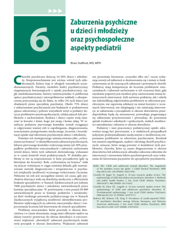 6 Zaburzenia psychiczne u dzieci i młodzieży oraz psychospołeczne aspekty pediatrii Brian Stafford, MD, MPH C horoby psychiczne dotyczą 14-20% dzieci i młodzieży. Rozpowszechnienie jest wyższe wśród tych młodocianych, którzy żyją w ubogich warunkach socjoekonomicznych. Niestety, niedobór kadry psychiatrycznej, stygmatyzacja korzystających z opieki psychiatrycznej, ciągłe niedofinansowanie, bariery instytucjonalne w publicznej opiece psychiatrycznej i niewspółmierne nakłady z ubezpieczenia przyczyniają się do faktu, że tylko 2% tych dzieci jest zbadanych przez specjalistę psychiatrę. Około 75% dzieci z zaburzeniami psychicznymi jest badanych w podstawowej opiece zdrowotnej i połowa wszystkich wizyt u pediatry dotyczy problemów psychospołecznych, edukacyjnych lub problemów z zachowaniem. Rodzice i dzieci często wolą omawiać te kwestie z kimś, kogo już znają i komu ufają. W rezultacie pediatrzy pierwszego kontaktu zostali wciągnięci w odgrywanie ważnej roli w zapobieganiu, diagnozowaniu, wszczynaniu postępowania medycznego, leczeniu i koordynacji opieki nad zdrowiem psychicznym dzieci i młodzieży. Pomimo ich strategicznego umiejscowienia jako „ochroniarza na bramce” w identyfikowaniu zaburzeń psychicznych, lekarze pierwszego kontaktu wykrywają mniej niż 20% przypadków problemów emocjonalnych i zaburzeń zachowania wśród dzieci, które tych zaburzeń doświadczają; wykazano to w czasie kontroli wizyt pediatrycznych. W dodatku problemy te nie są rozpoznawane w fazie początkowej (gdy są łatwiejsze do leczenia). Rola „ochroniarza na bramce” stała się jeszcze ważniejsza w ciągu ostatniej dekady, gdy zaawansowane metody diagnostyczne i terapeutyczne w psychiatrii zwiększyły możliwość wczesnego wykrywania i leczenia. Pełnienie tej roli jest szczególnie istotne od czasu, gdy psychiatria dziecięca stała się dziedziną medycyny z olbrzymimi brakami specjalistów; w Stanach Zjednoczonych jest jedynie 7000 psychiatrów dzieci i młodzieży zatwierdzonych przez komisje specjalizacyjne. W porównaniu z tym ponad 50 000 zatwierdzonych przez te komisje pediatrów i nieokreślona ilość średniego personelu pediatrycznego ma w Stanach Zjednoczonych wyjątkową możliwość identyfikowania problemów wpływających na zdrowie emocjonalne dzieci i rozpoczynania leczenia lub kierowania do innych specjalistów. Problemy emocjonalne, które powstały w okresie dzieciństwa i w czasie dorastania, mogą mieć olbrzymi wpływ na dalszy rozwój i przetrwać do okresu dorosłości; w rzeczywistości większość „dorosłych” zaburzeń psychicznych miało swój początek w okresie dzieciństwa. Większość zaburzeń nie prezentuje fenomenu „wszystko albo nic”, raczej wykazują rozwój od zaburzeń w dostosowaniu się i zmian w funkcjonowaniu aż do znaczących zaburzeń i poważnych chorób. Pediatrzy mają kompetencje do leczenia problemów emocjonalnych i zaburzeń zachowania w ich wczesnej fazie, gdy uzyskanie poprawy jest możliwe przy zastosowaniu mniej intensywnych interwencji. Jeśli zarówno pediatrzy, jak i szkoła nie zidentyfikują odpowiednio problemów ze zdrowiem psychicznym, nie zapewnią edukacji na temat korzyści z wczesnych interwencji, nie zdopingują i nie zainicjują interwencji, to zaburzenia z początkiem w okresie dzieciństwa prawdopodobnie będą się utrzymywać, powodując pogarszające się zaburzenia przystosowania i prowadząc do powstania spirali trudności szkolnych i społecznych, niskich możliwości zatrudnienia i ubóstwa w okresie dorosłości. Pediatrzy i inni pracownicy pediatrycznej opieki zdrowotnej mogą być pierwszymi, a w niektórych przypadkach jedynymi profesjonalistami medycznymi z możliwością rozpoznania problemów ze zdrowiem psychicznym. Rozdział ten omawia zapobieganie, nadzór i skrining chorób psychicznych; sytuacje, które mogą powstać w kontekście tych problemów; choroby, które są często diagnozowane w okresie dzieciństwa lub adolescencji; aktualne zalecenia odnośnie do interwencji i stosowania leków psychotropowych oraz wskazania do kierowania pacjentów do specjalistów psychiatrów. Belfer ML: Child and adolescent mental disorders: The magnitude of the problem across the globe. J Child Psychol Psychiatry 2008 Mar;49(3):226–236 [PMID: 18221350]. Costello EJ, Egger H, Angold A: 10-year research update review: The epidemiology of child and adolescent psychiatric disorders: I. Methods and public health burden. J Am Acad Child Adolesc Psychiatry 2005;44:972–986 [PMID: 16175102]. Costello EJ, Foley DL, Angold A: 10-year research update review: The epidemiology of child and adolescent psychiatric disorders: II. Developmental epidemiology. J Am Acad Child Adolesc Psychiatry 2006 Jan;45(1):8–25 [PMID: 16327577]. Roberts RE, Roberts CR, Xing Y: Prevalence of youth-reported DSMIV psychiatric disorders among African, European, and Mexican American adolescents. J Am Acad Child Adolesc Psychiatry 2006 Nov;45(11):1329–1337 [PMID: 17075355]. ZABURZENIA PSYCHICZNE U DZIECI I MŁODZIEŻY ORAZ PSYCHOSPOŁECZNE ASPEKTY... MODELE OTOCZENIA OPIEKĄ ZDROWIA PSYCHICZNEGO W WARUNKACH PODSTAWOWEJ OPIEKI ZDROWOTNEJ Z powodu rozlicznych trudności w dostępie do opieki psychiatrycznej ostatnio badane są nowe podejścia do zapewnienia diagnozowania i profesjonalnej opieki nad zdrowiem psychicznym. Standardowa lub typowa opieka pediatryczna, dotycząca problemów emocjonalnych i problemów z zachowaniem, związana jest z poziomem komfortu danego pediatry i dostępnością środków ekonomicznych. Skuteczność monitorowania odpowiednich do wieku form poradnictwa i konsultowania wykazała dużą zmienność; przeciętnie na wizytę poświęca się 2,5 minuty. Jednakże, jak stwierdzono powyżej, większość problemów emocjonalnych i zaburzeń zachowania nie jest wykrywana w tym modelu opieki. Dodatkowo, gdy już są one wykryte, skierowanie pacjenta do leczenia specjalistyczneg