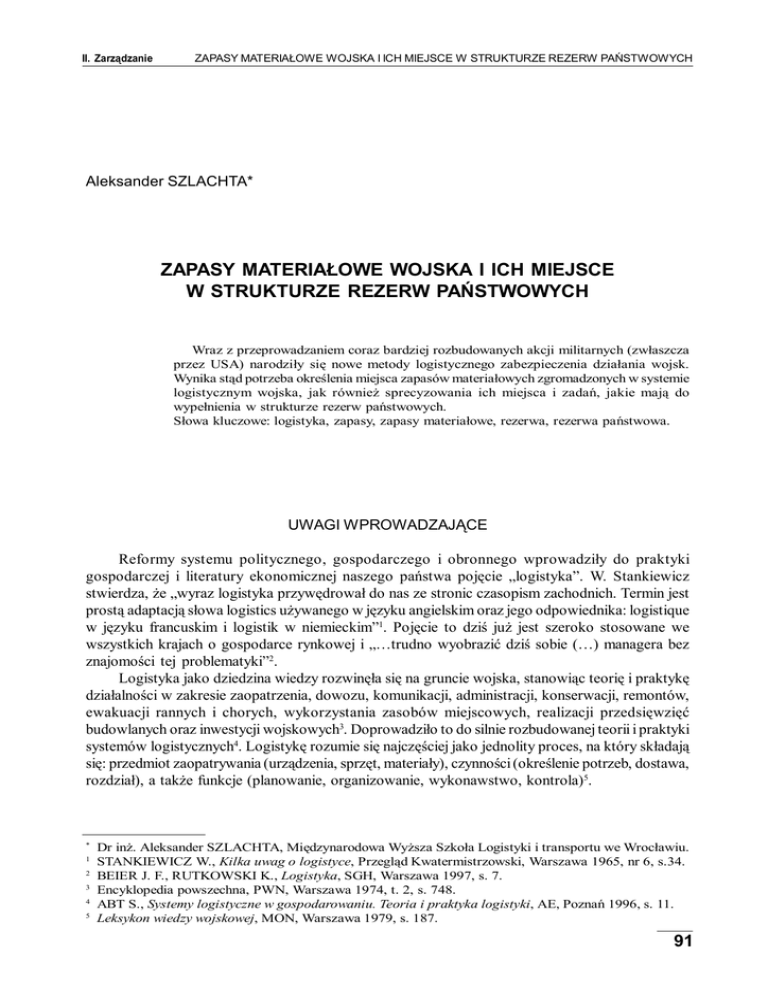 II. Zarządzanie ZAPASY MATERIAŁOWE WOJSKA I ICH MIEJSCE W STRUKTURZE REZERW PAŃSTWOWYCH Aleksander SZLACHTA* ZAPASY MATERIAŁOWE WOJSKA I ICH MIEJSCE W STRUKTURZE REZERW PAŃSTWOWYCH Wraz z przeprowadzaniem coraz bardziej rozbudowanych akcji militarnych (zwłaszcza przez USA) narodziły się nowe metody logistycznego zabezpieczenia działania wojsk. Wynika stąd potrzeba określenia miejsca zapasów materiałowych zgromadzonych w systemie logistycznym wojska, jak również sprecyzowania ich miejsca i zadań, jakie mają do wypełnienia w strukturze rezerw państwowych. Słowa kluczowe: logistyka, zapasy, zapasy materiałowe, rezerwa, rezerwa państwowa. UWAGI WPROWADZAJĄCE Reformy systemu politycznego, gospodarczego i obronnego wprowadziły do praktyki gospodarczej i literatury ekonomicznej naszego państwa pojęcie „logistyka”. W. Stankiewicz stwierdza, że „wyraz logistyka przywędrował do nas ze stronic czasopism zachodnich. Termin jest prostą adaptacją słowa logistics używanego w języku angielskim oraz jego odpowiednika: logistique w języku francuskim i logistik w niemieckim”1. Pojęcie to dziś już jest szeroko stosowane we wszystkich krajach o gospodarce rynkowej i „…trudno wyobrazić dziś sobie (…) managera bez znajomości tej problematyki”2. Logistyka jako dziedzina wiedzy rozwinęła się na gruncie wojska, stanowiąc teorię i praktykę działalności w zakresie zaopatrzenia, dowozu, komunikacji, administracji, konserwacji, remontów, ewakuacji rannych i chorych, wykorzystania zasobów miejscowych, realizacji przedsięwzięć budowlanych oraz inwestycji wojskowych3. Doprowadziło to do silnie rozbudowanej teorii i praktyki systemów logistycznych4. Logistykę rozumie się najczęściej jako jednolity proces, na który składają się: przedmiot zaopatrywania (urządzenia, sprzęt, materiały), czynności (określenie potrzeb, dostawa, rozdział), a także funkcje (planowanie, organizowanie, wykonawstwo, kontrola)5. * 1 2 3 4 5 Dr inż. Aleksander SZLACHTA, Międzynarodowa Wyższa Szkoła Logistyki i transportu we Wrocławiu. STANKIEWICZ W., Kilka uwag o logistyce, Przegląd Kwatermistrzowski, Warszawa 1965, nr 6, s.34. BEIER J. F., RUTKOWSKI K., Logistyka, SGH, Warszawa 1997, s. 7. Encyklopedia powszechna, PWN, Warszawa 1974, t. 2, s. 748. ABT S., Systemy logistyczne w gospodarowaniu. Teoria i praktyka logistyki, AE, Poznań 1996, s. 11. Leksykon wiedzy wojskowej, MON, Warszawa 1979, s. 187. 91 ZAPASY MATERIAŁOWE WOJSKA I ICH MIEJSCE W STRUKTURZE REZERW PAŃSTWOWYCH II. Zarządzanie Różni autorzy, definiując pojęcie logistyki wojskowej, piszą, iż „jest to dziedzina nauk wojskowych zajmująca się teorią i praktyką zasilania wojsk w czasie pokoju, kryzysu, zagrożenia militarnego, konfliktu zbrojnego i wojny”6 albo że „logistyka wojskowa jest działem sztuki wojennej o planowaniu, przygotowaniu i realizacji dostaw zaopatrzenia, świadczeniu usług zapewniających wojskom skuteczne szkolenie i prowadzenie działań bojowych”7. E. Nowak uważa, że „logistyka wojskowa to dziedzina wiedzy o procesie zarządzania łańcuchem dostaw i usług dla wojsk walczących oraz dowodzenia oddziałami (pododdziałami) logistycznymi”8. Według H. Kottegena, logistyka obejmuje ponadto problemy: transportu rannych i chorych oraz ich hospitalizację, a także łączność w sprawach logistyki oraz działalność administracyjną9. Choć dotychczas nie przyjęto powszechnie jednej definicji logistyki, sądzę, iż można bez obaw określić, że „jej istotą jest przepływ dóbr materialnych i informacji, z czym wiążą się: kształtowanie intensywności strumieni, stopień ich ciągłości i niezawodności, sterowanie zapasami itp.”10. SYSTEM LOGISTYCZNY WOJSKA System logistyczny Sił Zbrojnych to organizacja wojskowa, złożona z organów kierowania oraz jednostek i urządzeń logistycznych sprzężonych ze sobą wzajemnymi relacjami. Mają adekwatną do realizowanych procesów i posiadanych zasobów infrastrukturę, warunkującą przemianę zasobów logistycznych w procesy logistyczne. Umożliwia ona określonym zasobom logistycznym pokonanie czasu i przestrzeni, a co za tym idzie, realizację funkcji zabezpieczenia logistycznego11. Zadaniem systemu logistycznego zaopatrywania jest obsługa kompleksu przedsięwzięć, związanych z zasilaniem wojsk wszystkimi rodzajami zaopatrzenia. Istota jego działania to ustalenie potrzeb, zgromadzenie i utrzymanie, określonych normami, zapasów środków zaopatrzenia. Odtwarzanie za ich pomocą, zużywanych na poszczególnych szczeblach organizacyjnych zapasów oraz świadczenie niezbędnych do realizacji zadań usług, zarówno w czasie pokoju, jak i wojny. Aby podołać tym zadaniom, system logistyczny Sił Zbrojnych RP składa się z następujących podsystemów: · zaopatrywania; · eksploatacji; · infrastruktury; · ochrony zdrowia; · transportu wojskowego. A więc jest to „celowo określony zbiór elementów o określonych właściwościach oraz relacjach między tymi elementami i (lub) między ich właściwościami”12. 6 DWORECKI S. E., Logistyka w wojsku, ATKA, Warszawa 1997, s. 42. Zasady funkcjonowania systemu logistycznego SZ RP, Inspektorat Logistyki SG WP, Szt. Gen. 1429/94, Warszawa 1994, s. 50. 8 NOWAK E., Logistyka lat dziewięćdziesiątych w gospodarce narodowej i w wojsku, Przegląd Kwatermistrzowski, Warszawa 1992, nr 2, s. 10. 9 KOTTEGEN H., Gedanken über Logistik in Theorie und Praxis, Wehrunde 1964 nr 7, s. 361. 10 SARJUSZ - WOLSKI Z., SKOWRONEK CZ., Logistyka, CIM, Warszawa 1995, s. 1. 11 FICOŃ K., Modelowanie infrastruktury wojskowych systemów logistycznych, Zeszyty Naukowe, AON, Warszawa 2000, nr 3(40), s. 137 - 139. 12 SIENKIEWICZ P., Inżynieria systemów, MON, Warszawa 1983, s. 26. 7 92 II. Zarządzanie ZAPASY MATERIAŁOWE WOJSKA I ICH MIEJSCE W STRUKTURZE REZERW PAŃSTWOWYCH W skład systemu zaopatrywania Sił Zbrojnych Rzeczypospolitej Polskiej wchodzą zarówno