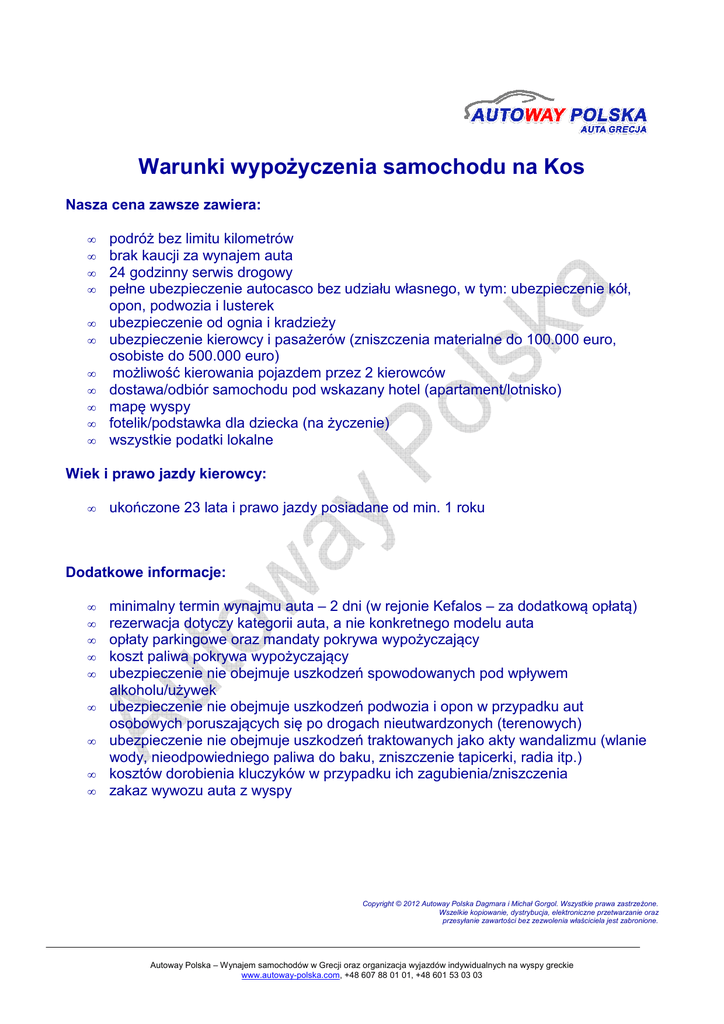 Warunki wypożyczenia samochodu na Kos Nasza cena zawsze zawiera: • • • • • • • • • • • podróż bez limitu kilometrów brak kaucji za wynajem auta 24 godzinny serwis drogowy pełne ubezpieczenie autocasco bez udziału własnego, w tym: ubezpieczenie kół, opon, podwozia i lusterek ubezpieczenie od ognia i kradzieży ubezpieczenie kierowcy i pasażerów (zniszczenia materialne do 100.000 euro, osobiste do 500.000 euro) możliwość kierowania pojazdem przez 2 kierowców dostawa/odbiór samochodu pod wskazany hotel (apartament/lotnisko) mapę wyspy fotelik/podstawka dla dziecka (na życzenie) wszystkie podatki lokalne Wiek i prawo jazdy kierowcy: • ukończone 23 lata i prawo jazdy posiadane od min. 1 roku Dodatkowe informacje: • • • • • • • • • minimalny termin wynajmu auta – 2 dni (w rejonie Kefalos – za dodatkową opłatą) rezerwacja dotyczy kategorii auta, a nie konkretnego modelu auta opłaty parkingowe oraz mandaty pokrywa wypożyczający koszt paliwa pokrywa wypożyczający ubezpieczenie nie obejmuje uszkodzeń spowodowanych pod wpływem alkoholu/używek ubezpieczenie nie obejmuje uszkodzeń podwozia i opon w przypadku aut osobowych poruszających się po drogach nieutwardzonych (terenowych) ubezpieczenie nie obejmuje uszkodzeń traktowanych jako akty wandalizmu (wlanie wody, nieodpowiedniego paliwa do baku, zniszczenie tapicerki, radia itp.) kosztów dorobienia kluczyków w przypadku ich zagubienia/zniszczenia zakaz wywozu auta z wyspy Copyright © 2012 Autoway Polska Dagmara i Michał Gorgol. Wszystkie prawa zastrzeżone. Wszelkie kopiowanie, dystrybucja, elektroniczne przetwarzanie oraz przesyłanie zawartości bez zezwolenia właściciela jest zabronione. Autoway Polska – Wynajem samochodów w Grecji oraz organizacja wyjazdów indywidualnych na wyspy greckie www.autoway-polska.com, +48 607 88 01 01, +48 601 53 03 03