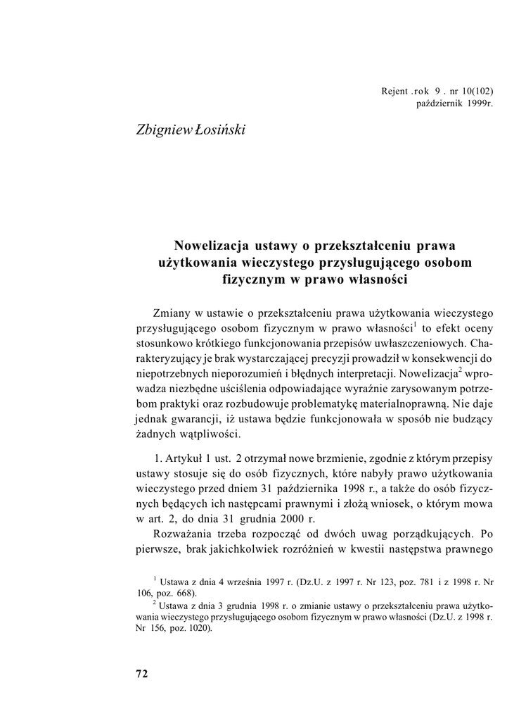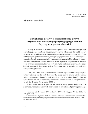 Rejent .rok 9 . nr 10(102) październik 1999r. Zbigniew Łosiński Nowelizacja ustawy o przekształceniu prawa użytkowania wieczystego przysługującego osobom fizycznym w prawo własności Zmiany w ustawie o przekształceniu prawa użytkowania wieczystego przysługującego osobom fizycznym w prawo własności1 to efekt oceny stosunkowo krótkiego funkcjonowania przepisów uwłaszczeniowych. Charakteryzujący je brak wystarczającej precyzji prowadził w konsekwencji do niepotrzebnych nieporozumień i błędnych interpretacji. Nowelizacja2 wprowadza niezbędne uściślenia odpowiadające wyraźnie zarysowanym potrzebom praktyki oraz rozbudowuje problematykę materialnoprawną. Nie daje jednak gwarancji, iż ustawa będzie funkcjonowała w sposób nie budzący żadnych wątpliwości. 1. Artykuł 1 ust. 2 otrzymał nowe brzmienie, zgodnie z którym przepisy ustawy stosuje się do osób fizycznych, które nabyły prawo użytkowania wieczystego przed dniem 31 października 1998 r., a także do osób fizycznych będących ich następcami prawnymi i złożą wniosek, o którym mowa w art. 2, do dnia 31 grudnia 2000 r. Rozważania trzeba rozpocząć od dwóch uwag porządkujących. Po pierwsze, brak jakichkolwiek rozróżnień w kwestii następstwa prawnego 1 Ustawa z dnia 4 września 1997 r. (Dz.U. z 1997 r. Nr 123, poz. 781 i z 1998 r. Nr 106, poz. 668). 2 Ustawa z dnia 3 grudnia 1998 r. o zmianie ustawy o przekształceniu prawa użytkowania wieczystego przysługującego osobom fizycznym w prawo własności (Dz.U. z 1998 r. Nr 156, poz. 1020). 72 Nowelizacja ustawy o przekształceniu prawa użytkowania... uprawnia wniosek, iż zgodnie z zasadą lege non distinguente nec nostrum est distinguere chodzi w równym stopniu o następstwo prawne tak pod tytułem ogólnym, jak i szczególnym3. Po drugie, z uwagi na fakt, iż przewidziany koniec terminu do wykonania czynności (31 grudnia 2000 r.) przypada na dzień uznany za ustawowo wolny od pracy (niedziela), jej prawną skuteczność wyznacza w rzeczywistości data 2 stycznia 2001 r. Znowelizowany art. 1 ust. 2 stanowi istotne novum, zważywszy, iż do tej pory przekształcenie prawa użytkowania wieczystego w prawo własności, w zakresie, w jakim było ono odpłatne, mogło nastąpić jedynie na rzecz osób figurujących w księgach wieczystych jako użytkownicy wieczyści w dniu ogłoszenia ustawy. Ich sukcesorzy nie mieli żadnych podstaw prawnych do występowania z wnioskami przekształceniowymi. Obecne stanowisko ustawodawcy w tej kwestii zasługuje na aprobatę, aczkolwiek z jednym wyjątkiem. Dotyczy on prawnej zasadności utrzymywania rozwiązania przydającego rolę warunku sine ąua non przekształcenia dacie nabycia użytkowania wieczystego. W ustanowieniu daty granicznej, a także w samym fakcie jej przesunięcia, można się doszukać swoistego rozstrzelenia aksjologicznego. Siłę powyższego wniosku wzmacnia konstatacja, iż ograniczenie podmiotowe wynika z treści ustawy, choć w żaden sposób nie daje się wywieść z jej celu. Mamy zatem do czynienia ze stanem, w którym prawodawca stara się w jednym akcie prawnym godzić dwie przeciwstawne sobie tendencje, mimo iż jest to nielogiczne i nieracjonalne zarazem. 2. Doniosłe znaczenie wiązać trzeba z art. 1 ust. 2a. Zawarto w nim regułę, w myśl której przepis art. 1 ust. 2 znajduje zastosowanie także do tych osób fizycznych, z którymi przed dniem 31 października 1998 r. zawarto notarialne umowy ustanawiające prawo użytkowania wieczystego. W tych przypadkach wydanie decyzji w sprawie przekształcenia będzie mogło nastąpić po dokonaniu wpisu prawa użytkowania wieczystego w księdze wieczystej. Przyjęte rozwiązanie eliminuje poważny niedostatek dotychczasowej nieścisłej regulacji prawnej, pozwalającej wnioskować o przyznaniu umowie notarialnej ustanawiającej użytkowanie wieczyste znaczenia aktu 3 Na temat zawartości jurydycznej terminu: „następstwo prawne" zob. np. Z. R a d w a ń ski, Prawo cywilne - część ogólna. Warszawa 1994, s. 88 i nast.; A. Wo 1 ter, Prawo cywilne - część ogólna. Warszawa 1979, s. 128 i nast. 73 Zbigniew Łosiński powodującego powstanie tego prawa, a w konsekwencji o przełamaniu dla celów uwłaszczenia zasady konstytutywności wpisu wieczystoksięgowego4. Podkreślić należy, iż ustęp 2a nie przyniósł rzeczywistej zmiany hipotezy art. 1 ust. 2. W istocie ma on jedynie znaczenie porządkujące. Doprecyzowuje tekst prawny, zapewniając tym samym lepsząjego komunikatywność. 3. W znowelizowanej ustawie znalazł się zapis o odpowiednim stosowaniu mechanizmu przekształceniowego do osób fizycznych, które nabyły gospodarstwo rolne na podstawie aktu nadania5 albo do ich następców, będących posiadaczami tych gospodarstw (art. lust. 4). Warto odnotować, iż gros osób, o których mowa, uzyskało już tytuły własności przedmiotowych nieruchomości w drodze prawomocnych orzeczeń o wykonaniu aktów nadania6 oraz w trybie uwłaszczenia regulowanego dekretem z dnia 6 września 1951 r. o ochronie i uregulowaniu własności osadniczych gospodarstw chłopskich na obszarze Ziem Odzyskanych7. Wyjaśnić przy tym trzeba, iż wzmiankowane orzekanie nie stanowiło reguły (na 483 307 gospodarstw osadniczych istniejących w 1950 r. jedynie około 100 000 uzyskało orzeczenie o wykonaniu aktu nadania8), a zakres uwłaszczenia z 1951 r. był ograniczony podmiotowo, obejmując tych osadników, którzy w dniu wejścia w życie dekretu posiadali gospodarstwa i up4 Podstawy takiej konstatacji upatrywać można było w treści § 3 pkt 1 rozporządzenia Ministra Sprawiedliwości z dnia 19 grudnia 1997 r. w sprawie wniosku o przekształcenie prawa użytkowania wieczystego przysługującego osobom fizycznym w prawo własności (Dz.U. z 1997 r. Nr 157, poz. 1037). W tej kwestii zob. np. G. K o b u s z e w s k a - B o n i ec ka, Użytkownik może stać się właścicielem, Gazeta Prawna z dnia 23 czerwca 1998 r., nr 24, s. 40. 5 