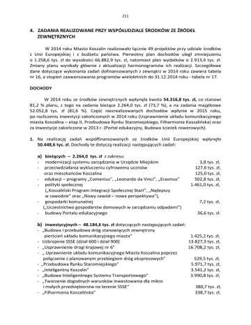 211 4. ZADANIA REALIZOWANE PRZY WSPÓŁUDZIALE ŚRODKÓW ZE ŹRÓDEŁ ZEWNĘTRZNYCH W 2014 roku Miasto Koszalin realizowało łącznie 49 projektów przy udziale środków z Unii Europejskiej i z budżetu państwa. Pierwotny plan dochodów uległ zmniejszeniu o 1.258,6 tys. zł do wysokości 66.882,9 tys. zł, natomiast plan wydatków o 2.913,4 tys. zł. Zmiany planu wynikały głównie z aktualizacji harmonogramów ich realizacji. Szczegółowe dane dotyczące wykonania zadań dofinansowanych z zewnątrz w 2014 roku zawiera tabela nr 16, a stopień zaawansowania programów wieloletnich do 31.12.2014 roku - tabela nr 17. DOCHODY W 2014 roku ze środków zewnętrznych wpłynęła kwota 54.316,8 tys. zł, co stanowi 81,2 % planu, z tego na zadania bieżące 2.264,0 tys. zł (73,7 %), a na zadania majątkowe 52.052,8 tys. zł (81,6 %). Część niezrealizowanych dochodów wpłynie w 2015 roku, po rozliczeniu inwestycji zakończonych w 2014 roku (Usprawnienie układu komunikacyjnego miasta Koszalina – etap II, Przebudowa Rynku Staromiejskiego, Filharmonia Koszalińska) oraz za inwestycje zakończone w 2013 r. (Portal edukacyjny, Budowa ścieżek rowerowych). 1. Na realizację zadań współfinansowanych ze środków Unii Europejskiej wpłynęło 50.448,6 tys. zł. Dochody te dotyczą realizacji następujących zadań: a) bieżących – 2.264,0 tys. zł z zakresu: - - modernizacji systemu zarządzania w Urzędzie Miejskim przeciwdziałania wykluczeniu cyfrowemu uczniów oraz mieszkańców Koszalina edukacji – programy „Comenius”, „Leonardo da Vinci”, „Erasmus” polityki społecznej („Koszaliński Program Integracji Społecznej Start”, „Najlepszy w zawodzie” oraz „Nowy zawód – nowa perspektywa”), gospodarki komunalnej („Uczestnictwo gospodarstw domowych w zarządzaniu odpadami”) budowy Portalu edukacyjnego 3,8 tys. zł, 127,6 tys. zł, 125,0 tys. zł, 502,8 tys. zł, 1.461,0 tys. zł, 7,2 tys. zł, 36,6 tys. zł. b) inwestycyjnych – 48.184,6 tys. zł dotyczących następujących zadań: - „Budowa i przebudowa dróg stanowiących zewnętrzny pierścień układu komunikacyjnego miasta” - Uzbrojenie SSSE (dział 600 i dział 900) - „Usprawnienie drogi krajowej nr 6” - „ Uprawnienie układu komunikacyjnego Miasta Koszalina poprzez połączenie z planowanym przebiegiem dróg ekspresowych” - „Przebudowa Rynku Staromiejskiego” - „Inteligentny Koszalin” - „Budowa Inteligentnego Systemu Transportowego” - „Tworzenie dogodnych warunków inwestowania dla mikro i małych przedsiębiorstw na terenie SSSE” - „Filharmonia Koszalińska” 1.425,2 tys. zł, 13.827,3 tys. zł, 16.708,2 tys. zł, 529,5 tys. zł, 5.971,7 tys. zł, 3.541,2 tys. zł, 3.990,8 tys. zł, 380,7 tys. zł, 338,7 tys. zł, 212 - „System gospodarki odpadami oraz budowa zakładu termicznego przekształcania odpadów dla miast i gmin Pomorza Środkowego” – etap przygotowawczy” 1.471,3 tys. zł. 2. Na realizację zadań współfinansowanych z budżetu państwa wpłynęła kwota 3.868,2 tys. zł (65,3 % planu), która dotyczy następujących zadań: a) ul. 4 Marca (subwencja) 937,1 tys. zł, b) budowa ul. Rolnej (Narodowy Program Przebudowy Dróg Lokalnych) 1.851,1 tys. zł, c) budowa Domu Pomocy Społecznej (PFRON) 1.080,0 tys. zł. WYDATKI W 2014 roku zadania przy współudziale środków z Unii Europejskiej oraz dotacji z budżetu państwa zrealizowane zostały na kwotę 90.492,1 tys. zł, co stanowi 88,8 % planu. Na niższe zaawansowanie planu w projektach informatycznych wpłynęły opóźnienia realizacji zadań przez wykonawców, przedłużające się procedury przetargowe oraz zmiany harmonogramów robót. Zadania współfinansowane ze środków Unii Europejskiej zrealizowano na kwotę 81.379,7 tys. zł, co stanowi 90,8 % planu i są to: 1. Wydatki na zadania bieżące zrealizowane w kwocie 3.947,5 tys. zł (79,6 % planu): a) „Rozwój Systemu Informacji Przestrzennej Miasta Koszalina” 543,4 tys. zł, Projekt polega na założeniu bazy danych geodezyjnej ewidencji sieci uzbrojenia terenu oraz dostosowaniu eksploatowanych systemów informatycznych i baz danych do obecnie obowiązujących regulacji prawa. Usługi przeglądania danych przestrzennych będą dostępne nieodpłatnie w Urzędzie Miejskim oraz poprzez sieć Internet. b) „Modernizacja systemu zarządzania w Urzędzie Miejskim” 288,0 tys. zł, Projekt zakończony w 2014 roku, jego celem było rozszerzenie i podniesienie kwalifikacji zawodowych pracowników oraz wzrost kompetencji zarządczych kierowników poprzez szkolenia organizowane dla pracowników Urzędu Miejskiego. c) „Przeciwdziałanie wykluczeniu cyfrowemu uczniów koszalińskich szkół” 127,4 tys. zł, Dzięki realizacji projektu 150 uczniów pobierających stypendia socjalne i wykazujących się najlepszymi wynikami w nauce otrzymało zestawy komputerowe z dostępem do Internetu i z zainstalowanymi systemami oraz odbyło szkolenie z obsługi komputera i niezbędnych programów. W okresie realizacji i trwałości projektu zapewnione zostało serwisowanie zestawów komputerowych oraz dostęp do Internetu. d) „Przeciwdziałanie wykluczeniu cyfrowemu mieszkańców Koszalina” 144,8 tys. zł, W 2014 r. Miasto zakończyło realizację projektu, dzięki któremu 30 gospodarstw domowych osób niepełnosprawnych, Koszalińska Biblioteka Publiczna oraz jej 10 filii, a także 28 szkół otrzymało zestawy komputerowe i drukarki wraz z dostępem do Internetu. W ramach utrzymania trwałości projektu zapewniony zostanie serwis sprzętu oraz dostęp do Internetu. e) „Comenius”, „Leonardo da Vinci” i „Erasmus” 1.204,0 tys. zł, W 2014 roku koszalińskie placówki oświatowe realizowały 17 projektów, które w całości finansowane są z funduszy europejskich. 213 f) „Koszaliński Program Integracji Społecznej Start 2008-2014” 667,1 tys. zł, Projekt zakończony w 2014 roku i realizowany przez Miejski Ośrodek Pomocy Społecznej