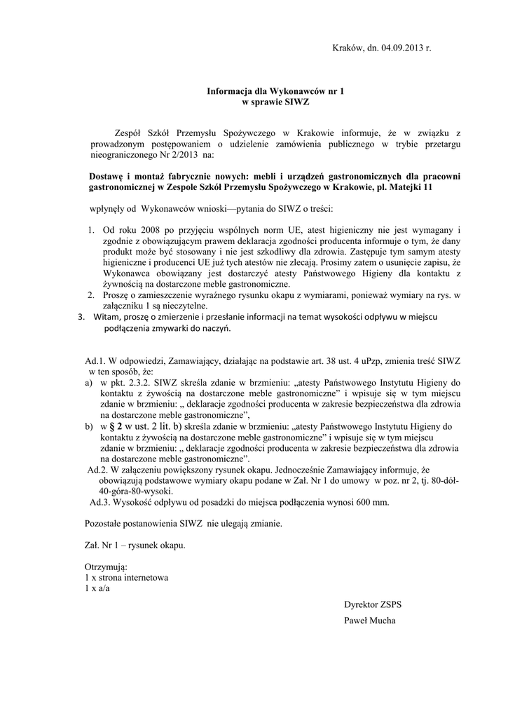 Kraków, dn. 04.09.2013 r. Informacja dla Wykonawców nr 1 w sprawie SIWZ Zespół Szkół Przemysłu Spożywczego w Krakowie informuje, że w związku z prowadzonym postępowaniem o udzielenie zamówienia publicznego w trybie przetargu nieograniczonego Nr 2/2013 na: Dostawę i montaż fabrycznie nowych: mebli i urządzeń gastronomicznych dla pracowni gastronomicznej w Zespole Szkół Przemysłu Spożywczego w Krakowie, pl. Matejki 11 wpłynęły od Wykonawców wnioski—pytania do SIWZ o treści: 1. Od roku 2008 po przyjęciu wspólnych norm UE, atest higieniczny nie jest wymagany i zgodnie z obowiązującym prawem deklaracja zgodności producenta informuje o tym, że dany produkt może być stosowany i nie jest szkodliwy dla zdrowia. Zastępuje tym samym atesty higieniczne i producenci UE już tych atestów nie zlecają. Prosimy zatem o usunięcie zapisu, że Wykonawca obowiązany jest dostarczyć atesty Państwowego Higieny dla kontaktu z żywnością na dostarczone meble gastronomiczne. 2. Proszę o zamieszczenie wyraźnego rysunku okapu z wymiarami, ponieważ wymiary na rys. w załączniku 1 są nieczytelne. 3. Witam, proszę o zmierzenie i przesłanie informacji na temat wysokości odpływu w miejscu podłączenia zmywarki do naczyń. Ad.1. W odpowiedzi, Zamawiający, działając na podstawie art. 38 ust. 4 uPzp, zmienia treść SIWZ w ten sposób, że: a) w pkt. 2.3.2. SIWZ skreśla zdanie w brzmieniu: „atesty Państwowego Instytutu Higieny do kontaktu z żywością na dostarczone meble gastronomiczne” i wpisuje się w tym miejscu zdanie w brzmieniu: „ deklaracje zgodności producenta w zakresie bezpieczeństwa dla zdrowia na dostarczone meble gastronomiczne”, b) w § 2 w ust. 2 lit. b) skreśla zdanie w brzmieniu: „atesty Państwowego Instytutu Higieny do kontaktu z żywością na dostarczone meble gastronomiczne” i wpisuje się w tym miejscu zdanie w brzmieniu: „ deklaracje zgodności producenta w zakresie bezpieczeństwa dla zdrowia na dostarczone meble gastronomiczne”. Ad.2. W załączeniu powiększony rysunek okapu. Jednocześnie Zamawiający informuje, że obowiązują podstawowe wymiary okapu podane w Zał. Nr 1 do umowy w poz. nr 2, tj. 80-dół40-góra-80-wysoki. Ad.3. Wysokość odpływu od posadzki do miejsca podłączenia wynosi 600 mm. Pozostałe postanowienia SIWZ nie ulegają zmianie. Zał. Nr 1 – rysunek okapu. Otrzymują: 1 x strona internetowa 1 x a/a Dyrektor ZSPS Paweł Mucha