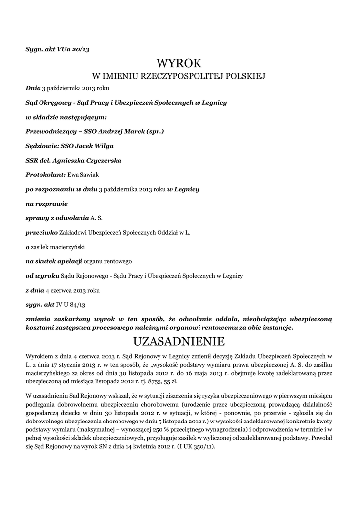 Sygn. akt VUa 20/13 WYROK W IMIENIU RZECZYPOSPOLITEJ POLSKIEJ Dnia 3 października 2013 roku Sąd Okręgowy - Sąd Pracy i Ubezpieczeń Społecznych w Legnicy w składzie następującym: Przewodniczący – SSO Andrzej Marek (spr.) Sędziowie: SSO Jacek Wilga SSR del. Agnieszka Czyczerska Protokolant: Ewa Sawiak po rozpoznaniu w dniu 3 października 2013 roku w Legnicy na rozprawie sprawy z odwołania A. S. przeciwko Zakładowi Ubezpieczeń Społecznych Oddział w L. o zasiłek macierzyński na skutek apelacji organu rentowego od wyroku Sądu Rejonowego - Sądu Pracy i Ubezpieczeń Społecznych w Legnicy z dnia 4 czerwca 2013 roku sygn. akt IV U 84/13 zmienia zaskarżony wyrok w ten sposób, że odwołanie oddala, nieobciążając ubezpieczoną kosztami zastępstwa procesowego należnymi organowi rentowemu za obie instancje. UZASADNIENIE Wyrokiem z dnia 4 czerwca 2013 r. Sąd Rejonowy w Legnicy zmienił decyzję Zakładu Ubezpieczeń Społecznych w L. z dnia 17 stycznia 2013 r. w ten sposób, że „wysokość podstawy wymiaru prawa ubezpieczonej A. S. do zasiłku macierzyńskiego za okres od dnia 30 listopada 2012 r. do 16 maja 2013 r. obejmuje kwotę zadeklarowaną przez ubezpieczoną od miesiąca listopada 2012 r. tj. 8755, 55 zł. W uzasadnieniu Sad Rejonowy wskazał, że w sytuacji ziszczenia się ryzyka ubezpieczeniowego w pierwszym miesiącu podlegania dobrowolnemu ubezpieczeniu chorobowemu (urodzenie przez ubezpieczoną prowadzącą działalność gospodarczą dziecka w dniu 30 listopada 2012 r. w sytuacji, w której - ponownie, po przerwie - zgłosiła się do dobrowolnego ubezpieczenia chorobowego w dniu 5 listopada 2012 r.) w wysokości zadeklarowanej konkretnie kwoty podstawy wymiaru (maksymalnej – wynoszącej 250 % przeciętnego wynagrodzenia) i odprowadzenia w terminie i w pełnej wysokości składek ubezpieczeniowych, przysługuje zasiłek w wyliczonej od zadeklarowanej podstawy. Powołał się Sąd Rejonowy na wyrok SN z dnia 14 kwietnia 2012 r. (I UK 350/11). Apelację od tego orzeczenia wniósł organ rentowy zarzucając naruszenie prawa materialnego poprzez błędną jego wykładnię w szczególności art. 6 ust.1, 29 ust.1 i 52 w związku z art. 48 oraz 49 zasiłkowej (ustawy z dnia 25 czerwca 1999 r. o świadczeniach pieniężnych z ubezpieczenia społecznego w razie choroby i macierzyństwa) poprzez ustalenie, że podstawa wymiaru zasiłku macierzyńskiego wnioskodawczyni za okres od 30 listopada 2012 r. do 16 maja 2013 r. wynosi 8.755, 55 zł. Powołując ten zarzut organ rentowy wniósł o wydanie orzeczenia reformatoryjnego i oddalenie odwołania. Sąd Okręgowy zważył, co następuje: Spór sprowadza się do ustalenia, czy podstawa wymiaru zasiłku macierzyńskiego wnioskodawczyni - która (ponownie) od 5 listopada 2012 r. jako osoba prowadząca działalność gospodarczą wniosła o objęcie dobrowolnym ubezpieczaniem chorobowym i w tym samym miesiącu tj. 30 listopada 2012 r. urodziła dziecko – może być ustalona na maksymalnym poziomie (zadeklarowana przez wnioskodawczynie za ten miesiąc maksymalna podstawa wymiaru stanowiącą 250 % przeciętnego wynagrodzenia w poprzednim kwartale), czy też - jak to przyjął organ rentowy – na poziomie minimalnym określonym w art. 49 pkt 1 ustawy zasiłkowej. Zaprezentowany przez Sad Rejonowy pogląd w tym zakresie nie zasługuje – w ocenie Sądu Okręgowego – na aprobatę. W tej sytuacji nie znajdują zastosowania ogólne reguły ustalania wysokości tego zasiłku (art. 48 – 52 ustawy zasiłkowej) wynikające z przyjęcia do podstawy wymiaru przychodu (w rozumieniu art. 3 pkt 4 ustawy, czyli zadeklarowanej kwoty stanowiąca podstawę wymiaru składek na dobrowolne ubezpieczenie chorobowe po odliczeniu kwoty określonej w tym przepisie) za okres 12 miesięcy lub przychodu osiągniętego w krótszym okresie, jeżeli przesłanka prawa do świadczeń z ubezpieczenia wypełniła się przed upływem 12 miesięcy prowadzenia działalności. Reguły te nie są bowiem odpowiednie wobec ubezpieczonej, której prawo do świadczeń powstało w pierwszym miesiącu po przystąpieniu do ubezpieczenia, w związku z czym okres ubezpieczenia przed urodzeniem dziecka nie trwał przez co najmniej jeden pełny miesiąc. Nie jest możliwe wówczas odwołanie się do jakiegokolwiek okresu ubezpieczenia obejmującego jeden pełny miesiąc kalendarzowy, a skoro okres uwzględniany w podstawie wymiaru zasiłku nie może być dłuższy niż 12 miesięcy ale i nie krótszy niż pełny miesiąc kalendarzowy i musi w całości przypadać na czas aktualnego ubezpieczenia, to zasad ustalania podstawy wymiaru zasiłku macierzyńskiego należy poszukiwać w innych przepisach, niż art. 48 ust. 1 i odpowiednio stosowany art. 36 ust. 2 ustawy o świadczeniach pieniężnych z ubezpieczenia społecznego w razie choroby i macierzyństwa. W ustawie o świadczeniach pieniężnych z ubezpieczenia społecznego w razie choroby i macierzyństwa ustanowiono inną zasadę ustalania podstawy wymiaru zasiłku z ubezpieczenia chorobowego przysługującego w wypadku, gdy przed powstaniem niezdolności do pracy ubezpieczenie nie trwało przez co najmniej jeden miesiąc kalendarzowy. Przewidziano zastąpienie proporcjonalnej wielkości przychodu kwotami zastępczymi - odpowiednio - w odniesieniu do zasiłku wynikającego z wykonywania zatrudnienia na podstawie umowy o pracę kwotą wynagrodzenia, które ubezpieczony pracownik osiągnąłby, gdyby pracował cały miesiąc (art. 37 ustawy zasiłkowej), a do innych ubezpieczonych, kwotami wskazanymi w art. 49 tej ustawy. Stosownie do tego przepisu, przy ustalaniu podstawy wymiaru dla ubezpieczonych nie będących pracownikami, przychód pochodzący z niepełnego miesiąca kalendarzowego, ze względu na powstanie przesłanki prawa do zasiłku macierzyńskiego przed jego upływem, zastępowany jest kwotami zastępczymi wskazanymi w art. 49 pkt 1-4 ustawy. W art. 49 pkt 1 ustawy postanowiono, że w wypadku ubezp