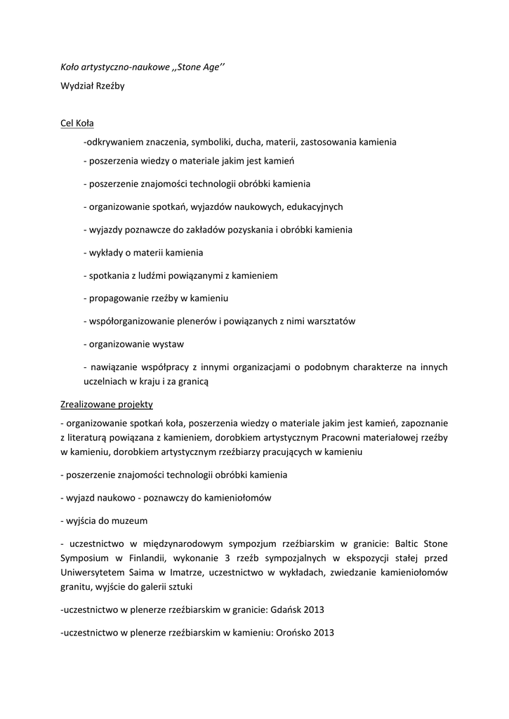 Koło artystyczno-naukowe ,,Stone Age’’ Wydział Rzeźby Cel Koła -odkrywaniem znaczenia, symboliki, ducha, materii, zastosowania kamienia - poszerzenia wiedzy o materiale jakim jest kamień - poszerzenie znajomości technologii obróbki kamienia - organizowanie spotkań, wyjazdów naukowych, edukacyjnych - wyjazdy poznawcze do zakładów pozyskania i obróbki kamienia - wykłady o materii kamienia - spotkania z ludźmi powiązanymi z kamieniem - propagowanie rzeźby w kamieniu - współorganizowanie plenerów i powiązanych z nimi warsztatów - organizowanie wystaw - nawiązanie współpracy z innymi organizacjami o podobnym charakterze na innych uczelniach w kraju i za granicą Zrealizowane projekty - organizowanie spotkań koła, poszerzenia wiedzy o materiale jakim jest kamień, zapoznanie z literaturą powiązana z kamieniem, dorobkiem artystycznym Pracowni materiałowej rzeźby w kamieniu, dorobkiem artystycznym rzeźbiarzy pracujących w kamieniu - poszerzenie znajomości technologii obróbki kamienia - wyjazd naukowo - poznawczy do kamieniołomów - wyjścia do muzeum - uczestnictwo w międzynarodowym sympozjum rzeźbiarskim w granicie: Baltic Stone Symposium w Finlandii, wykonanie 3 rzeźb sympozjalnych w ekspozycji stałej przed Uniwersytetem Saima w Imatrze, uczestnictwo w wykładach, zwiedzanie kamieniołomów granitu, wyjście do galerii sztuki -uczestnictwo w plenerze rzeźbiarskim w granicie: Gdańsk 2013 -uczestnictwo w plenerze rzeźbiarskim w kamieniu: Orońsko 2013 - wyjazd na targi kamienia: Kamień-Stone Poznań 2013 - tworzenie wirtualnej biblioteki tematycznej Data założenia 12.01.2013 Do kogo kierowane jest koło? Koło skierowane jest wszystkich studentów zainteresowanych rzeźbą, w szczególności rzeźbą w kamieniu, a także samym kamieniem - poznaniem jego materii i ducha, wykorzystaniem w sztuce, literaturze, architekturze oraz w innych dziedzinach, pozyskiwaniem, wydobyciem, obróbką, wykorzystaniem, mineralogią, petrologią. Spotkania Koła mają charakter otwarty, zapraszamy wszystkich zainteresowanych. Przewodniczący/a Beata Małgorzata Poździk Data i miejsce spotkań Piątki, godz. 17.00, Biuro Samorządu Studenckiego ASP, Plac Matejki 13 Kontakt e-mail : [email protected] przewodnicząca : [email protected] , tel. 600272602