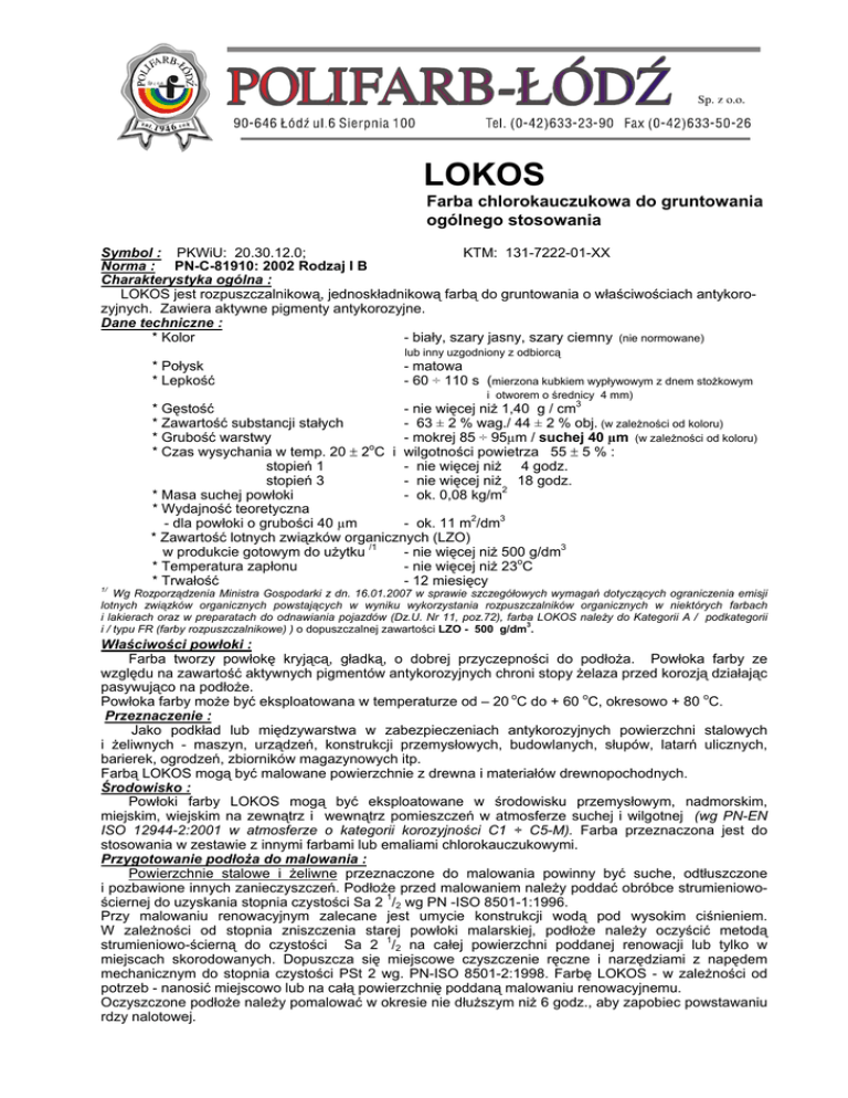 LOKOS Farba chlorokauczukowa do gruntowania ogólnego stosowania Symbol : PKWiU: 20.30.12.0; KTM: 131-7222-01-XX Norma : PN-C-81910: 2002 Rodzaj I B Charakterystyka ogólna : LOKOS jest rozpuszczalnikową, jednoskładnikową farbą do gruntowania o właściwościach antykorozyjnych. Zawiera aktywne pigmenty antykorozyjne. Dane techniczne : * Kolor - biały, szary jasny, szary ciemny (nie normowane) lub inny uzgodniony z odbiorcą * Połysk * Lepkość - matowa - 60 ÷ 110 s (mierzona kubkiem wypływowym z dnem stożkowym i otworem o średnicy 4 mm) 1/ * Gęstość - nie więcej niż 1,40 g / cm3 * Zawartość substancji stałych - 63 ± 2 % wag./ 44 ± 2 % obj. (w zależności od koloru) * Grubość warstwy - mokrej 85 ÷ 95µm / suchej 40 µm (w zależności od koloru) * Czas wysychania w temp. 20 ± 2oC i wilgotności powietrza 55 ± 5 % : stopień 1 - nie więcej niż 4 godz. stopień 3 - nie więcej niż 18 godz. * Masa suchej powłoki - ok. 0,08 kg/m2 * Wydajność teoretyczna - dla powłoki o grubości 40 µm - ok. 11 m2/dm3 * Zawartość lotnych związków organicznych (LZO) w produkcie gotowym do użytku /1 - nie więcej niż 500 g/dm3 * Temperatura zapłonu - nie więcej niż 23oC * Trwałość - 12 miesięcy Wg Rozporządzenia Ministra Gospodarki z dn. 16.01.2007 w sprawie szczegółowych wymagań dotyczących ograniczenia emisji lotnych związków organicznych powstających w wyniku wykorzystania rozpuszczalników organicznych w niektórych farbach i lakierach oraz w preparatach do odnawiania pojazdów (Dz.U. Nr 11, poz.72), farba LOKOS należy do Kategorii A / podkategorii 3 i / typu FR (farby rozpuszczalnikowe) ) o dopuszczalnej zawartości LZO - 500 g/dm . Właściwości powłoki : Farba tworzy powłokę kryjącą, gładką, o dobrej przyczepności do podłoża. Powłoka farby ze względu na zawartość aktywnych pigmentów antykorozyjnych chroni stopy żelaza przed korozją działając pasywująco na podłoże. Powłoka farby może być eksploatowana w temperaturze od – 20 oC do + 60 oC, okresowo + 80 oC. Przeznaczenie : Jako podkład lub międzywarstwa w zabezpieczeniach antykorozyjnych powierzchni stalowych i żeliwnych - maszyn, urządzeń, konstrukcji przemysłowych, budowlanych, słupów, latarń ulicznych, barierek, ogrodzeń, zbiorników magazynowych itp. Farbą LOKOS mogą być malowane powierzchnie z drewna i materiałów drewnopochodnych. Środowisko : Powłoki farby LOKOS mogą być eksploatowane w środowisku przemysłowym, nadmorskim, miejskim, wiejskim na zewnątrz i wewnątrz pomieszczeń w atmosferze suchej i wilgotnej (wg PN-EN ISO 12944-2:2001 w atmosferze o kategorii korozyjności C1 ÷ C5-M). Farba przeznaczona jest do stosowania w zestawie z innymi farbami lub emaliami chlorokauczukowymi. Przygotowanie podłoża do malowania : Powierzchnie stalowe i żeliwne przeznaczone do malowania powinny być suche, odtłuszczone i pozbawione innych zanieczyszczeń. Podłoże przed malowaniem należy poddać obróbce strumieniowościernej do uzyskania stopnia czystości Sa 2 1/2 wg PN -ISO 8501-1:1996. Przy malowaniu renowacyjnym zalecane jest umycie konstrukcji wodą pod wysokim ciśnieniem. W zależności od stopnia zniszczenia starej powłoki malarskiej, podłoże należy oczyścić metodą strumieniowo-ścierną do czystości Sa 2 1/2 na całej powierzchni poddanej renowacji lub tylko w miejscach skorodowanych. Dopuszcza się miejscowe czyszczenie ręczne i narzędziami z napędem mechanicznym do stopnia czystości PSt 2 wg. PN-ISO 8501-2:1998. Farbę LOKOS - w zależności od potrzeb - nanosić miejscowo lub na całą powierzchnię poddaną malowaniu renowacyjnemu. Oczyszczone podłoże należy pomalować w okresie nie dłuższym niż 6 godz., aby zapobiec powstawaniu rdzy nalotowej. Farbę LOKOS można nakładać bezpośrednio na podłoże stalowe lub na powłoki farby chlorokauczukowej do gruntowania przeciwrdzewnej LOKOR-2 czerwonej tlenkowej (KTM: 131-7221-0451), którą zastosowano jako zabezpieczenie czasowe. Przedmioty zabezpieczone czasowo - w zależności od warunków składowania - należy odpylić i/lub umyć pod ciśnieniem wodnym roztworem preparatu myjąco – odtłuszczającego, np. Emulsol RN-1. Powierzchnie z drewna i materiałów drewnopochodnych można uprzednio zaimpregnować Impregnatem do gruntowania chemoodpornym bezbarwnym. Przy malowaniu renowacyjnym powierzchnie drewniane umyć wodą z dodatkiem środków do mycia i wysuszyć. Powłokę malarską słabo trzymającą się podłoża należy usunąć. W razie potrzeby całą powierzchnię przeszlifować i/lub zaimpregnować impregnatem jw. Rysy i niewielkie wgłębienia podłoża można uzupełnić odpowiednimi materiałami wyrównującymi. Warunki malowania : Temperatura farby Temperatura podłoża Wilgotność wzgl. powietrza 10 ÷ 30 oC 5 ÷ 40 oC najwyżej 80 % Temperatura podłoża powinna być wyższa od punktu rosy o co najmniej o 3oC. Farbę przed użyciem należy dokładnie wymieszać nawet w przypadku stwierdzenia braku osadu. Sposób aplikacji : Farbę można nakładać : - pędzlem lub wałkiem: rozcieńczenie 0 ÷ 3 % wag. - przez zanurzenie lub polewanie : rozcieńczenie 0 ÷ 10 % wag. - natryskiem powietrznym : rozcieńczenie 5 ÷ 10 % wag. - natryskiem bezpowietrznym: rozcieńczenie 0 ÷ 3 % wag., średnica dyszy 0,33 ÷ 0,46 mm, ciśnienie natrysku 12 ÷ 18 MPa, kąt natrysku 20 ÷ 60o (zależy od uwarunkowań praktycznych). Farba o lepkości handlowej nadaje się do malowania pędzlem, wałkiem oraz natryskiem bezpowietrznym (hydrodynamicznym). Do natrysku powietrznego (pneumatycznego) oraz malowania zanurzeniowego, farbę należy rozcieńczyć (5 ÷10 % wag.). Natrysk pneumatyczny oraz malowanie metodą zanurzeniową można stosować wyłącznie w instalacjach. Rozcieńczalnik / zmywacz : Rozcieńczalnik do wyrobów poliwinylowych i chlorokauczukowych ogólnego stosowania (KTM: 131-8157-01-01). Czas sezonowania powłoki przed nałożeniem następnej warstwy : Na pow