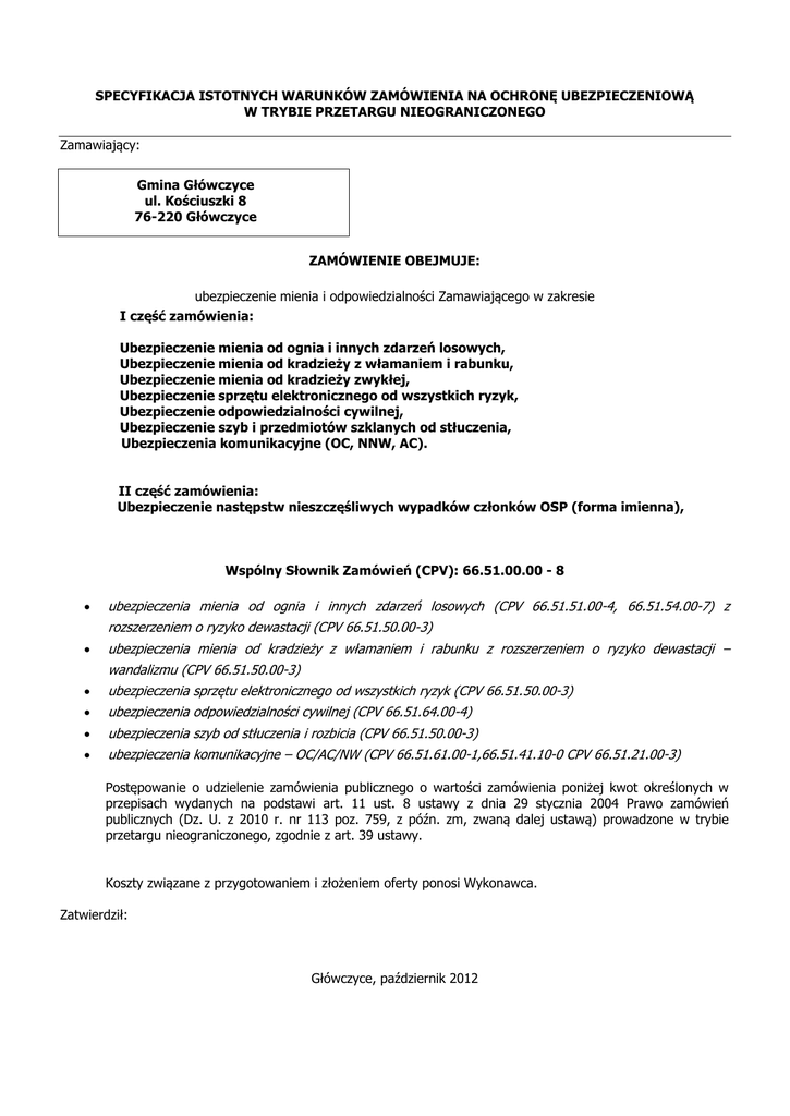 SPECYFIKACJA ISTOTNYCH WARUNKÓW ZAMÓWIENIA NA OCHRONĘ UBEZPIECZENIOWĄ W TRYBIE PRZETARGU NIEOGRANICZONEGO Zamawiający: Gmina Główczyce ul. Kościuszki 8 76-220 Główczyce ZAMÓWIENIE OBEJMUJE: ubezpieczenie mienia i odpowiedzialności Zamawiającego w zakresie I część zamówienia: Ubezpieczenie mienia od ognia i innych zdarzeń losowych, Ubezpieczenie mienia od kradzieży z włamaniem i rabunku, Ubezpieczenie mienia od kradzieży zwykłej, Ubezpieczenie sprzętu elektronicznego od wszystkich ryzyk, Ubezpieczenie odpowiedzialności cywilnej, Ubezpieczenie szyb i przedmiotów szklanych od stłuczenia, Ubezpieczenia komunikacyjne (OC, NNW, AC). II część zamówienia: Ubezpieczenie następstw nieszczęśliwych wypadków członków OSP (forma imienna), Wspólny Słownik Zamówień (CPV): 66.51.00.00 - 8 ubezpieczenia mienia od ognia i innych zdarzeń losowych (CPV 66.51.51.00-4, 66.51.54.00-7) z rozszerzeniem o ryzyko dewastacji (CPV 66.51.50.00-3) ubezpieczenia mienia od kradzieży z włamaniem i rabunku z rozszerzeniem o ryzyko dewastacji – wandalizmu (CPV 66.51.50.00-3) ubezpieczenia sprzętu elektronicznego od wszystkich ryzyk (CPV 66.51.50.00-3) ubezpieczenia odpowiedzialności cywilnej (CPV 66.51.64.00-4) ubezpieczenia szyb od stłuczenia i rozbicia (CPV 66.51.50.00-3) ubezpieczenia komunikacyjne – OC/AC/NW (CPV 66.51.61.00-1,66.51.41.10-0 CPV 66.51.21.00-3) Postępowanie o udzielenie zamówienia publicznego o wartości zamówienia poniżej kwot określonych w przepisach wydanych na podstawi art. 11 ust. 8 ustawy z dnia 29 stycznia 2004 Prawo zamówień publicznych (Dz. U. z 2010 r. nr 113 poz. 759, z późn. zm, zwaną dalej ustawą) prowadzone w trybie przetargu nieograniczonego, zgodnie z art. 39 ustawy. Koszty związane z przygotowaniem i złożeniem oferty ponosi Wykonawca. Zatwierdził: Główczyce, październik 2012 2 Zawartość Specyfikacji istotnych warunków zamówienia: (1) Nazwa i adres Zamawiającego, (2) Tryb udzielania zamówienia, (3) Opis przedmiotu zamówienia (3.1) Opis części zamówienia, jeżeli Zamawiający dopuszcza składanie ofert częściowych (3.2) Informacja o przewidywanych zamówieniach uzupełniających (4) Termin wykonania zamówienia, (5) Opis warunków udziału w postępowaniu oraz opis sposobu dokonywania oceny spełniania tych warunków, (6) Wykaz oświadczeń lub dokumentów, jakie mają dostarczyć wykonawcy w celu potwierdzenia spełnienia warunków udziału w postępowaniu, (7) Informacja o sposobie porozumiewania się Zamawiającego z wykonawcami oraz przekazywania oświadczeń lub dokumentów, a także wskazanie osób uprawnionych do porozumiewania się z wykonawcami (7.1) adres poczty elektronicznej lub strony internetowej Zamawiającego, (7.2) Opis sposobu udzielania wyjaśnień dotyczących specyfikacji istotnych warunków zamówienia oraz oświadczenie, czy zamierza się zwołać zebranie wykonawców, (8) Wymagania dotyczące wadium, (9) Termin związania ofertą, (10) Opis sposobu przygotowania ofert, (11) Miejsce oraz termin składania i otwarcia ofert, (12) Opis sposobu obliczenia ceny, (12.1) Informacje dotyczące walut obcych, w jakich mogą być prowadzone rozliczenia między Zamawiającym a wykonawcą, (12.2) Czynności wykonywane przy otwarciu i ocenie ofert, (13) Opis kryteriów, którymi Zamawiający będzie się kierował przy wyborze oferty, wraz z podaniem znaczenia tych kryteriów i sposobu oceny ofert, (14) Informacja o formalnościach, jakie powinny zostać dopełnione po wyborze oferty w celu zawarcia umowy w sprawie zamówienia publicznego, (15) Wymagania dotyczące zabezpieczenia należytego wykonania umowy, (16) Istotne dla stron postanowienia, które zostaną wprowadzone do treści zawieranej umowy, w sprawie zamówienia publicznego, wzór umowy, warunki zmiany umowy, (17) Pouczenie o środkach ochrony prawnej przysługujących wykonawcy w toku postępowania o udzielenie zamówienia. 1. NAZWA ORAZ ADRES ZAMAWIAJĄCEGO Gmina Główczyce ul. Kościuszki 8, 76-220 Główczyce – powiat Słupski, woj. Pomorskie, tel.: (059) 811 60 10, fax: (059) 811 61 59, reprezentowana przez Wójta Gminy. 2. TRYB UDZIELENIA ZAMÓWIENIA Postępowanie o udzielenie zamówienia publicznego prowadzone jest w trybie przetargu nieograniczonego na podstawie ustawy z dnia 29 stycznia 2004 roku Prawo Zamówień Publicznych (tekst jednolity Dz.U. z 2010r., Nr 113, poz. 759 z późn. zm). Postępowanie dotyczy udzielenia zamówienia publicznego na usługę o wartości nie przekraczającej kwoty określonej w przepisach wydanych na podstawie art. 11 ust. 8 ustawy Prawo zamówień publicznych 3. OPIS PRZEDMIOTU ZAMÓWIENIA Przedmiot zamówienia obejmuje ubezpieczenie mienia i odpowiedzialności Zamawiającego w zakresie ubezpieczenia mienia od ognia i innych zdarzeń losowych, ubezpieczenia mienia od kradzieży z włamaniem i rabunku, ubezpieczenia mienia od kradzieży zwykłej, ubezpieczenia sprzętu elektronicznego od wszystkich ryzyk, ubezpieczenia odpowiedzialności cywilnej, ubezpieczenia szyb od stłuczenia, ubezpieczenia następstw nieszczęśliwych wypadków członków OSP (forma imienna), ubezpieczeń komunikacyjnych w następujących jednostkach organizacyjnych: 1. Urząd Gminy, ul. Kościuszki 8, 76-220 Główczyce NIP: 8392936461 3 REGON: 000543083 2. Gminny Ośrodek Kultury w Główczycach ul. Kościuszki 15, 76-220 Główczyce NIP: 8392580320 REGON: 770983153 3. Ośrodek Pomocy Społecznej w Główczycach ul. Słupska 21, 76-220 Główczyce NIP: 839-17-69-475 REGON: 885311584 4. Zespół Szkół w Pobłociu Pobłocie 31, 76-220 Główczyce NIP: 839-20-96-825 REGON: 220619568 5. Zespół Szkół w Stowięcinie Stowięcino 37, 76-220 Główczyce NIP: 839-20-95-949 REGON: 220619440 6. Zespół Szkół Ogólnokształcących w Główczycach ul. Szkolna 1, 76-220 Główczyce NIP: 839-29-02-309 REGON: 771627839 7. Zespół Szkolno- Przedszkolny w Główczycach Ul. 22 Lipca 16, 76-220 Główczyce NIP: 839-28-15-898 REGON: 0005