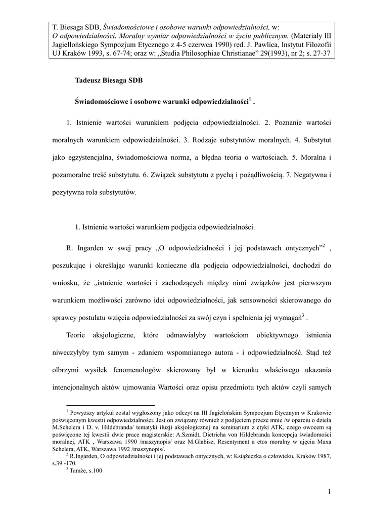 T. Biesaga SDB, Świadomościowe i osobowe warunki odpowiedzialności, w: O odpowiedzialności. Moralny wymiar odpowiedzialności w życiu publicznym. (Materiały III Jagiellońskiego Sympozjum Etycznego z 4-5 czerwca 1990) red. J. Pawlica, Instytut Filozofii UJ Kraków 1993, s. 67-74; oraz w: „Studia Philosophiae Christianae” 29(1993), nr 2; s. 27-37 Tadeusz Biesaga SDB Świadomościowe i osobowe warunki odpowiedzialności1 . 1. Istnienie wartości warunkiem podjęcia odpowiedzialności. 2. Poznanie wartości moralnych warunkiem odpowiedzialności. 3. Rodzaje substytutów moralnych. 4. Substytut jako egzystencjalna, świadomościowa norma, a błędna teoria o wartościach. 5. Moralna i pozamoralne treść substytutu. 6. Związek substytutu z pychą i pożądliwością. 7. Negatywna i pozytywna rola substytutów. 1. Istnienie wartości warunkiem podjęcia odpowiedzialności. R. Ingarden w swej pracy „O odpowiedzialności i jej podstawach ontycznych”2 , poszukując i określając warunki konieczne dla podjęcia odpowiedzialności, dochodzi do wniosku, że „istnienie wartości i zachodzących między nimi związków jest pierwszym warunkiem możliwości zarówno idei odpowiedzialności, jak sensowności skierowanego do sprawcy postulatu wzięcia odpowiedzialności za swój czyn i spełnienia jej wymagań3 . Teorie aksjologiczne, które odmawiałyby wartościom obiektywnego istnienia niweczyłyby tym samym - zdaniem wspomnianego autora - i odpowiedzialność. Stąd też olbrzymi wysiłek fenomenologów skierowany był w kierunku właściwego ukazania intencjonalnych aktów ujmowania Wartości oraz opisu przedmiotu tych aktów czyli samych 1 Powyższy artykuł został wygłoszony jako odczyt na III Jagielońskim Sympozjum Etycznym w Krakowie poświęconym kwestii odpowiedzialności. Jest on związany również z podjęciem przeze mnie /w oparciu o dzieła M.Schelera i D. v. Hildebranda/ tematyki iluzji aksjologicznej na seminarium z etyki ATK, czego owocem są poświęcone tej kwestii dwie prace magisterskie: A.Szmidt, Dietricha von Hildebranda koncepcja świadomości moralnej, ATK , Warszawa 1990 /maszynopis/ oraz M.Glabisz, Resentyment a etos moralny w ujęciu Maxa Schelera, ATK, Warszawa 1992 /maszynopis/. 2 R.Ingarden, O odpowiedzialności i jej podstawach ontycznych, w: Książeczka o człowieku, Kraków 1987, s.39 -170. 3 Tamże, s.100 1 T. Biesaga SDB, Świadomościowe i osobowe warunki odpowiedzialności, w: O odpowiedzialności. Moralny wymiar odpowiedzialności w życiu publicznym. (Materiały III Jagiellońskiego Sympozjum Etycznego z 4-5 czerwca 1990) red. J. Pawlica, Instytut Filozofii UJ Kraków 1993, s. 67-74; oraz w: „Studia Philosophiae Christianae” 29(1993), nr 2; s. 27-37 wartości, w tym szczególnie wartości moralnych. Obrona fundamentów odpowiedzialności u tych myślicieli idzie w kierunku krytyki subiektywistycznych teorii wartości, w których wartości te, zdaniem np D.v. Hildebranda, zredukowane są w psychologizmie etycznym do: a/ fizjologicznych procesów cielesnych /W. Jamesa teorii uczuć/, bądź do przeżyć psychicznych, gdzie traktując wartość jako obiektywizację przeżyć przyjemności /M.Schick, G.Santayana/, bądż jako ekspresję uczuć /A.Ayer/, bądź też w socjologizmie etycznym traktuje się je jako: a/ obiektywizacja przesądów, przekonań, wierzeń społeczeństwa czy też wprost - wynik umowy społecznej /E.Durkheim, Levy-Bruhl/4 . Na terenie subiektywistycznych teorii wartości trudno mówić o odpowiedzialności we właściwym sensie. „Jeżeli wartości byłyby jedynie „subiektywne”, jeśli byłyby /.../ iluzjami odpowiednio przeżywających ludzi/.../ to - stwierdza R.Ingarden - nie byłoby też żadnego uprawnienia, aby pociągnąć kogoś do odpowiedzialności”5 . 2.Poznanie wartości moralnych warunkiem odpowiedzialności. Oprócz wymienionej ontologicznej czy ontycznej podstawy odpowiedzialności, fenomenolodzy badają obszernie epistemologiczne a nawet antropologiczne warunki tej moralnej rzeczywistości, a mianowicie poznanie wartości moralnych i wymagany do tego odpowiedni status moralny osoby poznającej. W tym względzie R. Ingarden zaznaczył, że człowiek przy podejmowaniu odpowiedzialności „przede wszystkim musi mieć zdolność jasnego uchwytywania wartości pozytywnych i negatywnych, czułe sumienie, by móc jasno rozpoznać wobec siebie samego ewentualną wartość negatywną już zaczętego i dlań pozornie wartościowego działania. Musi także posiadać silę do zwalczania własnych 4 Obszerniejsza krytyka etyki subiektywistycznej dokonana przezD.v.Hildebranda zaprezentowana jest w: T.Biesaga, Dietricha von Hildebranda epistemologiczno-onologiczne podstawy etyki, Lublin1989, s.135-148. 2 T. Biesaga SDB, Świadomościowe i osobowe warunki odpowiedzialności, w: O odpowiedzialności. Moralny wymiar odpowiedzialności w życiu publicznym. (Materiały III Jagiellońskiego Sympozjum Etycznego z 4-5 czerwca 1990) red. J. Pawlica, Instytut Filozofii UJ Kraków 1993, s. 67-74; oraz w: „Studia Philosophiae Christianae” 29(1993), nr 2; s. 27-37 skłonności lub pożądań i przeciwstawienia się przynętom czy pokusom”6 . Bezpośrednie intuicyjne ujęcie wartości /emocjonalne u M.Schelera czy egzystencjalno-kontemplacyjne u d.v.Hildebranda/ staje się warunkiem koniecznym podjęcia odpowiedzialności moralnej. Pomijając bogaty i wnikliwy opis aktów ujmowania wartości, chcę zając się niektórymi czynnikami, które zniekształcają lub uniemożliwiają poznanie i kierowanie się wartościami moralnymi a tym samym deformują właściwie pojętą odpowiedzialność. Za M.Schelerem wynik zniekształcenia bezpośredniego kontaktu poznawczego z wartościami można nazwać ślepotą na wartości albo iluzją aksjologiczną /Wertblindheit, value blindness/. Kategoria iluzji aksjologicznej posłużyła mu za metodę odsłaniania czynników świadomościowych i osobowych /resentyment/ a nawet społe
