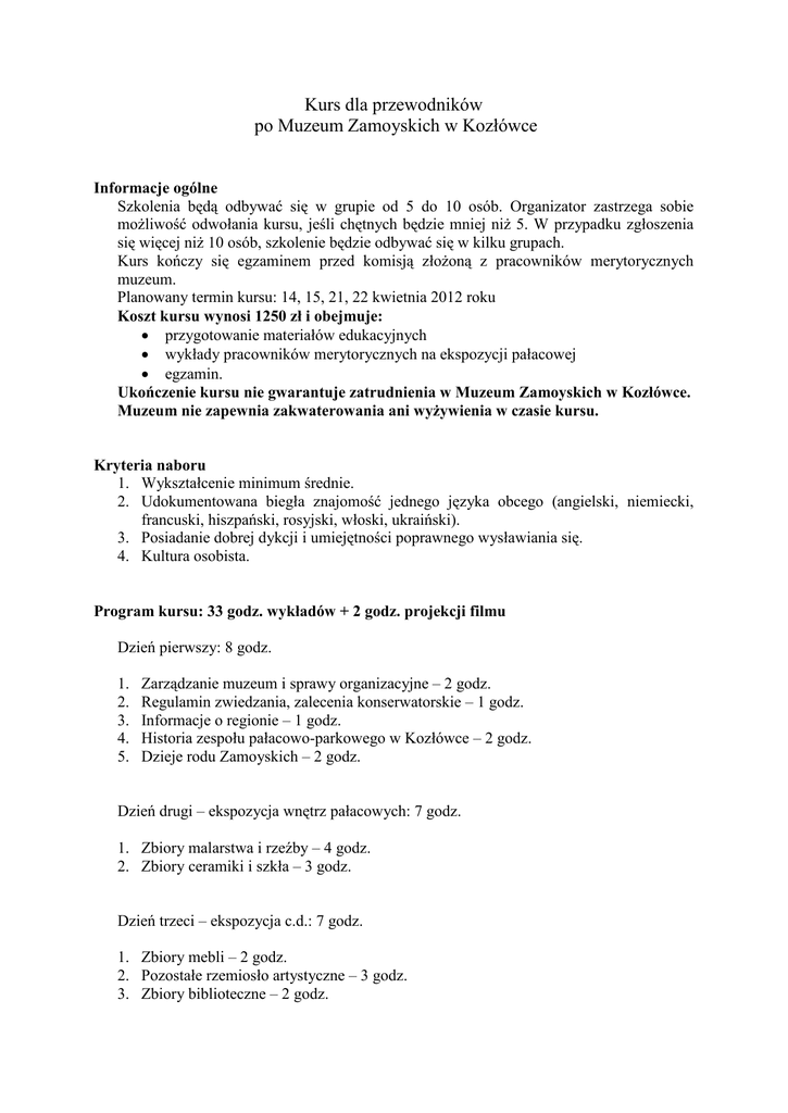 Kurs dla przewodników po Muzeum Zamoyskich w Kozłówce Informacje ogólne Szkolenia będą odbywać się w grupie od 5 do 10 osób. Organizator zastrzega sobie możliwość odwołania kursu, jeśli chętnych będzie mniej niż 5. W przypadku zgłoszenia się więcej niż 10 osób, szkolenie będzie odbywać się w kilku grupach. Kurs kończy się egzaminem przed komisją złożoną z pracowników merytorycznych muzeum. Planowany termin kursu: 14, 15, 21, 22 kwietnia 2012 roku Koszt kursu wynosi 1250 zł i obejmuje: • przygotowanie materiałów edukacyjnych • wykłady pracowników merytorycznych na ekspozycji pałacowej • egzamin. Ukończenie kursu nie gwarantuje zatrudnienia w Muzeum Zamoyskich w Kozłówce. Muzeum nie zapewnia zakwaterowania ani wyżywienia w czasie kursu. Kryteria naboru 1. Wykształcenie minimum średnie. 2. Udokumentowana biegła znajomość jednego języka obcego (angielski, niemiecki, francuski, hiszpański, rosyjski, włoski, ukraiński). 3. Posiadanie dobrej dykcji i umiejętności poprawnego wysławiania się. 4. Kultura osobista. Program kursu: 33 godz. wykładów + 2 godz. projekcji filmu Dzień pierwszy: 8 godz. 1. 2. 3. 4. 5. Zarządzanie muzeum i sprawy organizacyjne – 2 godz. Regulamin zwiedzania, zalecenia konserwatorskie – 1 godz. Informacje o regionie – 1 godz. Historia zespołu pałacowo-parkowego w Kozłówce – 2 godz. Dzieje rodu Zamoyskich – 2 godz. Dzień drugi – ekspozycja wnętrz pałacowych: 7 godz. 1. Zbiory malarstwa i rzeźby – 4 godz. 2. Zbiory ceramiki i szkła – 3 godz. Dzień trzeci – ekspozycja c.d.: 7 godz. 1. Zbiory mebli – 2 godz. 2. Pozostałe rzemiosło artystyczne – 3 godz. 3. Zbiory biblioteczne – 2 godz. Dzień czwarty – pozostałe obiekty zespołu pałacowo-parkowego: 7 + 2,5 godz. 1. Kaplica i teatralnia – 1 godz. 2. Park – 1 godz. 3. Wozownia – 2 godz. 4. Galeria socrealizmu – 3 godz. Projekcja PKF i „Ballady o prawdziwym kłamstwie” – 2 godz. Indywidualne konsultacje na ekspozycji – 4 godz. Możliwość towarzyszenia grupie podczas zwiedzania. Materiały edukacyjne 1. 2. 3. 4. Przewodnik ilustrowany J. Szczepaniak, Kozłówka Szczepaniak J., Socrealizm. Muzeum Zamoyskich w Kozłówce, Kozłówka 2003. Brzozowski A., Kozłówka w moich wspomnieniach, opr. G. Antoniuk, Kozłówka 2000; 5. Ilustrowany wykaz muzealiów w ekspozycji pałacowej wraz ze schematami rozmieszczenia. 6. Kserokopie opracowań i artykułów: • Dybała E., Biblioteka Zamoyskich w Kozłówce, [w:] Muzea – rezydencje w Polsce. Materiały sesji naukowej zorganizowanej w Muzeum Zamoyskich w Kozłówce 14–16 października 2004, Kozłówka 2004. • Jabłońska T., Kaplica pałacowa pod wezwaniem Zwiastowania NMP w Kozłówce, [w:] Lubartów i Ziemia Lubartowska, Lubartów 2003. • Janczewska-Sołomko K., Zbiór rolek pianolowych w Muzeum Zamoyskich w Kozłówce, [w:] Ziemiaństwo na Lubelszczyźnie. Materiały II sesji naukowej zorganizowanej w Muzeum Zamoyskich w Kozłówce 22–24 maja 2002, opr. R. Maliszewska, Kozłówka 2003. • Jaroszewski T.S., Pałac w Kozłówce, „Spotkania z Zabytkami” 1994, Nr 5. • Juszkiewicz B., Przebudowa zespołu pałacowego w Kozłówce w latach 1897–1911, [w:] Muzea – rezydencje w Polsce. Materiały sesji naukowej zorganizowanej w Muzeum Zamoyskich w Kozłówce 14–16 października 2004, Kozłówka 2004. • Kamiński Z.. Dzieje życia w pogoni za sztuką, Warszawa 1975. • Katalog zabytków sztuki w Polsce, t. VIII, z. 11: Dawny powiat lubartowski, opr. R. Brykowski, Warszawa 1976. • Kornacki K., Sześćdziesiąt lat minęło, [w:] Muzea – rezydencje w Polsce. Materiały sesji naukowej zorganizowanej w Muzeum Zamoyskich w Kozłówce 14–16 października 2004, Kozłówka 2004. • Kozaczka M., Działalność gospodarcza w ordynacji kozłowieckiej w okresie międzywojennym, [w:] Ziemiaństwo na Lubelszczyźnie. Materiały sesji naukowej zorganizowanej w Muzeum Zamoyskich w Kozłówce 8–9 czerwca 2000, opr. R. Maliszewska, Kozłówka 2001. • Libuchowa T., Pałac w Kozłówce, [w:] Studia i materiały lubelskie. Historia sztuki, Lublin 1963. • • • • • • Maj E., Trzy oblicza barokowych ogrodów pałacowych w Kozłówce, [w:] Muzea – rezydencje w Polsce. Materiały sesji naukowej zorganizowanej w Muzeum Zamoyskich w Kozłówce 14–16 października 2004, Kozłówka 2004. Muzeum Zamoyskich w Kozłówce. Raport 2006. Odorowski W., Historyzujące portrety Zamoyskich Józefa Buchbindera w Kozłówce, [w:] Portret. Funkcja – forma – symbol. Materiały Sesji Stowarzyszenia Historyków Sztuki, Toruń, grudzień 1986, Warszawa 1990. Szczepaniak J., Kozłówka. Pałac – Muzeum. Przewodnik, Kozłówka 1991. Szczepaniak J., Program ideowy Konstantego Zamoyskiego w pałacu w Kozłówce, [w:] Muzea – rezydencje w Polsce. Materiały sesji naukowej zorganizowanej w Muzeum Zamoyskich w Kozłówce 14–16 października 2004, Kozłówka 2004. A. Szczepaniak, Małżeństwo i śmierć Anny z Mycielskich Zamoyskiej [w:] Ziemiaństwo na Lubelszczyźnie III, Lublin 2008 Zalecana lektura uzupełniająca: • • • • • • • • • • • • • Niezwykły gość. Ksiądz Stefan Wyszyński u Jadwigi i Aleksandra Zamoyskich w Kozłówce, oprac. Grażyna Antoniuk, Róża Maliszewska, Kozłówka 2000. Szczepaniak A., Zbiór fotografii Konstantego Zamoyskiego, [w:] Ziemiaństwo na Lubelszczyźnie. Materiały sesji naukowej zorganizowanej w Muzeum Zamoyskich w Kozłówce 8–9 czerwca 2000, opr. R. Maliszewska, Kozłówka 2001. A. Szczepaniak, Powrót do Polski Konstantego Zamoyskiego w 1867 roku, [w:] Ziemiaństwo na Lubelszczyźnie IV. Ziemianie w podróży, T. II, Lublin 2010 A. Cholewianka-Kruszyńska, Piękna i dobra, Kozłówka 2008 Rzemiosło artystyczne w zbiorach Muzeum Zamoyskich w Kozłówce, opr. T. Marciszuk, Kozłówka 1997. K. Ajewski, Zbiory artystyczne i galeria muzealna ordynacji zamojskiej w Warszawie, Kozłówka 1997 K. Ajewski, Sta